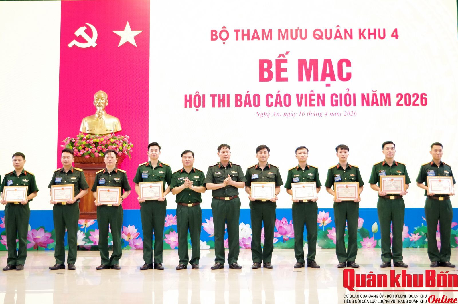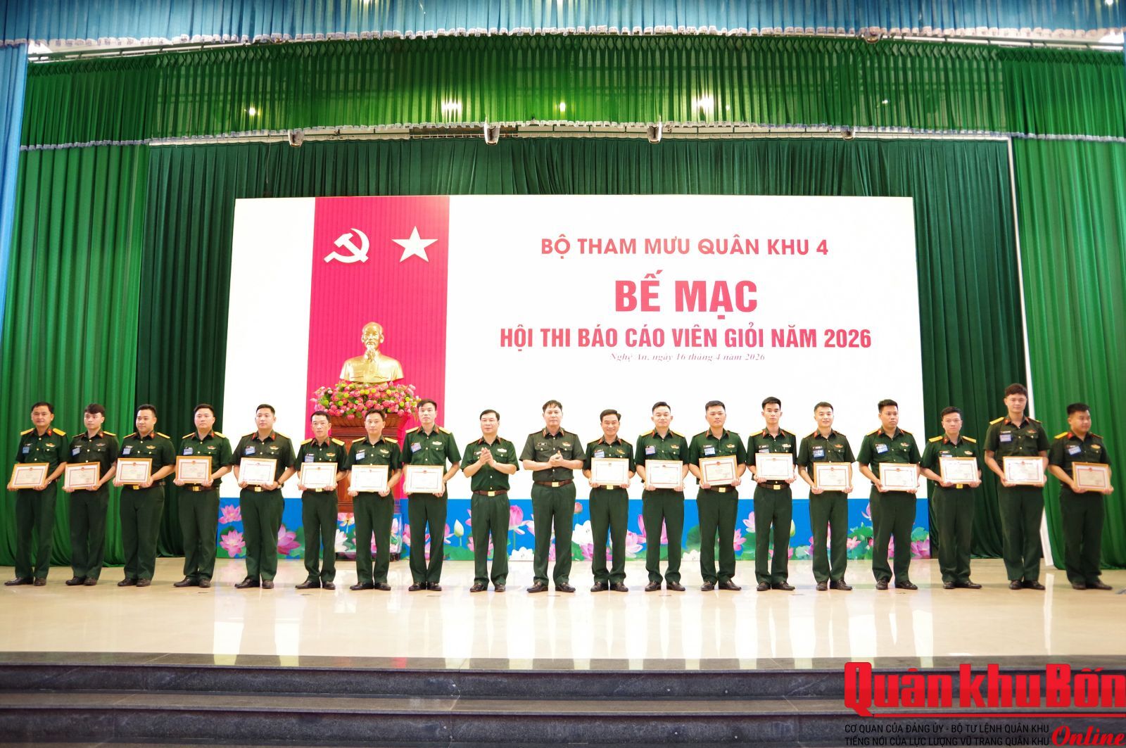 Trong hai ngày 15 và 16/4/2026, Bộ Tham mưu Quân khu 4 tổ chức Hội thi báo cáo viên giỏi năm 2026. Thiếu tướng Lê Văn Vỹ, Bí thư Đảng ủy Bộ Tham mưu, Phó Tham mưu trưởng Quân khu 4 dự và chỉ đạo hội thi.