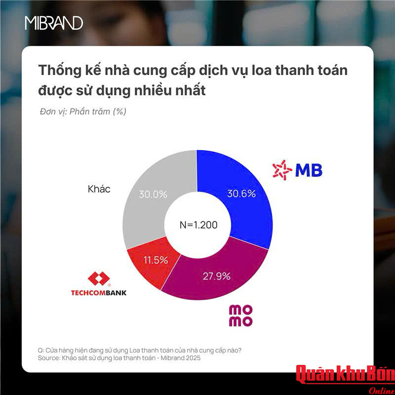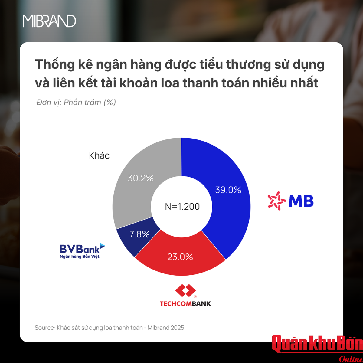Theo khảo sát mới nhất do Mibrand Việt Nam thực hiện cuối năm 2025, Ngân hàng TMCP Quân đội (MB) hiện là thương hiệu dẫn đầu thị trường loa thanh toán tại Việt Nam, đồng thời giữ vị trí Top 1 trong nhóm ngân hàng được hộ kinh doanh và tiểu thương lựa chọn đăng ký và sử dụng dịch vụ.