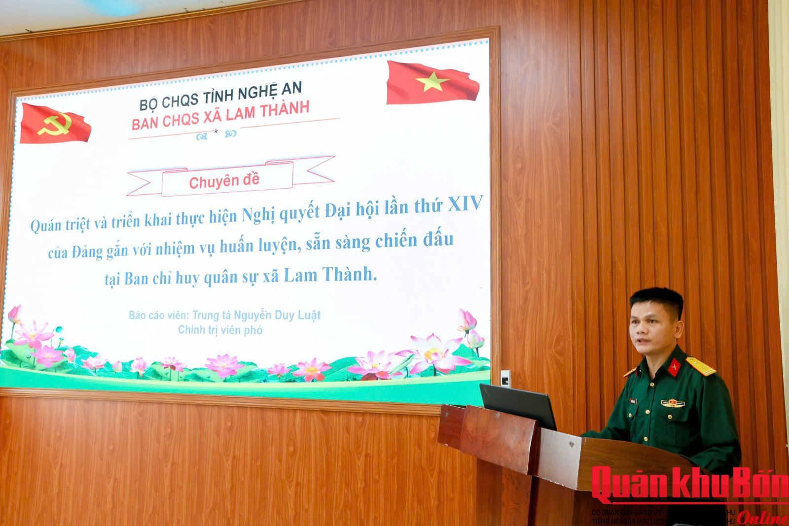 Phát biểu tại hội thi, Đại tá Nguyễn Văn An, Phó Bí thư Đảng ủy Quân sự tỉnh, Chính ủy Bộ CHQS tỉnh Nghệ An nhấn mạnh, đây là dịp đánh giá thực chất trình độ, năng lực đội ngũ cán bộ cơ sở; đồng thời tạo môi trường để cán bộ giao lưu, học hỏi, góp phần nâng cao chất lượng hoạt động báo cáo viên, tuyên truyền miệng ở đơn vị.