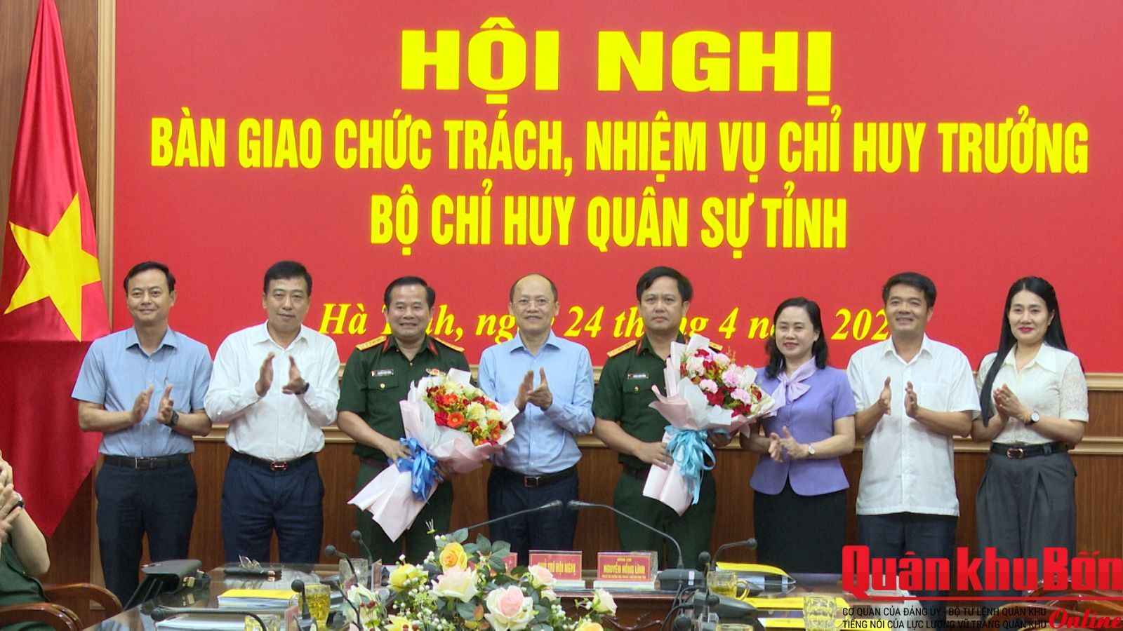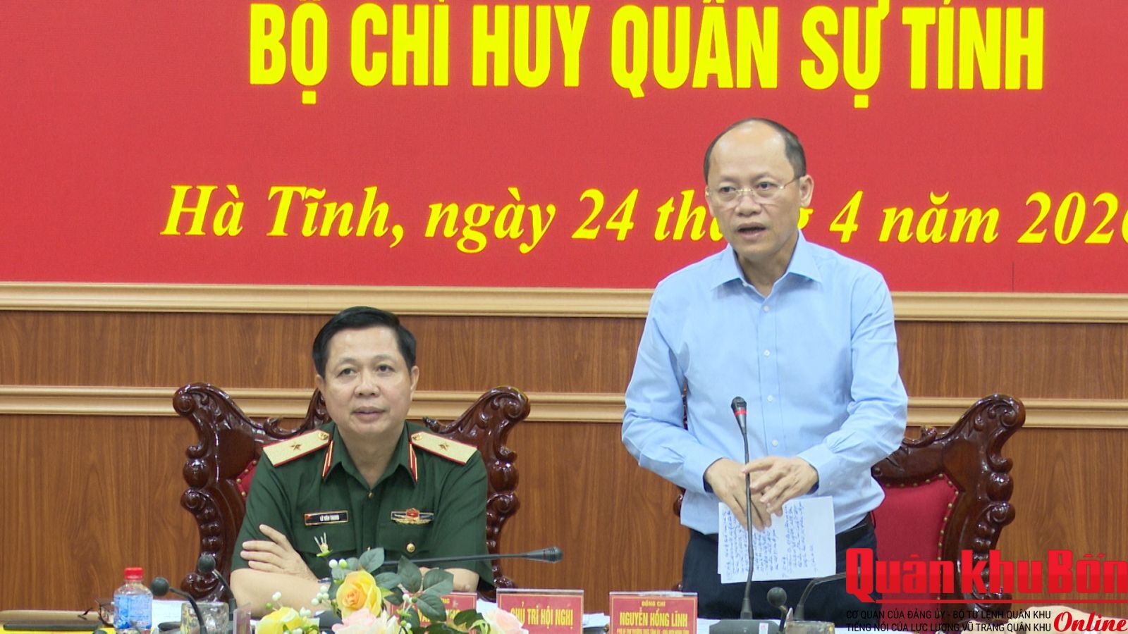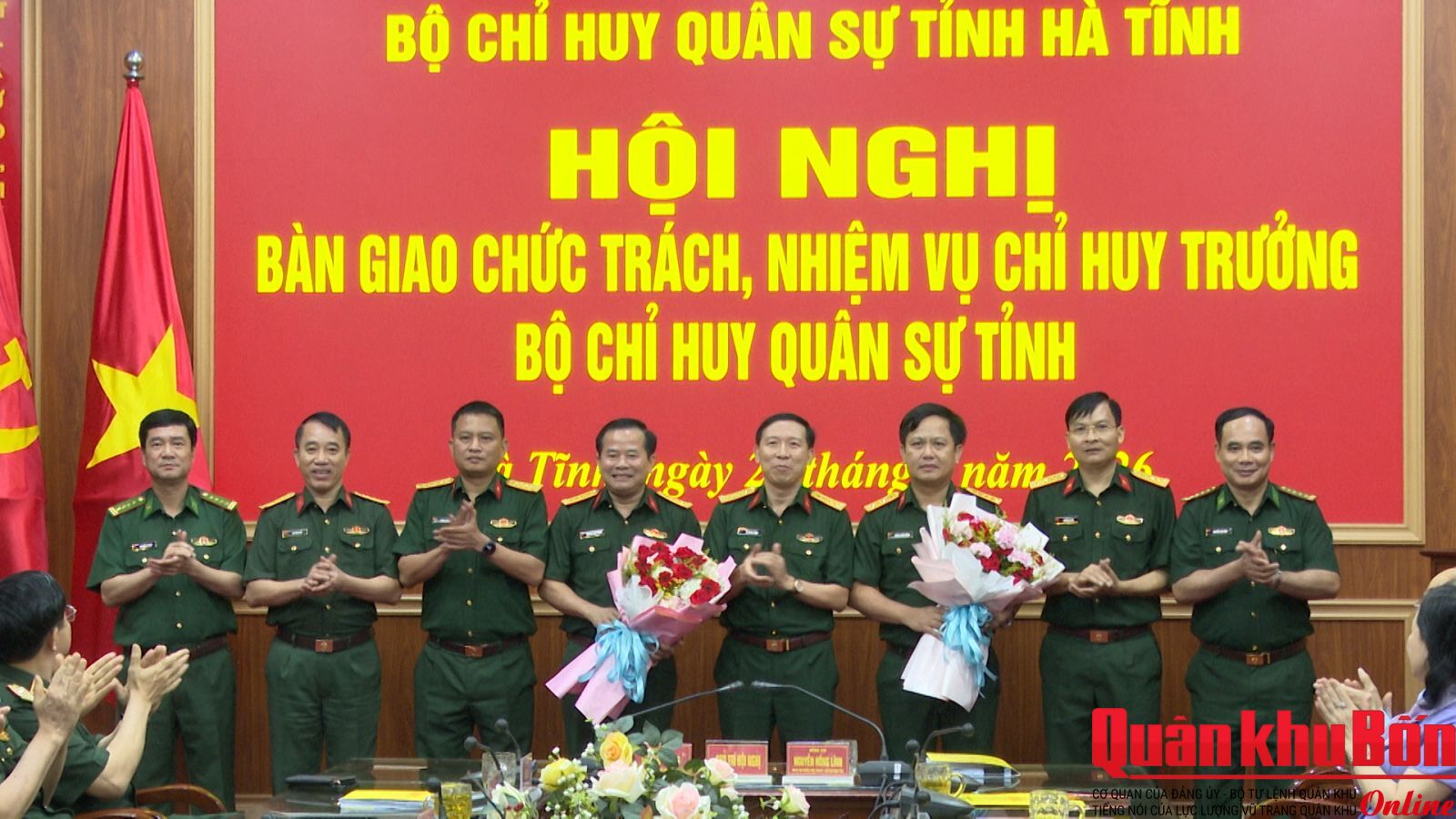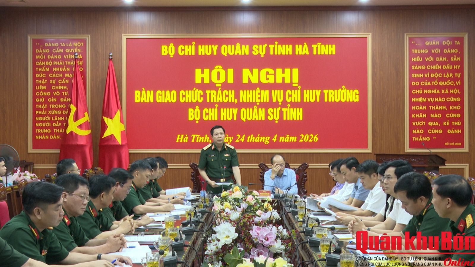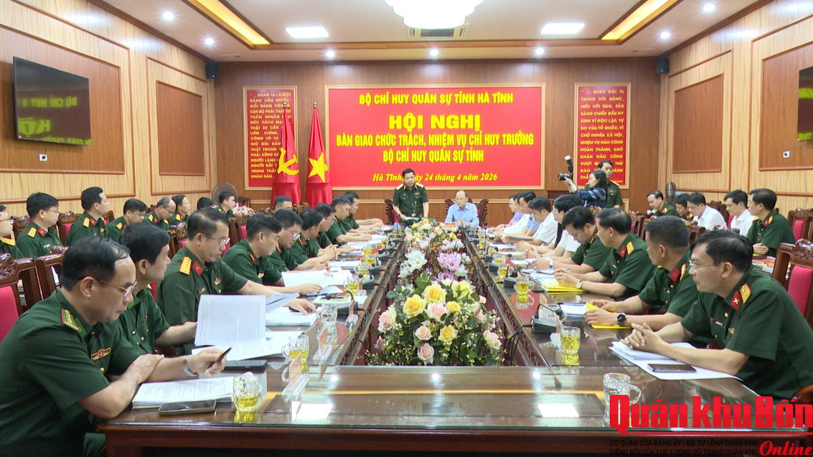 Chiều ngày 24/4/2026, Bộ Chỉ huy Quân sự (CHQS) tỉnh Hà Tĩnh tổ chức hội nghị bàn giao chức trách, nhiệm vụ Chỉ huy trưởng Bộ CHQS tỉnh Hà Tĩnh gữa Đại tá Nguyễn Xuân Thắng và Đại tá Hoàng Xuân Đông. Đồng chí Thiếu tướng Lê Văn Trung, Phó Chính ủy Quân khu 4; đồng chí Nguyễn Hồng Lĩnh, Phó Bí thư Thường trực Tỉnh ủy, Chủ tịch Hội đồng Nhân dân (HĐND) tỉnh Hà Tĩnh chủ trì hội nghị. Cùng dự hội nghị có các đồng chí đại diện lãnh đạo các Cơ quan Quân khu 4; các đồng chí Ủy viên Ban Thường vụ Tỉnh ủy Hà Tĩnh, lãnh đạo HĐND tỉnh Hà Tĩnh; các đồng chí Thường vụ Đảng ủy Bộ CHQS tỉnh Hà Tĩnh.