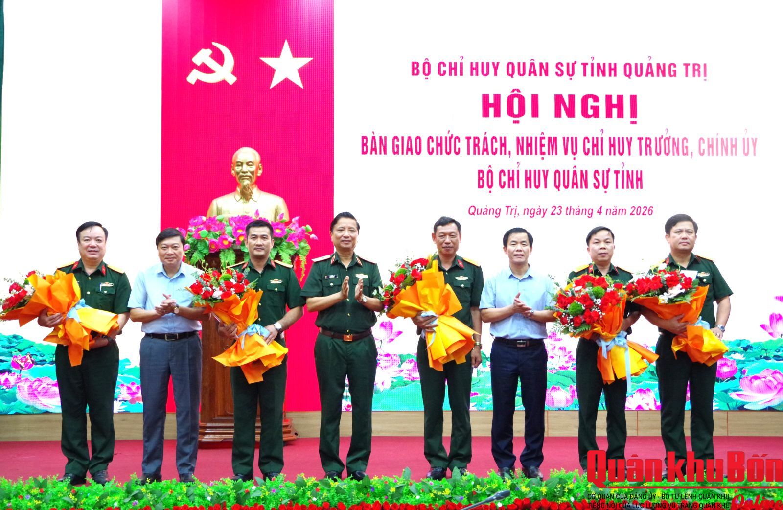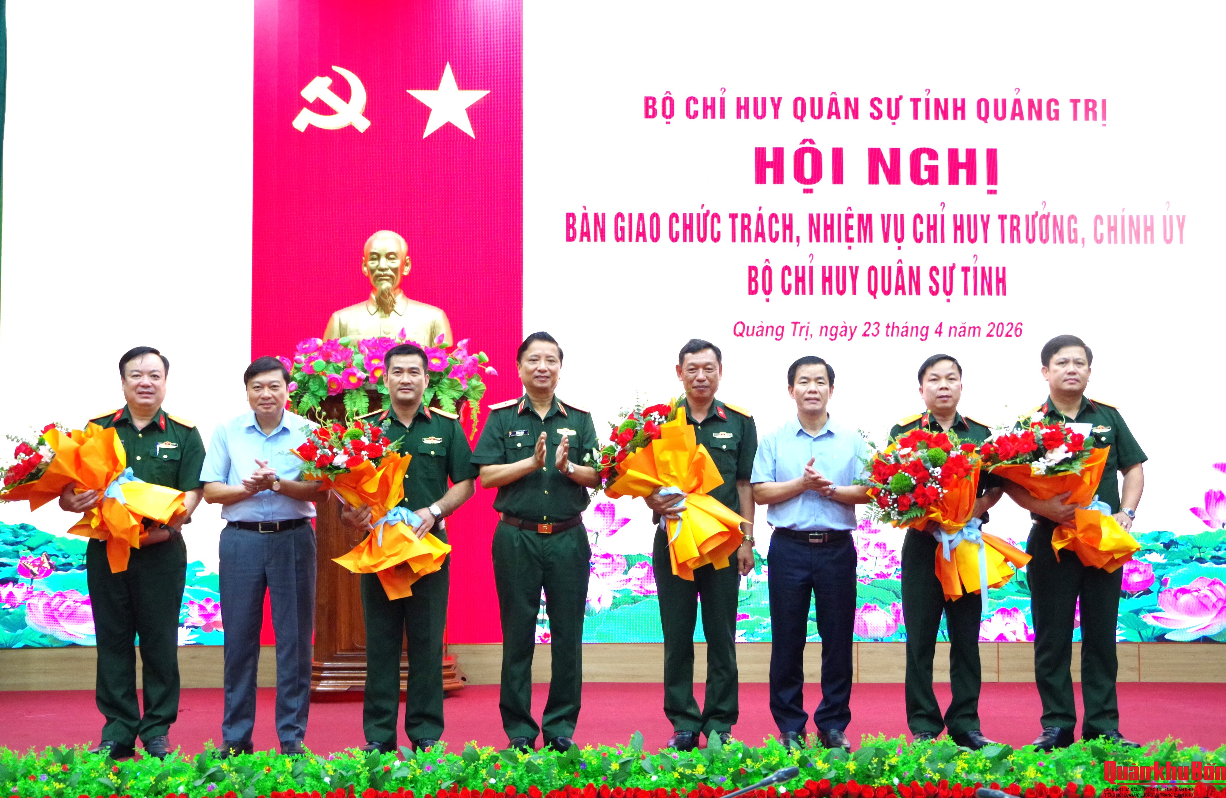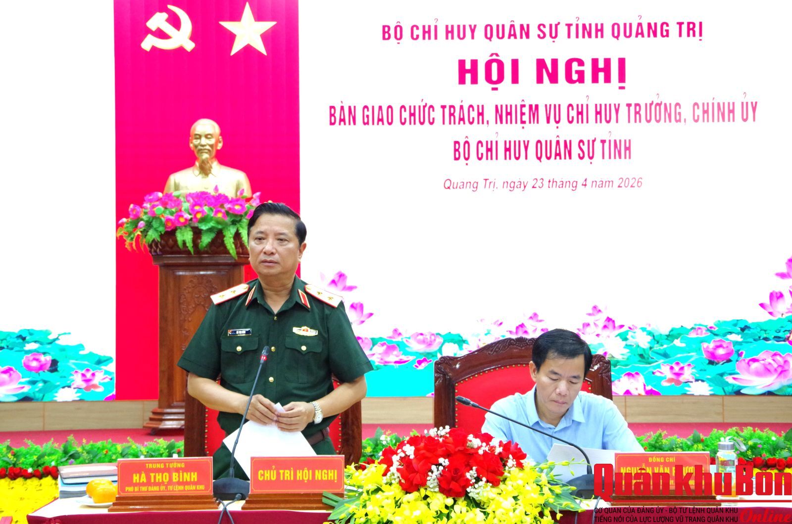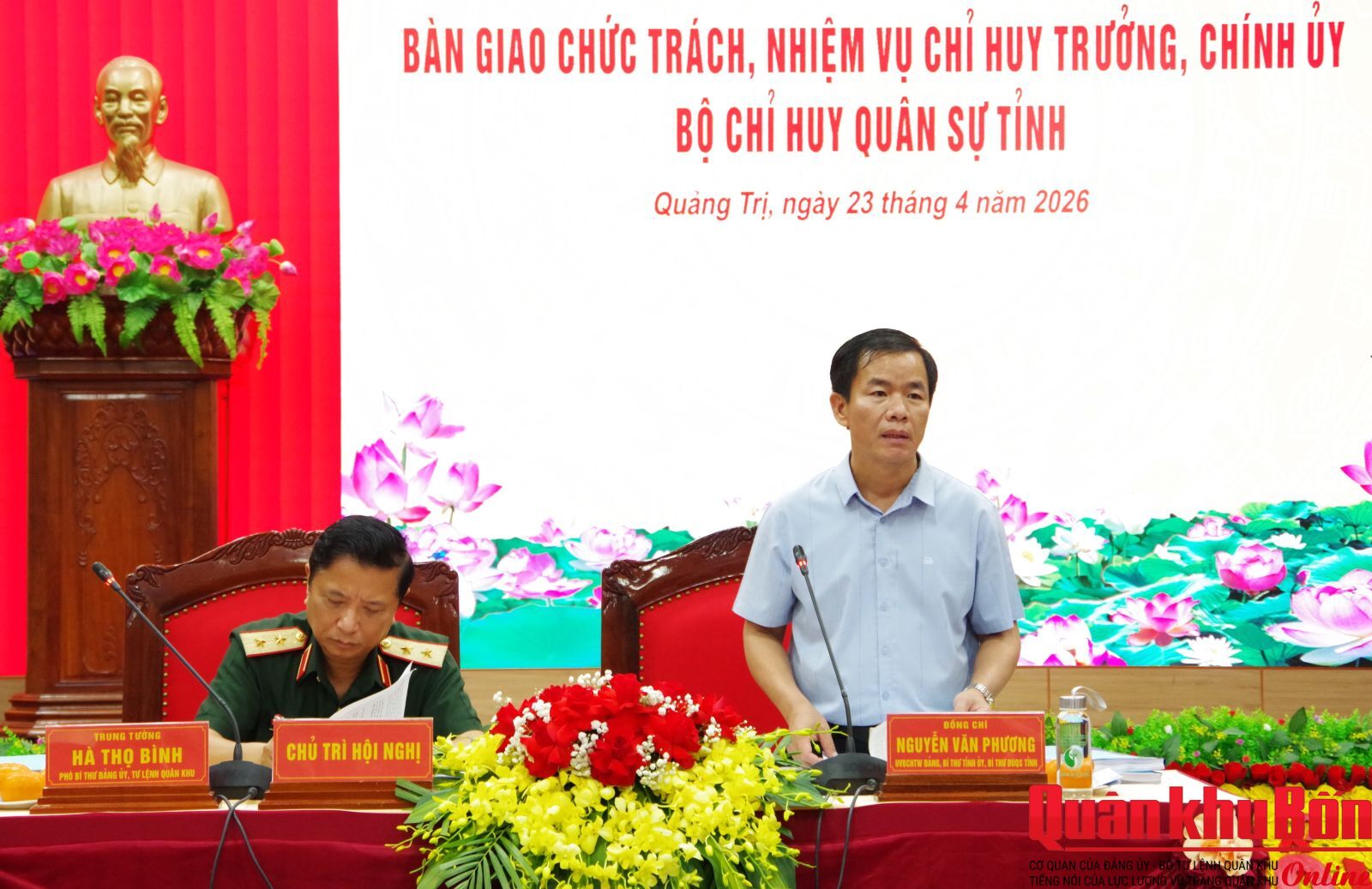 Chiều ngày 23/4/2026 Bộ Chỉ huy Quân sự (CHQS) tỉnh Quảng Trị đã tổ chức Hội nghị bàn giao chức trách, nhiệm vụ Chỉ huy trưởng và Chính ủy Bộ CHQS tỉnh. Trung tướng Hà Thọ Bình, Phó Bí thư Đảng ủy, Tư lệnh Quân khu 4 và đồng chí Nguyễn Văn Phương, Ủy viên Ban Chấp hành Trung ương Đảng, Bí thư Tỉnh ủy, Bí thư Đảng ủy Quân sự tỉnh Quảng Trị đồng chủ trì hội nghị. Thiếu tướng Phan Văn Sỹ, Phó Chủ nhiệm Chính trị Quân khu 4; Đại tá Nguyễn Hữu Đàn, Phó Tham mưu trưởng Quân khu 4; Đại tá Phạm Đức Tuấn, Chủ nhiệm Hậu cần – Kỹ thuật Quân khu 4; đồng chí Lê Hồng Vinh, Phó Bí thư Tỉnh ủy, Chủ tịch Ủy ban Nhân dân tỉnh Quảng Trị dự hội nghị.