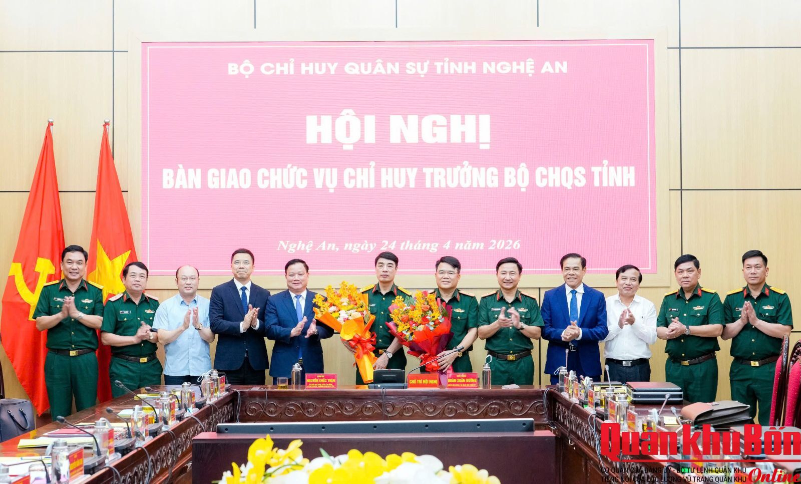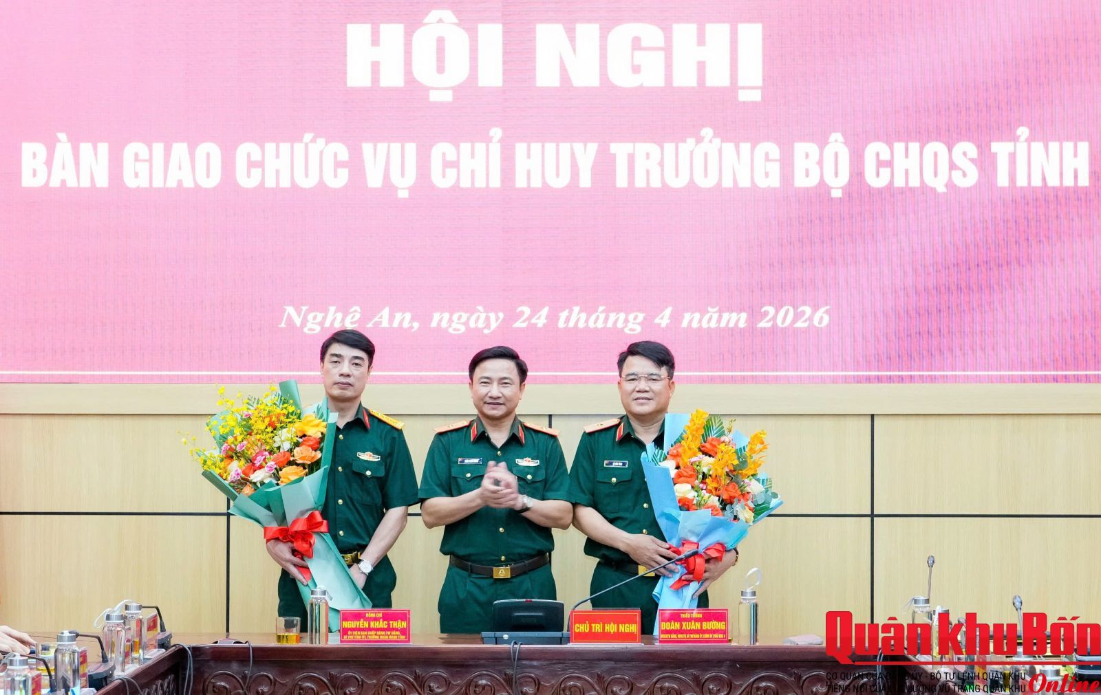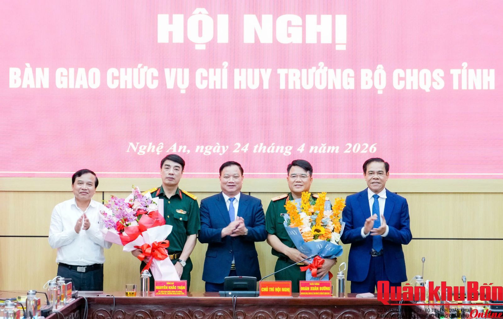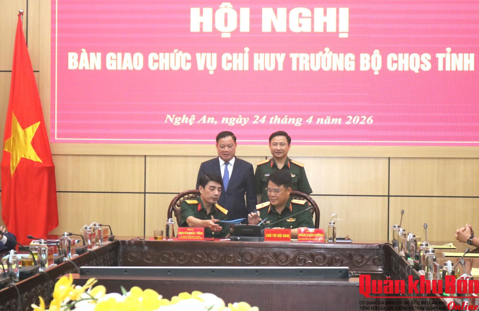 Chiều ngày 24/4/2026, dưới sự chủ trì của Thiếu tướng Đoàn Xuân Bường, Ủy viên Ban Chấp hành Trung ương Đảng, Bí thư Đảng ủy, Chính ủy Quân khu 4 và đồng chí Nguyễn Khắc Thận, Ủy viên Ban Chấp hành Trung ương Đảng, Bí thư Tỉnh ủy, Bí thư Đảng ủy Quân sự tỉnh Nghệ An. Bộ Chỉ huy Quân sự (CHQS) tỉnh Nghệ An đã tổ chức Hội nghị bàn giao chức vụ chỉ huy trưởng Bộ CHQS tỉnh.