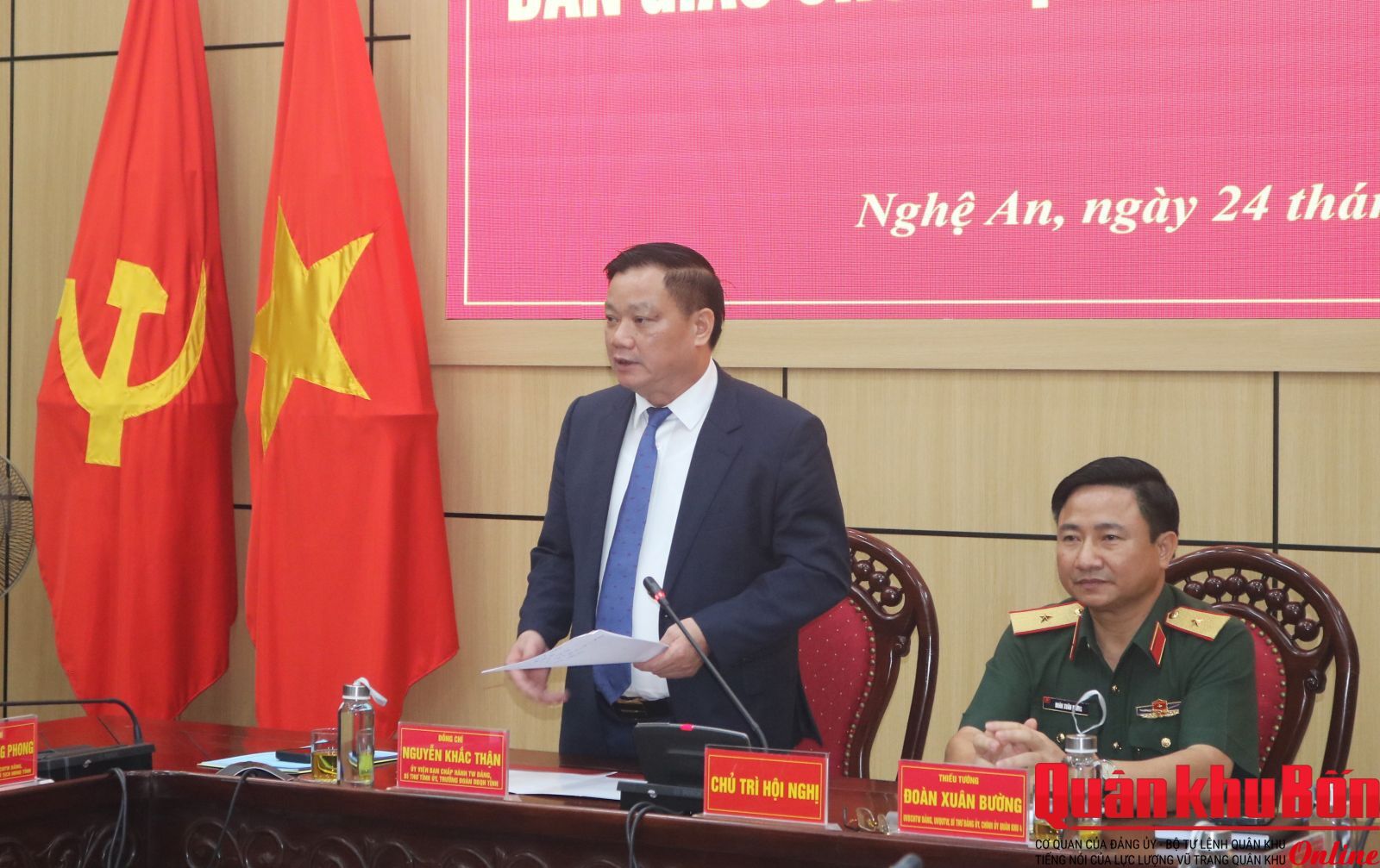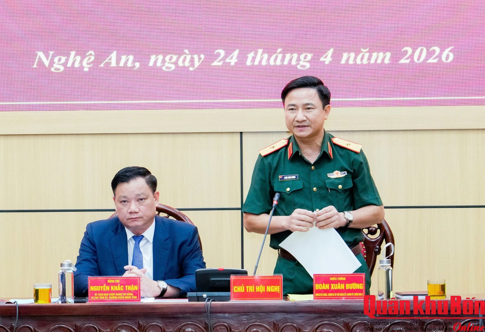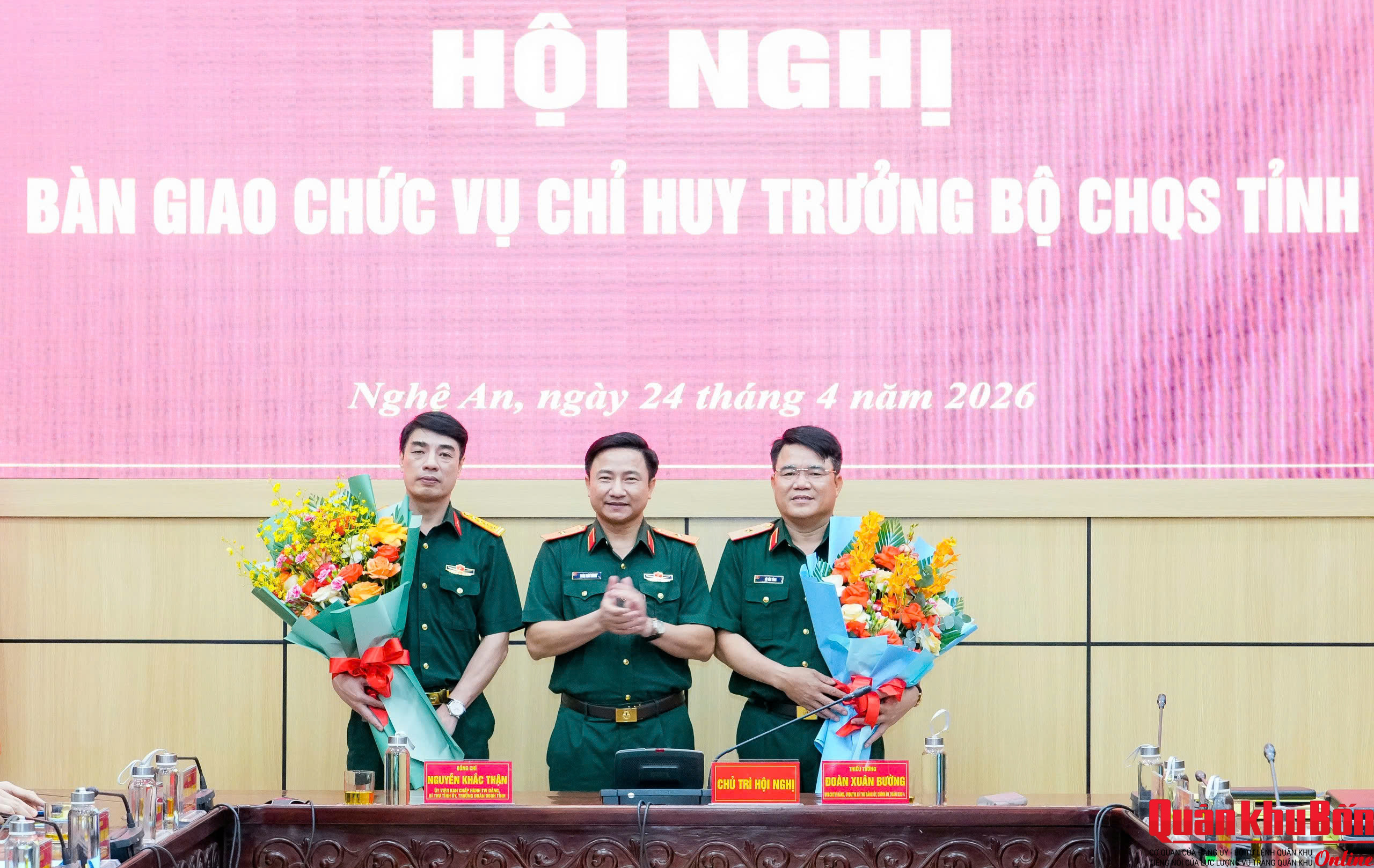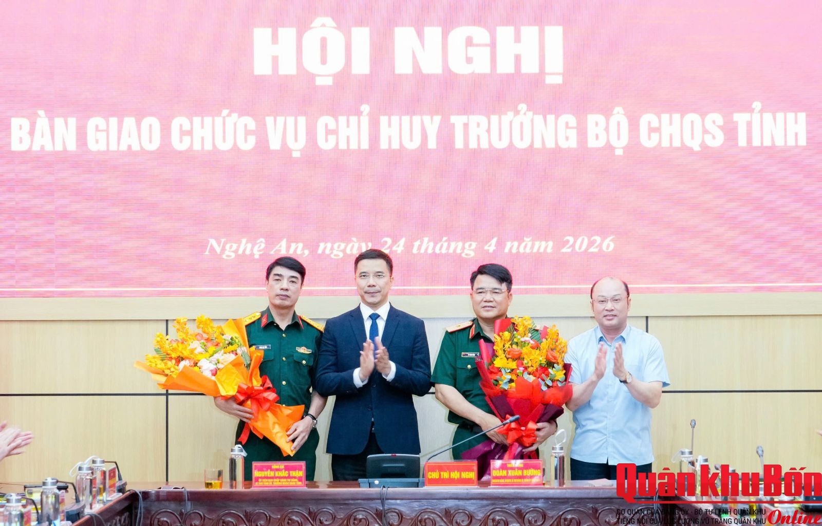 Chiều ngày 24/4/2026, dưới sự chủ trì của Thiếu tướng Đoàn Xuân Bường, Ủy viên Ban Chấp hành Trung ương Đảng, Bí thư Đảng ủy, Chính ủy Quân khu 4 và đồng chí Nguyễn Khắc Thận, Ủy viên Ban Chấp hành Trung ương Đảng, Bí thư Tỉnh ủy, Bí thư Đảng ủy Quân sự tỉnh Nghệ An. Bộ Chỉ huy Quân sự (CHQS) tỉnh Nghệ An đã tổ chức Hội nghị bàn giao chức vụ chỉ huy trưởng Bộ CHQS tỉnh.