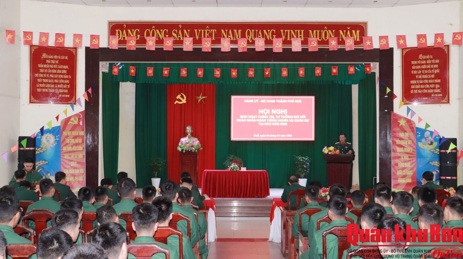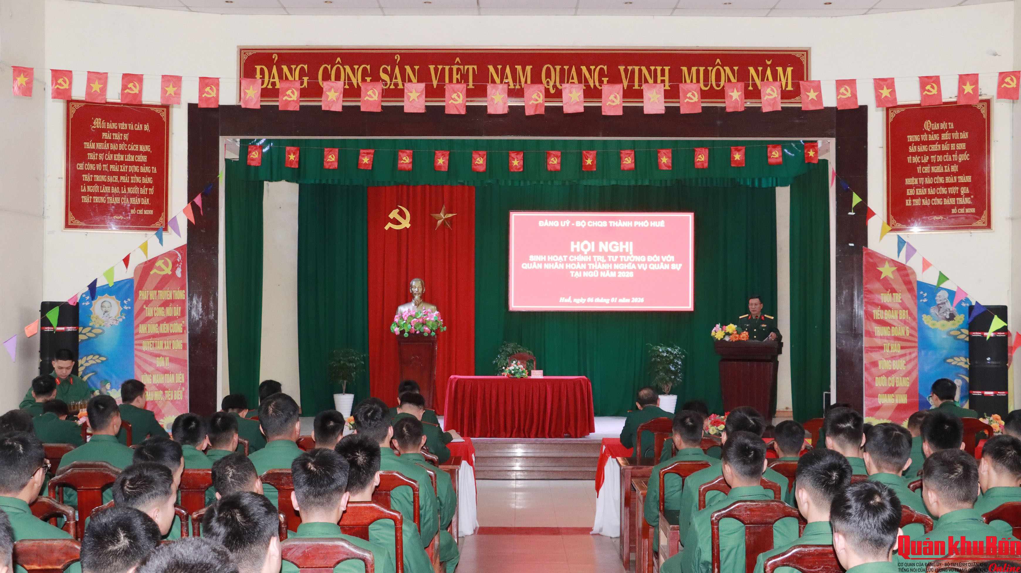 Nhằm kịp thời nắm chắc tâm tư, tình cảm và giải quyết những khó khăn, vướng mắc đối với hạ sĩ quan, binh sĩ, sáng ngày 06/01/2026, Đảng ủy, Bộ Chỉ huy Quân sự (CHQS) thành phố Huế tổ chức buổi sinh hoạt chính trị, tư tưởng đối với quân nhân hoàn thành nghĩa vụ quân sự tại ngũ năm 2026 tại Trung đoàn 6.