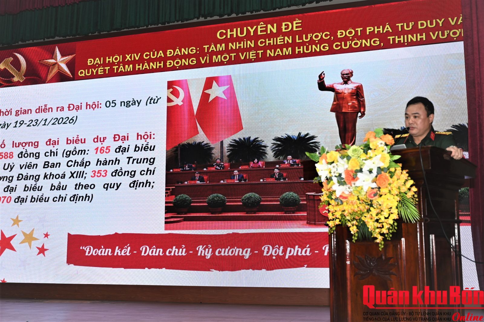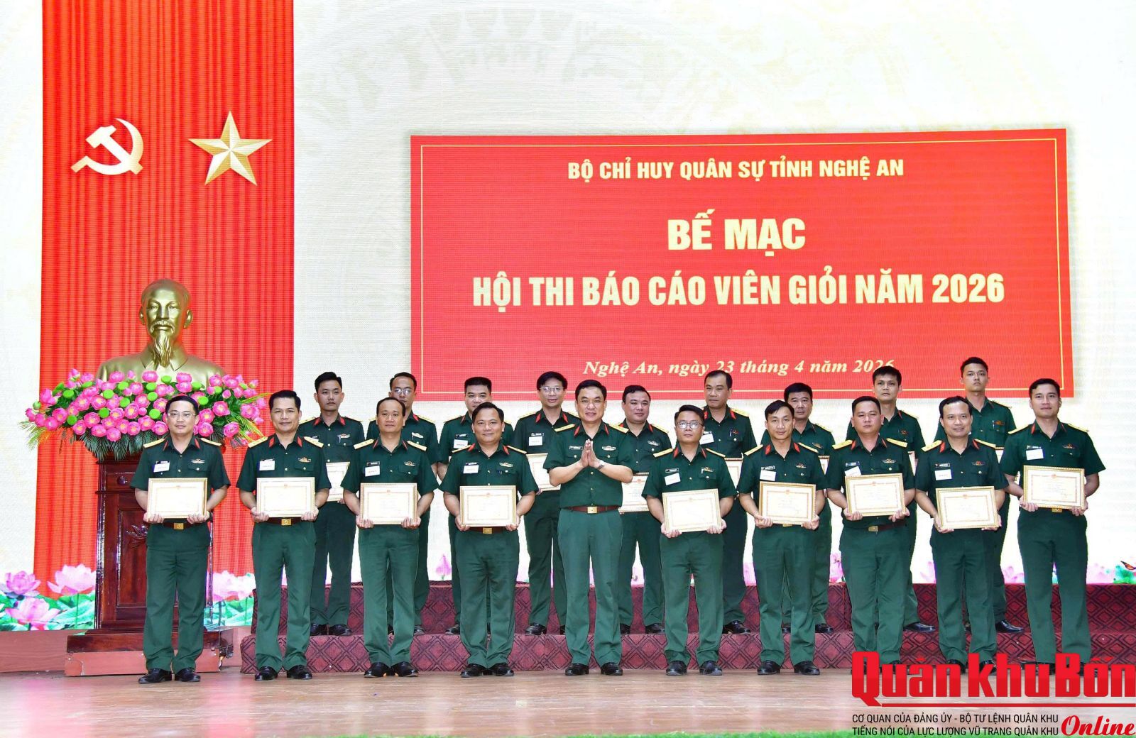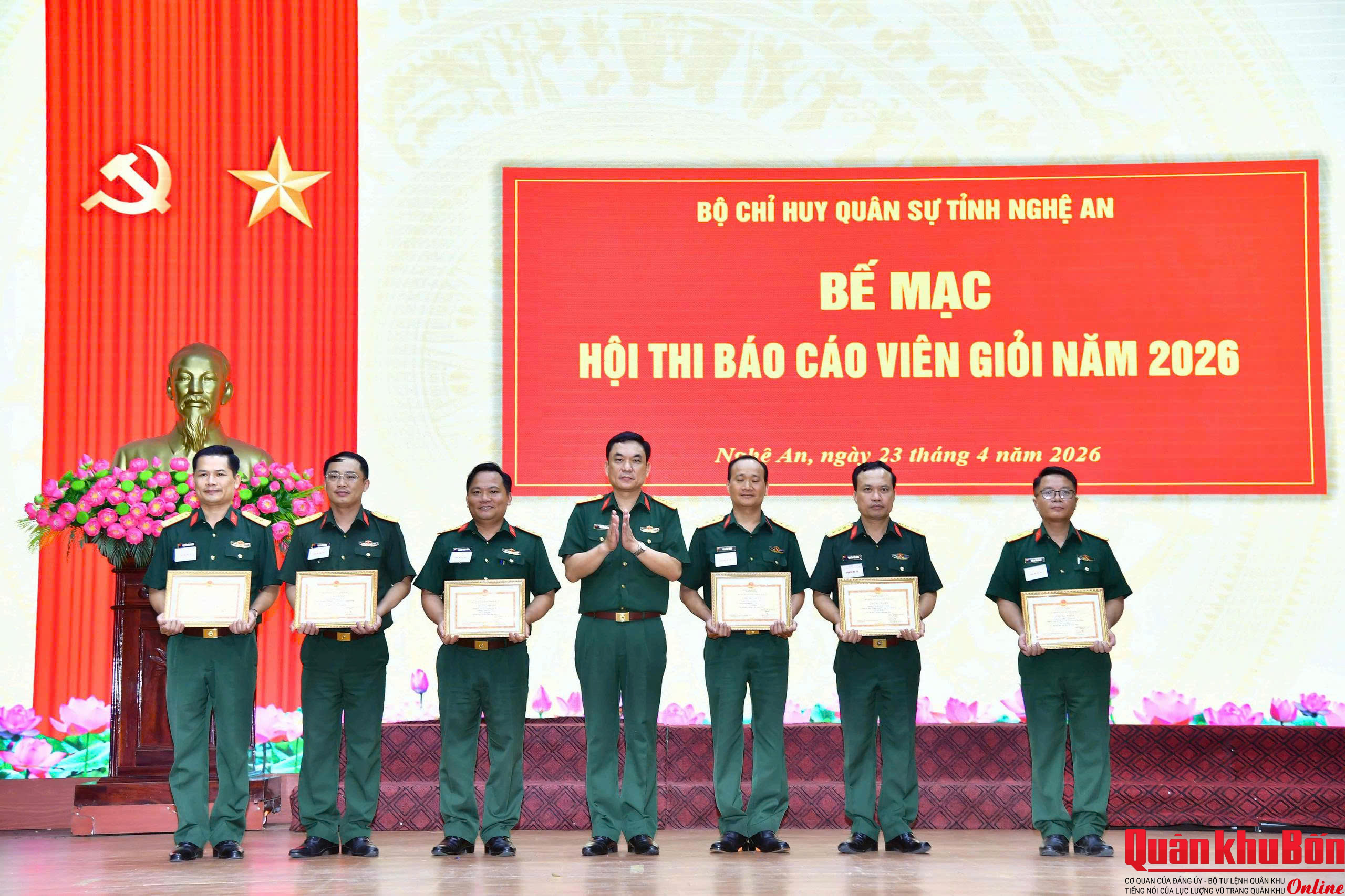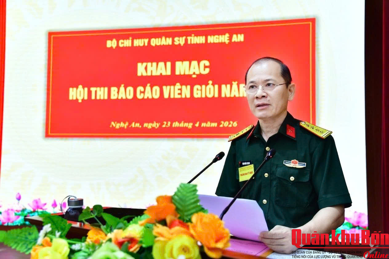 Ngày 23/4/2026, Bộ Chỉ huy Quân sự (CHQS) tỉnh Nghệ An đã tổ chức Hội thi báo cáo viên giỏi năm 2026. Thiếu tướng Phan Văn Sỹ, Phó Chủ nhiệm Chính trị Quân khu 4 dự, theo dõi, chỉ đạo Hội thi. Dự, theo dõi Hội thi có đại biểu Phòng Tuyên huấn Quân khu 4; Ban Tuyên giáo – Dân vận Tỉnh ủy Nghệ An và các đồng chí trong Thường vụ Đảng ủy, Bộ CHQS tỉnh Nghệ An.