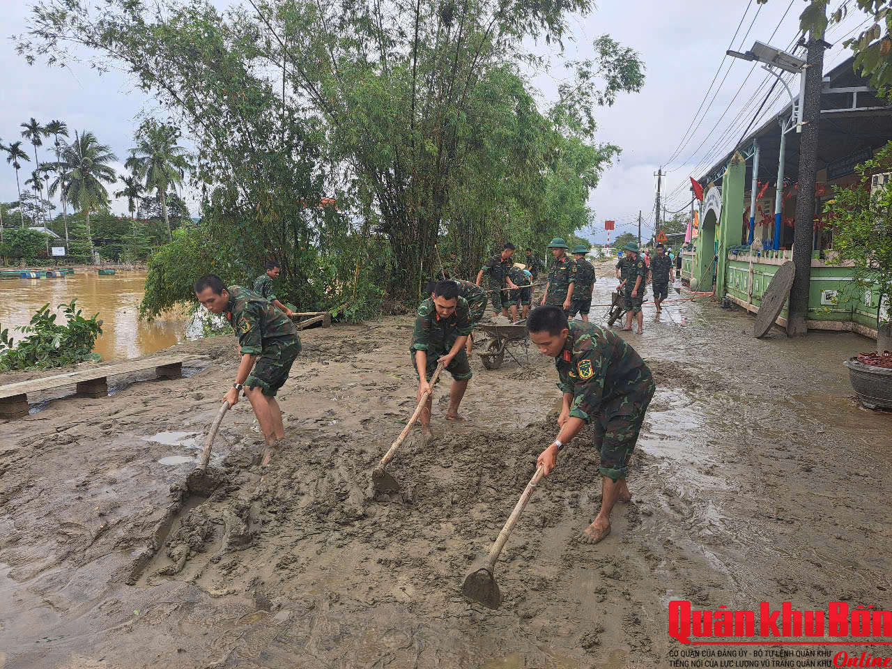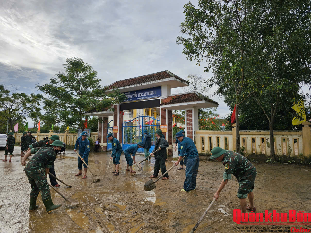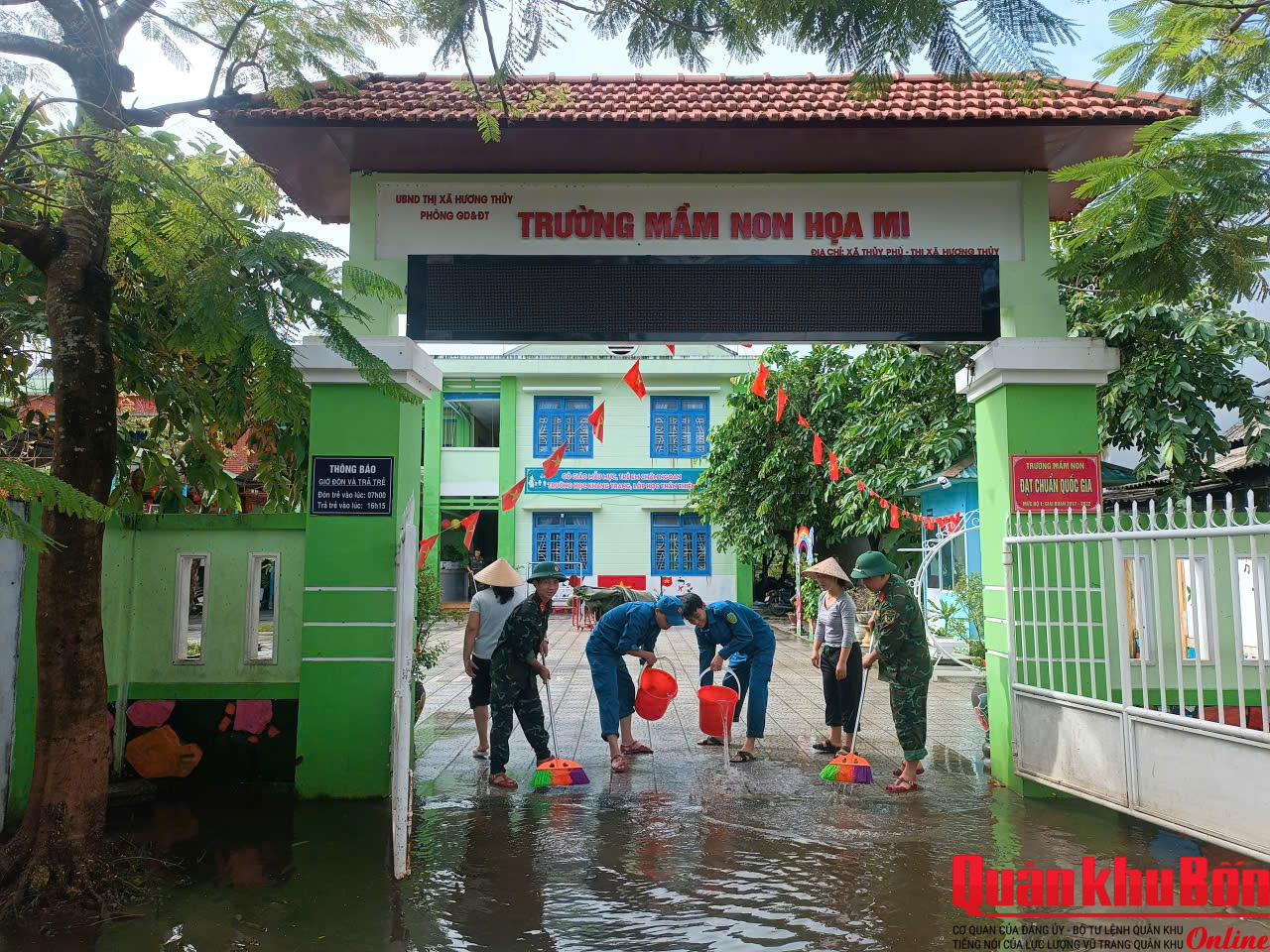 Từ sáng sớm, hơn 30 cán bộ, chiến sĩ Tiểu đoàn Bộ binh 1, Trung đoàn Bộ binh 6, Bộ Chỉ huy Quân sự thành phố Huế đã có mặt tại Trường Mầm non Thủy Thanh 1 (cơ sở Vân Thê Đập), phường Thủy Thanh. Để đến được điểm trường nằm sát bờ sông Như Ý này, bộ đội phải lội bộ qua quãng đường gần 1,5 km ngập bùn lầy.