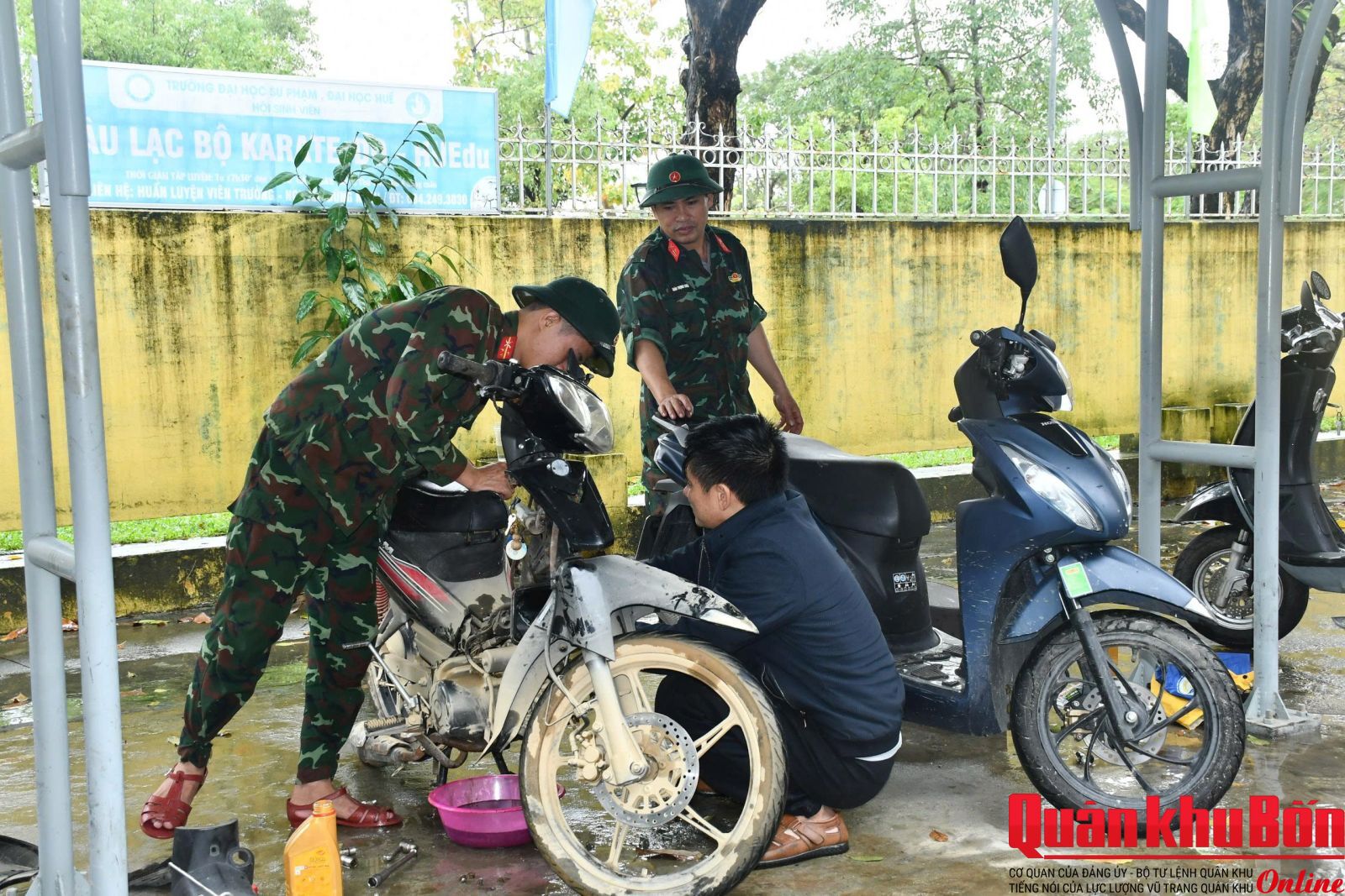 Bên cạnh đó, chia sẻ với sinh viên có phương tiện hư hỏng do ngập nước, Bộ CHQS thành phố Huế đã huy động hàng chục cán bộ, chiến sĩ kỹ thuật phối hợp với gần 20 thành viên Câu lạc bộ xe máy Diễn Châu (Nghệ An) vào Huế tổ chức sửa chữa, thay dầu nhớt, linh kiện miễn phí cho sinh viên tại các trường đại học, cao đẳng.