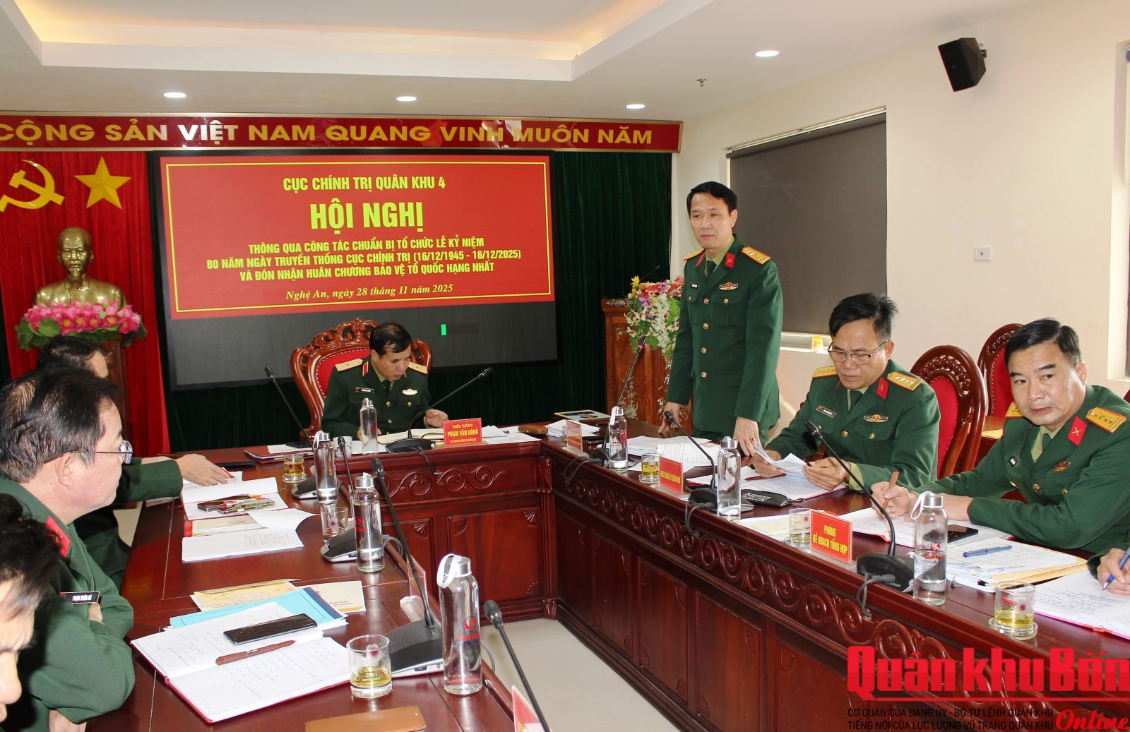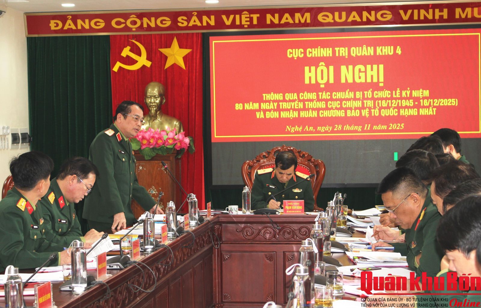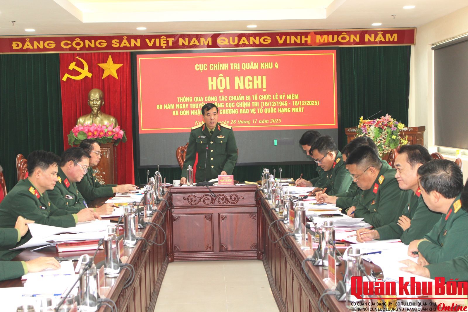 Chiều ngày 28/11/2025, Cục Chính trị Quân khu 4 tổ chức Hội nghị thông qua các nội dung chuẩn bị tổ chức Lễ kỷ niệm 80 năm Ngày truyền thống Cục Chính trị (16/12/1945 – 16/12/2025) và đón nhận Huân chương Bảo vệ Tổ quốc hạng Nhất. Thiếu tướng Phạm Văn Đông, Ủy viên Thường vụ Đảng ủy, Chủ nhiệm Chính trị Quân khu chủ trì Hội nghị. Tham dự có các đồng chí trong Ban Thường vụ, Thủ trưởng Cục Chính trị và đại diện các cơ quan, đơn vị trực thuộc Cục.