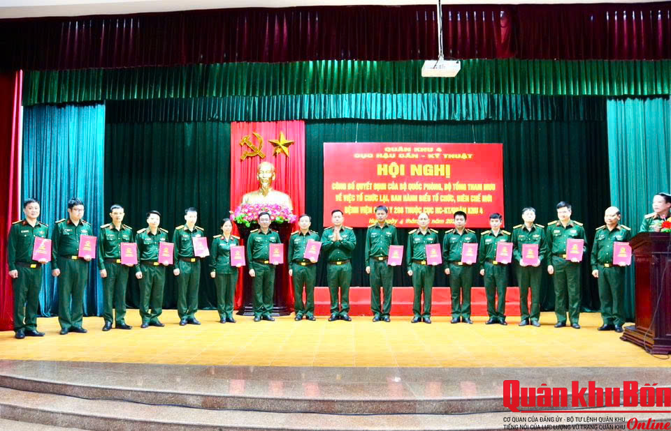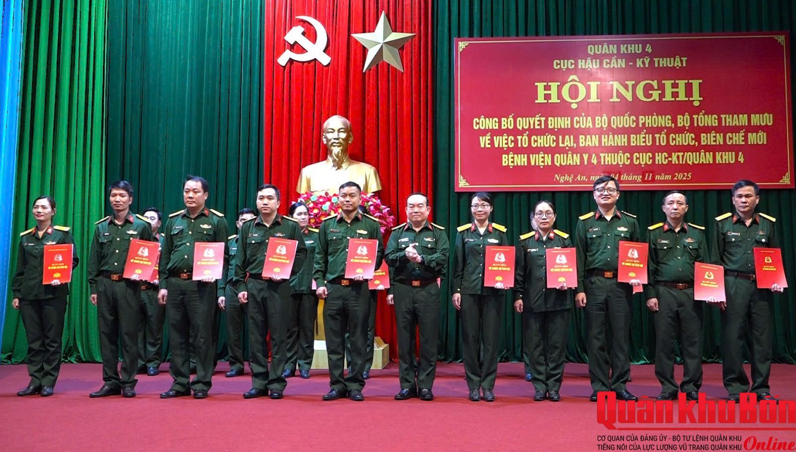 Ngày 4/11/2025, Cục Hậu cần – Kỹ thuật Quân khu 4 tổ chức Hội nghị công bố Quyết định của Bộ trưởng Bộ Quốc phòng và Tổng Tham mưu trưởng Quân đội Nhân dân Việt Nam về việc tổ chức lại, ban hành biểu tổ chức, biên chế Bệnh viện Quân y 4, Bệnh viện Quân y 268 (thời bình) và điều chuyển Đội Y học Dự phòng về trực thuộc Bệnh viện Quân y 4.
