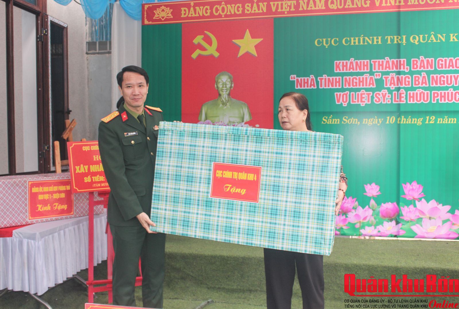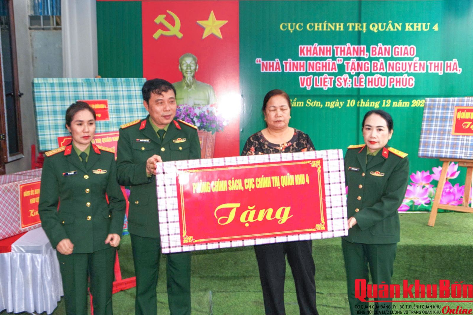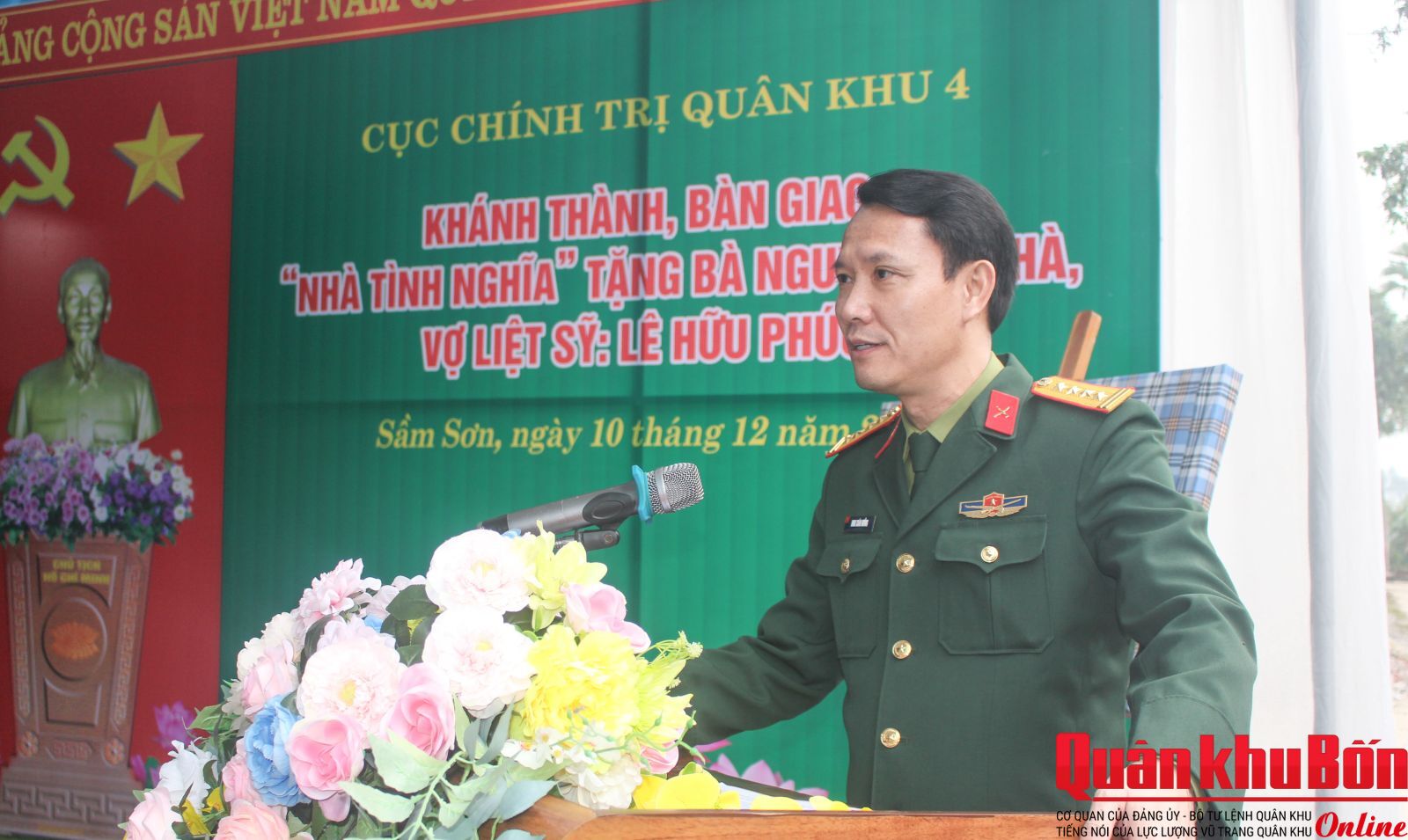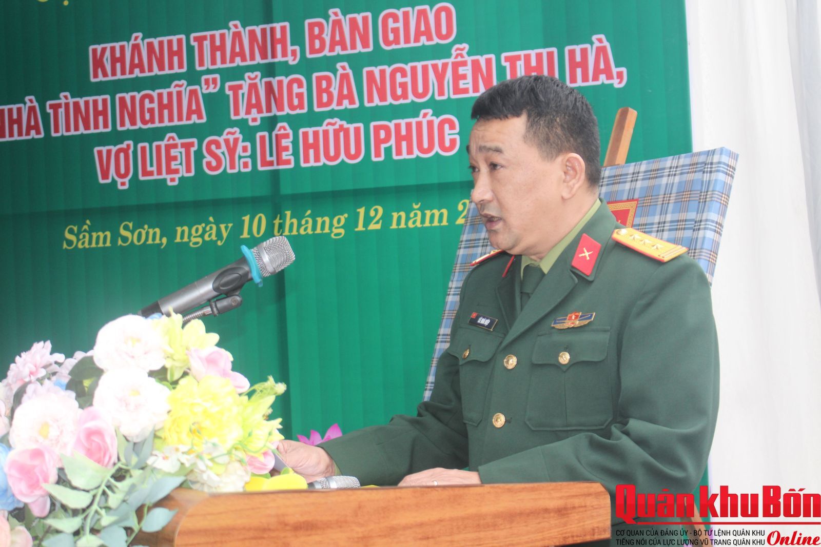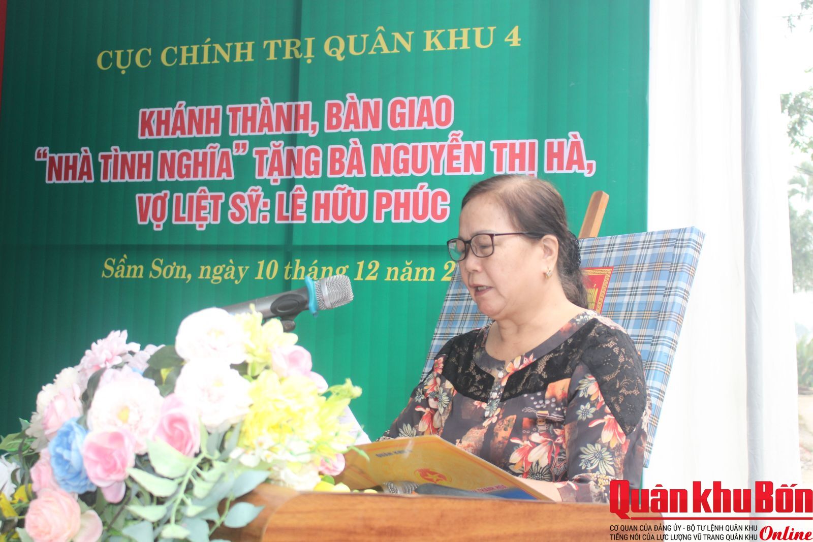 Phát biểu tại buổi lễ, Đại tá Đinh Xuân Hướng, Phó Chủ nhiệm Chính trị Quân khu 4 khẳng định: “Việc xây dựng và bàn giao căn nhà tặng bà Nguyễn Thị Hà là tình cảm, trách nhiệm của cán bộ, chiến sĩ Cục Chính trị Quân khu 4 đối với thân nhân các liệt sĩ, những người đã cống hiến, hy sinh cho độc lập, tự do của Tổ quốc. Thể hiện sự quan tâm sâu sắc của Thường vụ, Đảng ủy, Thủ trưởng Cục Chính trị Quân khu; đồng thời ghi nhận sự hỗ trợ tích cực của Đảng ủy Quân sự tỉnh, Đảng ủy, UBND, UBMTTQ phường Sầm Sơn, các ban ngành đoàn thể và bà con nhân dân Tổ dân phố Khang Thái đối với gia đình người có công với cách mạng.
