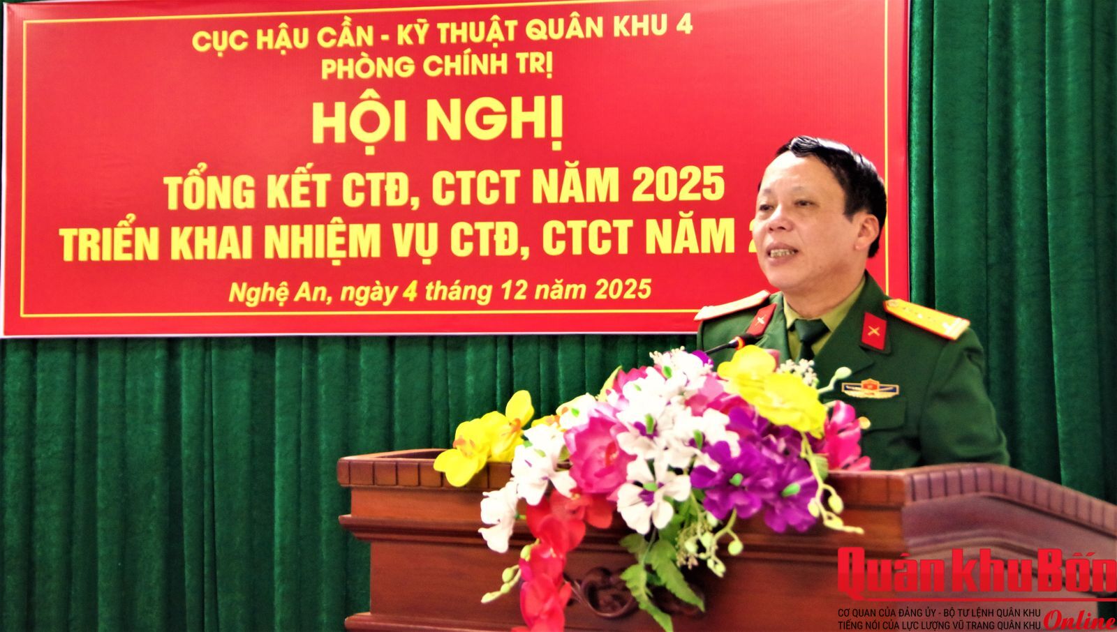 Sáng 4/12/2025, Cục Hậu cần – Kỹ thuật (HC-KT) Quân khu 4 tổ chức Hội nghị tổng kết công tác Đảng, công tác chính trị (CTĐ, CTCT) năm 2025 và triển khai nhiệm vụ năm 2026. Đại tá Phan Gia Thuận, Bí thư Đảng ủy, Chính ủy Cục HC – KT dự, chỉ đạo hội nghị; Đại tá Hà Huy Hoàng, Ủy viên Ban Thường vụ Đảng ủy, Chủ nhiệm Chính trị Cục HC – KT chủ trì hội nghị.