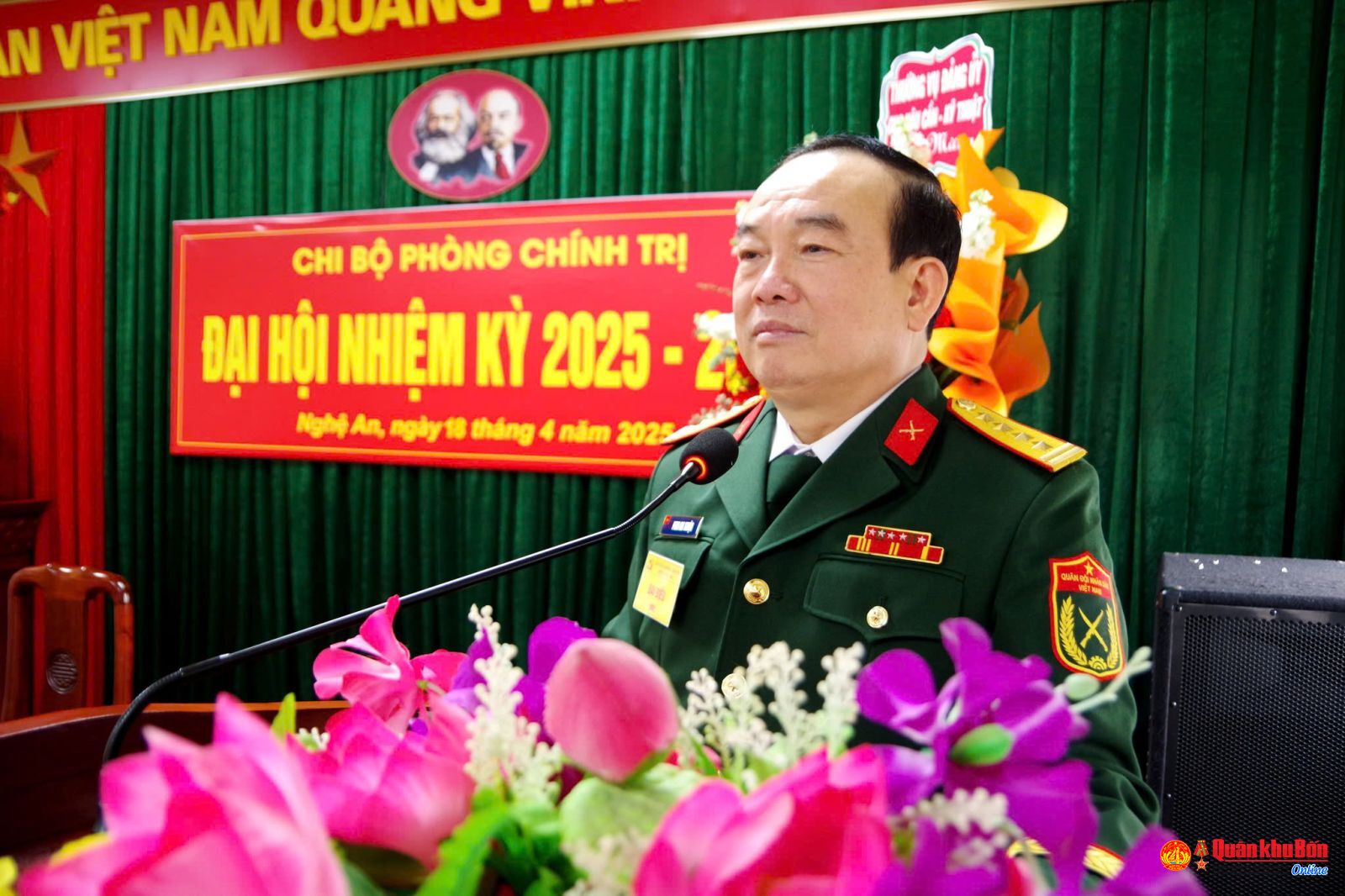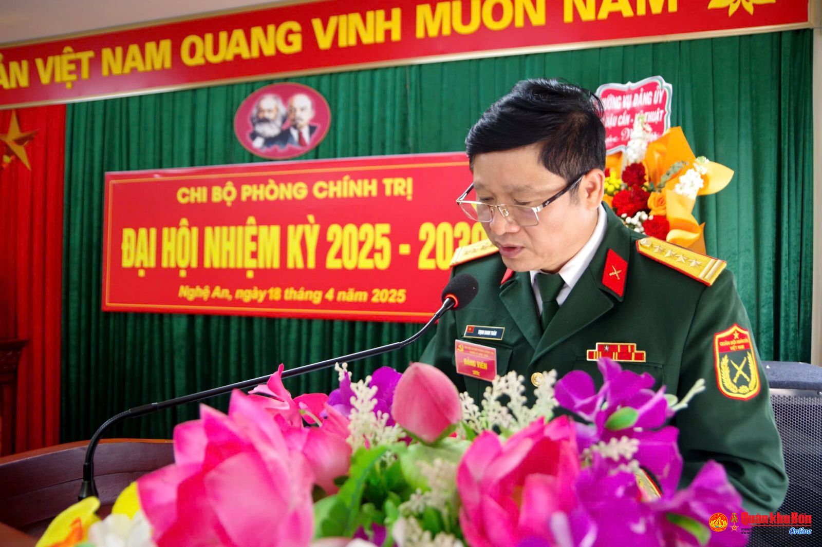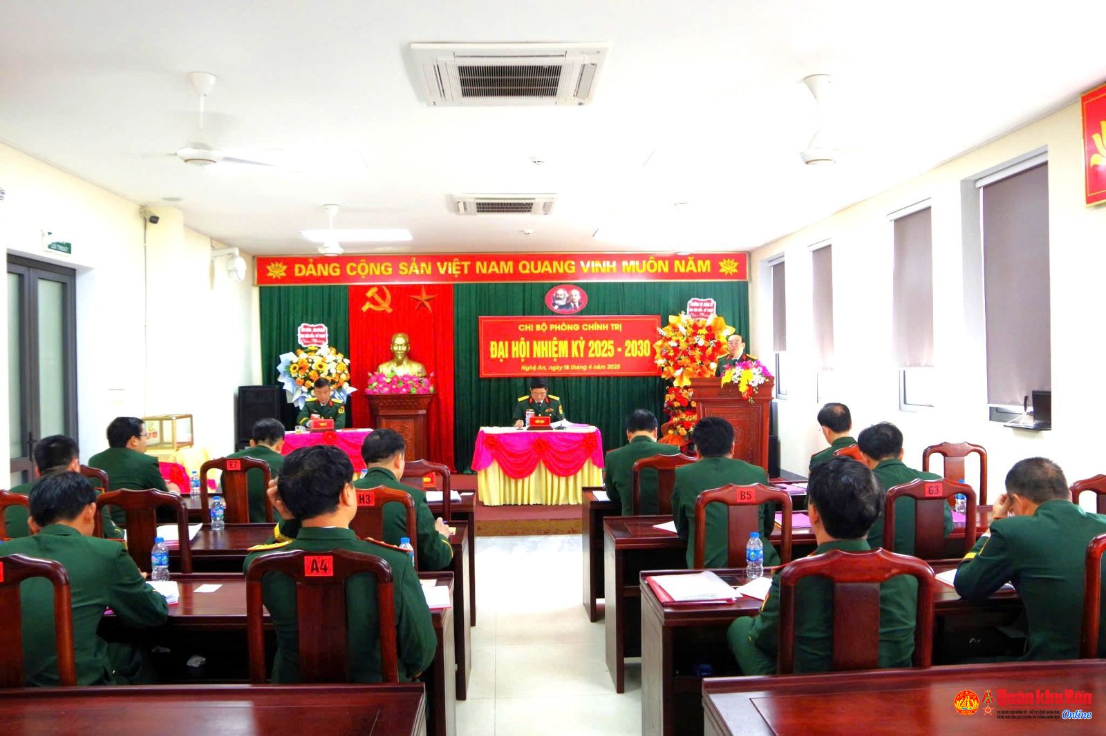 Trong nhiệm kỳ tới (2025 – 2030), Chi bộ Phòng Chính trị đề ra một số mục tiêu, chỉ tiêu cụ thể như: Tiếp tục thực hiện tốt công tác tham mưu, chỉ đạo học tập, quán triệt và nắm chắc các nghị quyết, chỉ thị, hướng dẫn của cấp trên về nhiệm vụ quân sự, quốc phòng và công tác Đảng, công tác chính trị. Thực hiện hiệu quả công tác giáo dục chính trị, tư tưởng. Nâng cao chất lượng công tác xây dựng Đảng, công tác cán bộ; phấn đấu hằng năm 100% cấp ủy, tổ chức Đảng hoàn thành nhiệm vụ, trong đó có từ 80% trở lên hoàn thành tốt nhiệm vụ. Tham mưu thực hiện tốt công tác bảo vệ chính trị nội bộ, bảo vệ bí mật, đảm bảo an toàn tuyệt đối về chính trị; thực hiện tốt quy chế dân chủ ở cơ sở; nâng cao hiệu quả công tác chính sách và công tác dân vận. Không ngừng nâng cao năng lực lãnh đạo, sức chiến đấu, tinh thần tự phê bình, phê bình và sự đoàn kết, thống nhất trong cấp ủy, chi bộ.