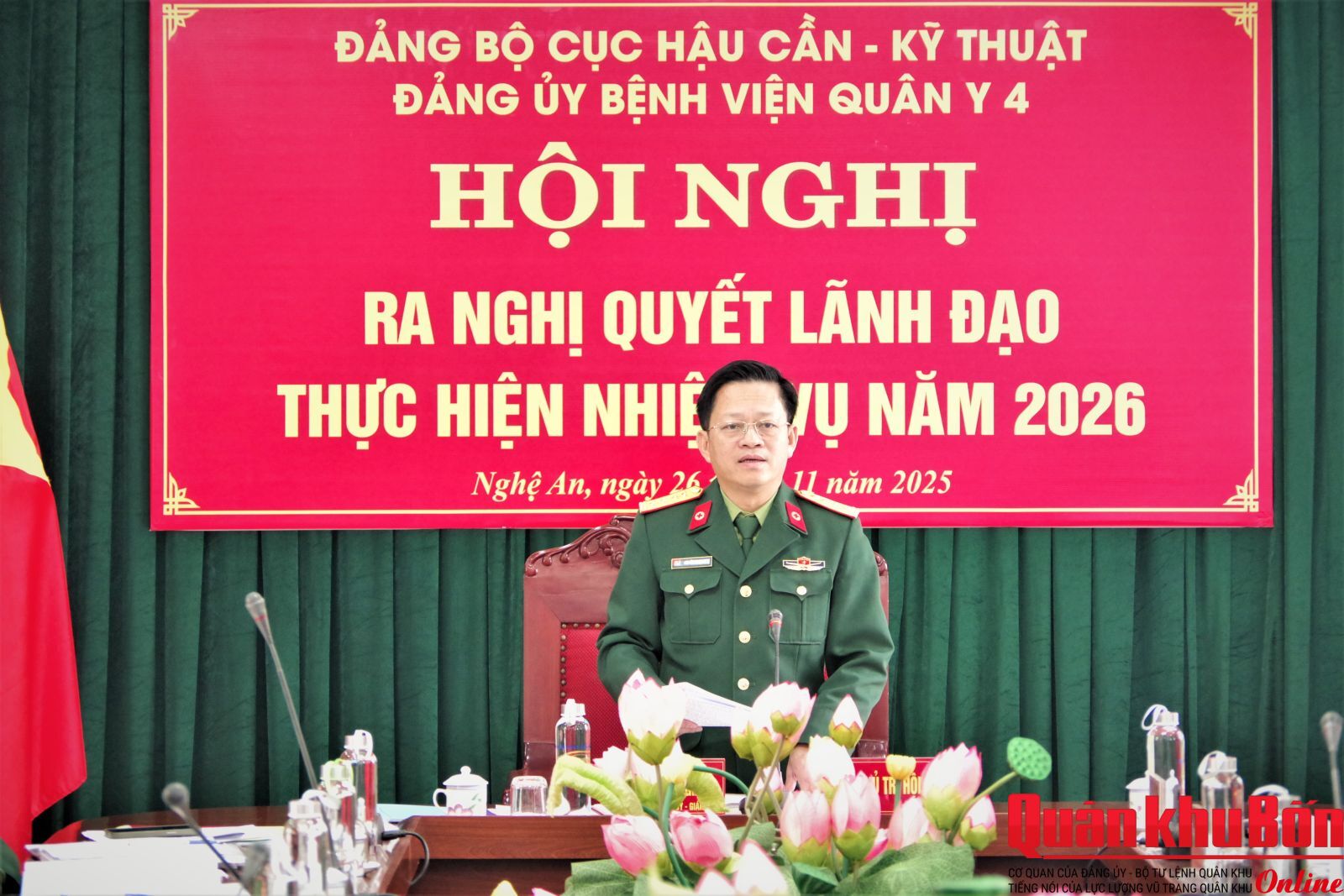 Phát biểu chỉ đạo, Đại tá Phạm Đức Tuấn ghi nhận, biểu dương những kết quả Bệnh viện đạt được trong năm 2025. Đồng chí yêu cầu thời gian tới Bệnh viện Quân y 4 tiếp tục quán triệt, triển khai hiệu quả mục tiêu, chỉ tiêu nghị quyết đại hội đảng các cấp nhiệm kỳ 2025–2030; mệnh lệnh, chỉ lệnh thực hiện nhiệm vụ năm 2026 của Tư lệnh Quân khu và Cục Hậu cần – Kỹ thuật. Trọng tâm là nâng cao chất lượng công tác chuyên môn; xây dựng chính quy, chấp hành kỷ luật; cải cách hành chính; chuyển đổi số; nâng cao năng lực lãnh đạo, sức chiến đấu của cấp ủy, tổ chức đảng; xây dựng Bệnh viện vững mạnh toàn diện “Mẫu mực, tiêu biểu”. Đồng chí nhấn mạnh bệnh viện thực hiện thắng lợi khâu đột phá năm 2026: Ứng dụng mạnh mẽ công nghệ thông tin, triển khai bệnh án điện tử, đẩy mạnh chuyển đổi số nâng cao chất lượng khám chữa bệnh. Đổi mới phương pháp, tác phong làm việc khoa học, hiệu quả; gắn trách nhiệm tập thể với cá nhân; nâng cao chất lượng xây dựng chính quy, rèn luyện kỷ luật.