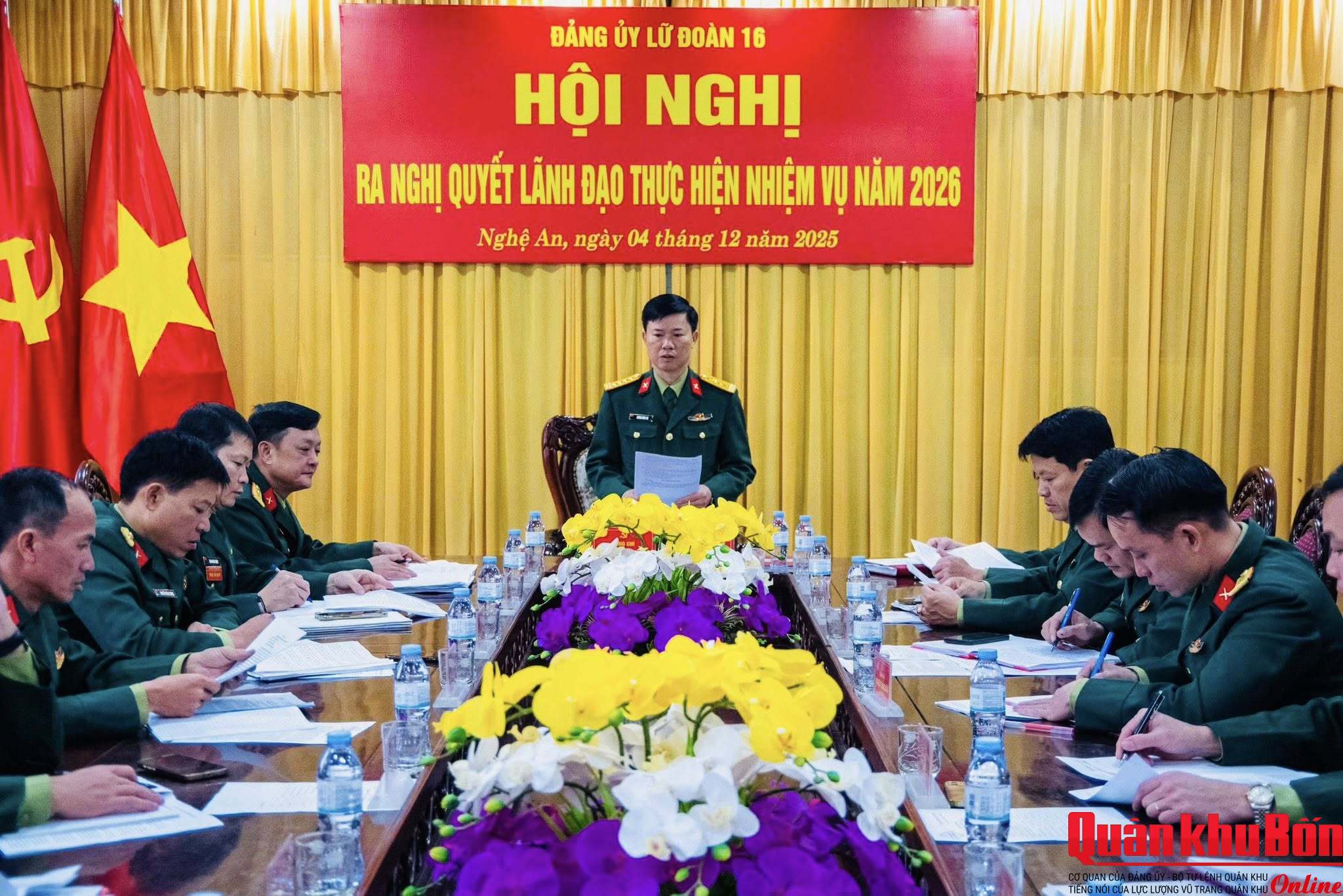 Sáng ngày 04/12/2025, Đảng uỷ Lữ đoàn Pháo binh 16 tổ chức Hội nghị ra Nghị quyết lãnh đạo thực hiện nhiệm vụ năm 2026. Đồng chí Đại tá Hoàng Đình Thi, Bí thư Đảng uỷ, Chính uỷ Lữ đoàn chủ trì Hội nghị. Tham dự Hội nghị có các đồng chí trong Thường vụ, Đảng uỷ, chỉ huy Lữ đoàn và lãnh đạo, chỉ huy các cơ quan, đơn vị trực thuộc.
