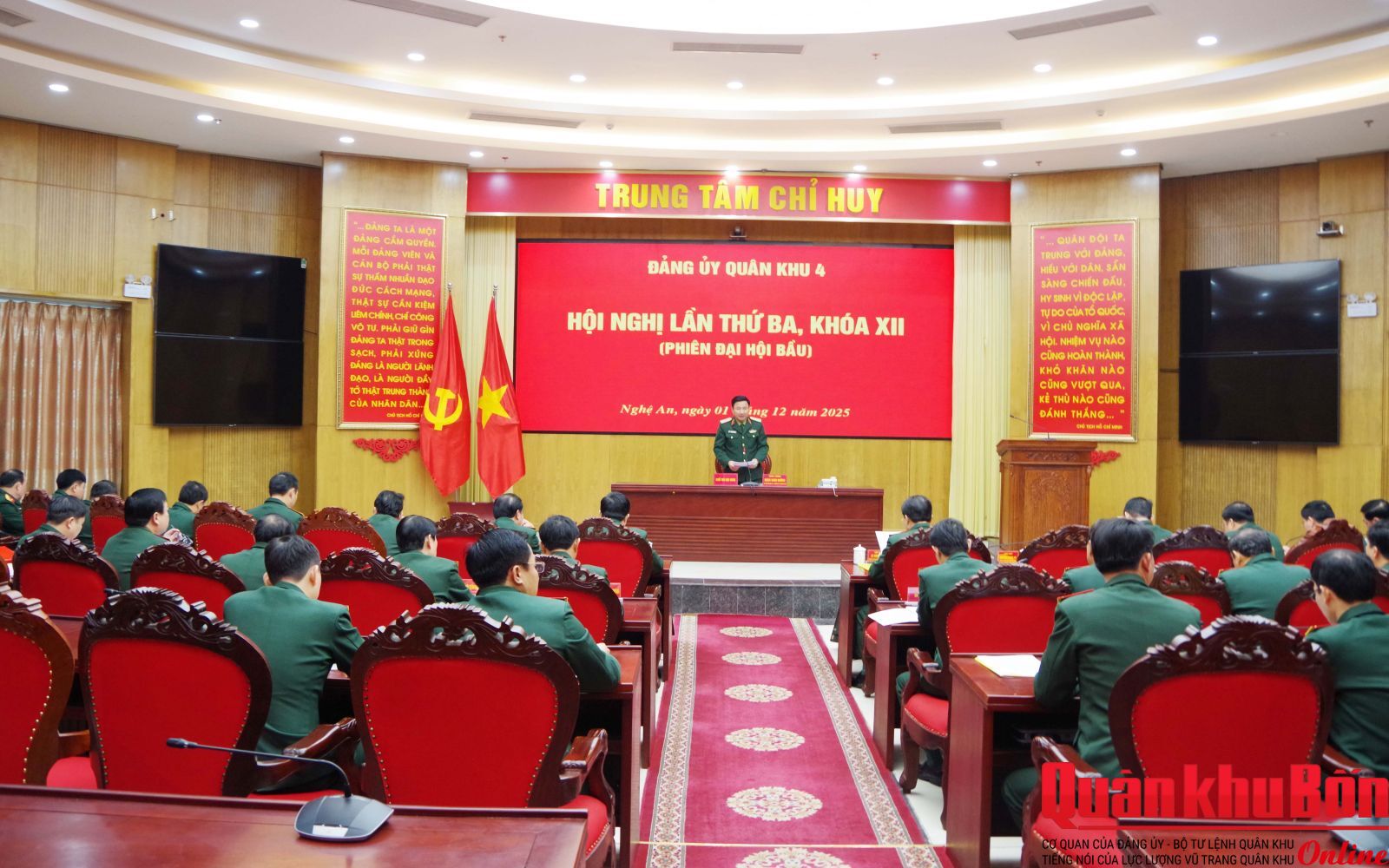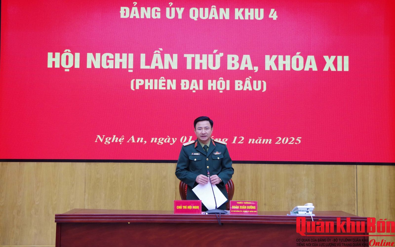 Sáng ngày 12/1/2025, Đảng ủy Quân khu 4 Hội nghị lần thứ Ba, khóa XII (phiên Đại hội bầu). Thiếu tướng Đoàn Xuân Bường, Bí thư Đảng ủy, Chính ủy Quân khu chủ trì Hội nghị. Tham dự Hội nghị có các đồng chí trong Ban Thường vụ Đảng ủy, Thủ trưởng Bộ Tư lệnh Quân khu; các đồng chí trong Ban Chấp hành Đảng bộ Quân khu, khóa XII (phiên Đại hội bầu); Hội nghị mời mở rộng đại biểu Đảng ủy các cơ quan, đơn vị trực thuộc.