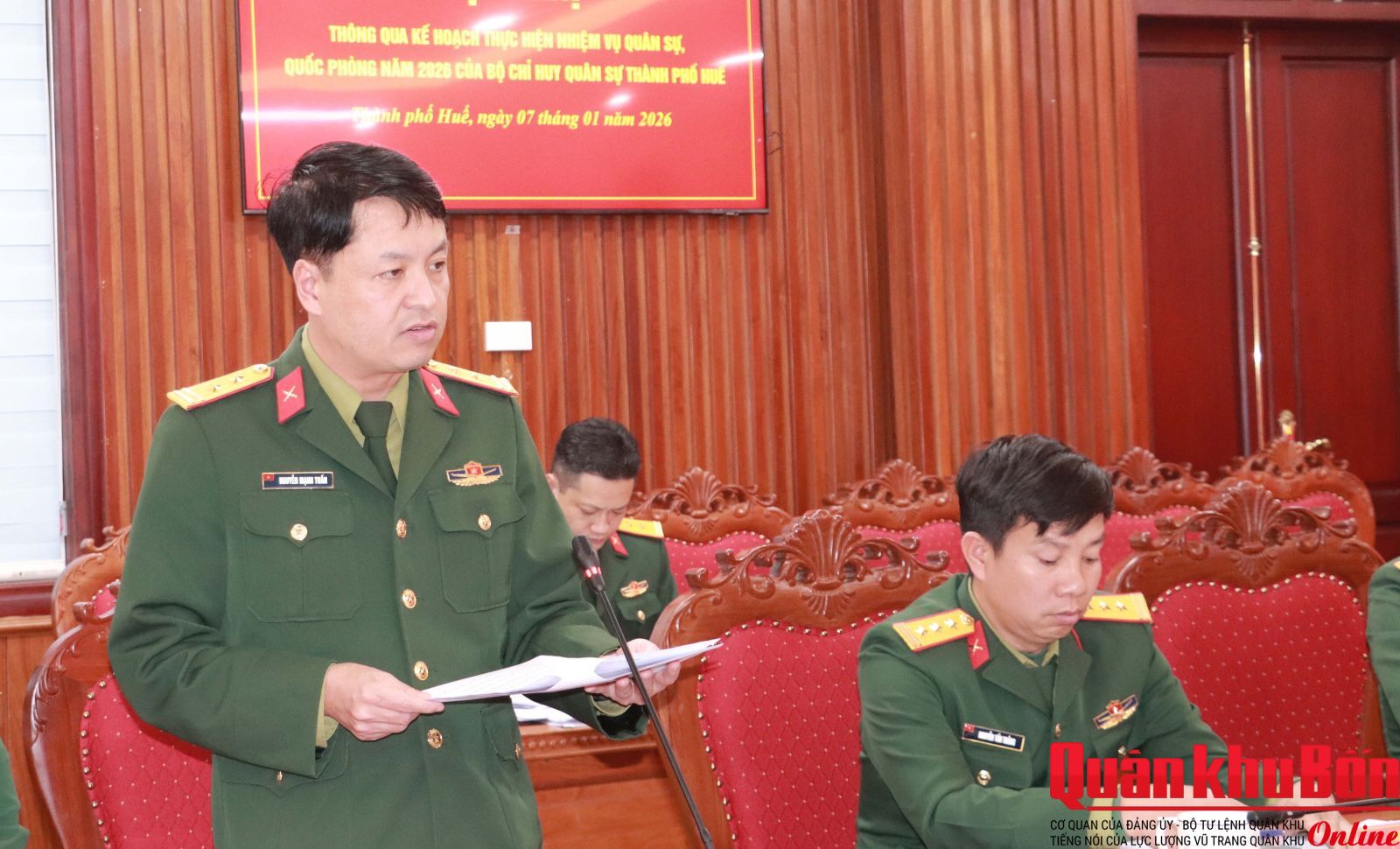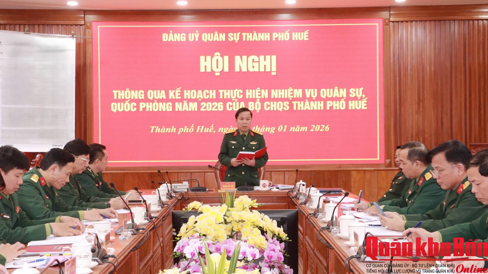 Trên cơ sở Nghị quyết của Đảng ủy Quân khu, mệnh lệnh nhiệm vụ QS, QP năm 2026 và chỉ thị, chỉ lệnh của Quân khu, Nghị quyết của Thành ủy Huế và Đảng ủy Quân sự thành phố Huế về lãnh đạo thực hiện nhiệm vụ năm 2026, Bộ CHQS thành phố Huế xây dựng kế hoạch thực hiện nhiệm vụ QS, QP năm 2026, trong đó tiếp tục quán triệt, triển khai thực hiện nghiêm quan điểm, đường lối, chủ trương của Đảng, chính sách, phát luật Nhà nước về nhiệm vụ quân sự, quốc phòng, xây dựng và bảo vệ Tổ quốc trong tình hình mới. Duy trì nghiêm chế độ sẵn sàng chiến đấu, nắm chắc tình hình địa bàn, chủ động phối hợp với cấp ủy, chính quyền, các lực lượng đánh giá, dự báo đúng tình hình các tình huống, không để bị động, bất ngờ; góp phần giữ vững an ninh chính trị, trật tự an toàn xã hội. Chủ độn chuẩn bị lực lượng phương tiện tham gia phòng, chống, khắc phục hậu quả thiên tai, tìm kiếm cứu nạn. Thực hiện nghiêm Nghị quyết của Quân ủy Trung ương, Đảng ủy Quân khu về nâng cao chất lượng huấn luyện; xây dựng lực lượng dân quân tự vệ, dự bị động viên có số lượng hợp lý, nâng cao chất lượng; xây dựng cơ quan, đơn vị vững mạnh toàn diện, “Mẫu mực tiêu biểu”, nâng cao hiệu quả xây dựng chính quy, quản lý kỷ luật ở các cấp.