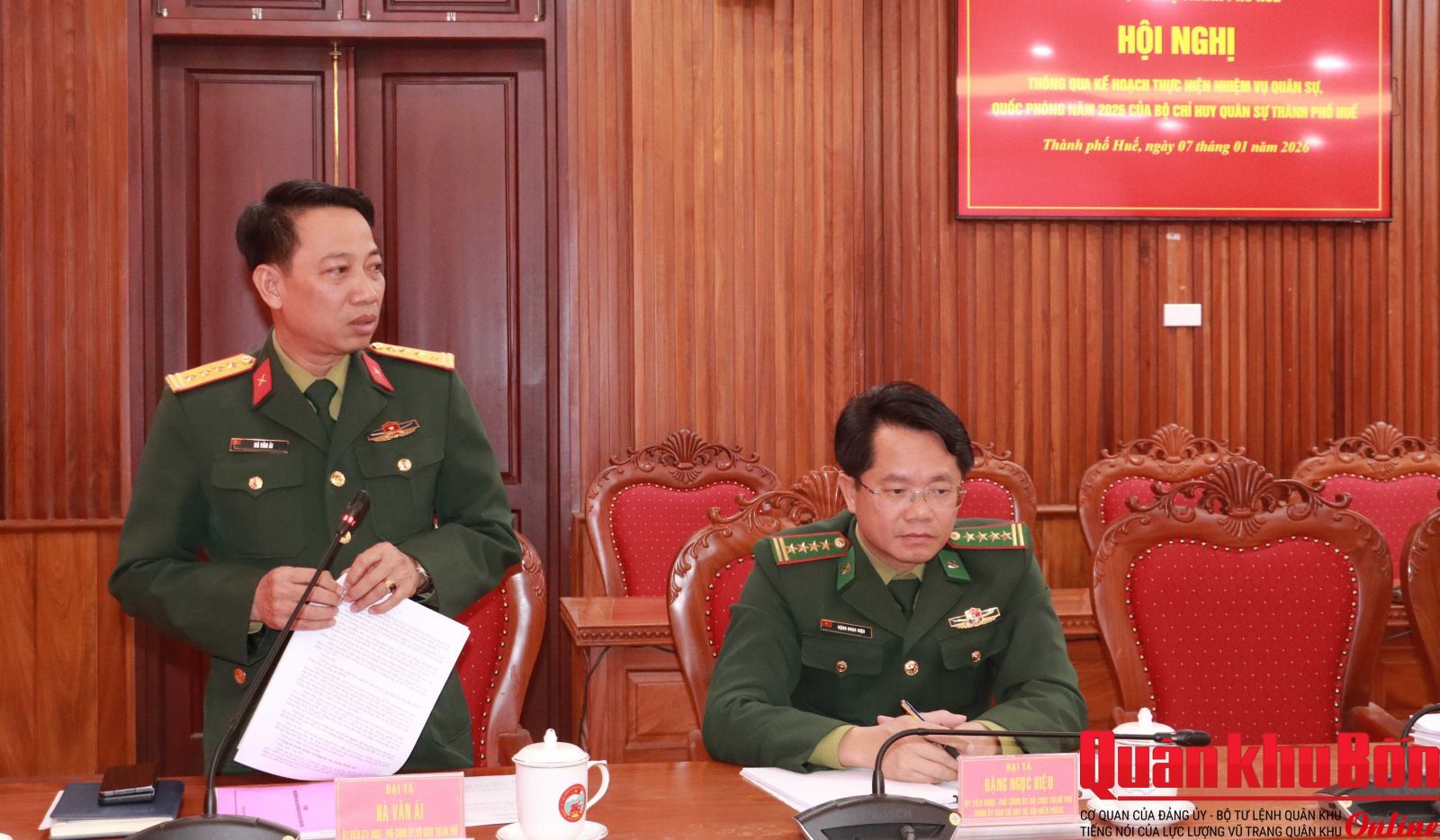 Chiều 07/01/2026, Đảng ủy Quân sự thành phố Huế tổ chức hội nghị thông qua kế hoạch thực hiện nhiệm vụ quân sự, quốc phòng (QS, QP) năm 2026 của Bộ Chỉ huy Quân sự (CHQS) thành phố. Đại tá Trương Viết Hải, Thành ủy viên, Phó Bí thư Thường trực Đảng ủy, Chính ủy Bộ CHQS thành phố Huế chủ trì hội nghị. Tham dự hội nghị có các đồng chí trong Ban Thường vụ Đảng ủy, Thủ trưởng Bộ CHQS thành phố.