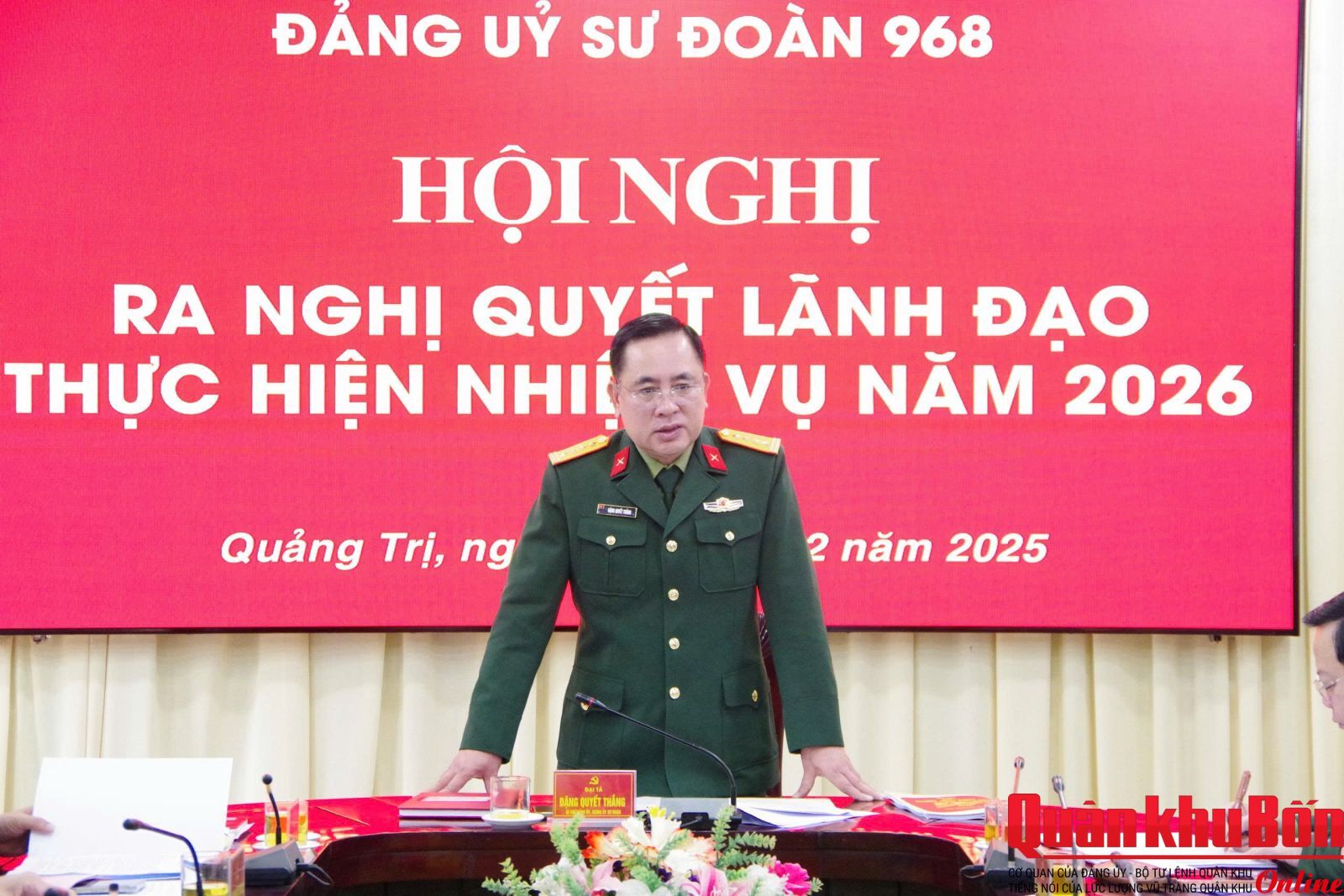 Ngày 2/12/2025, Đảng ủy Sư đoàn 968 tổ chức hội nghị ra Nghị quyết lãnh đạo thực hiện nhiệm vụ năm 2026. Đại tá Đặng Quyết Thắng, Bí thư Đảng ủy, Chính ủy Sư đoàn chủ trì hội nghị.