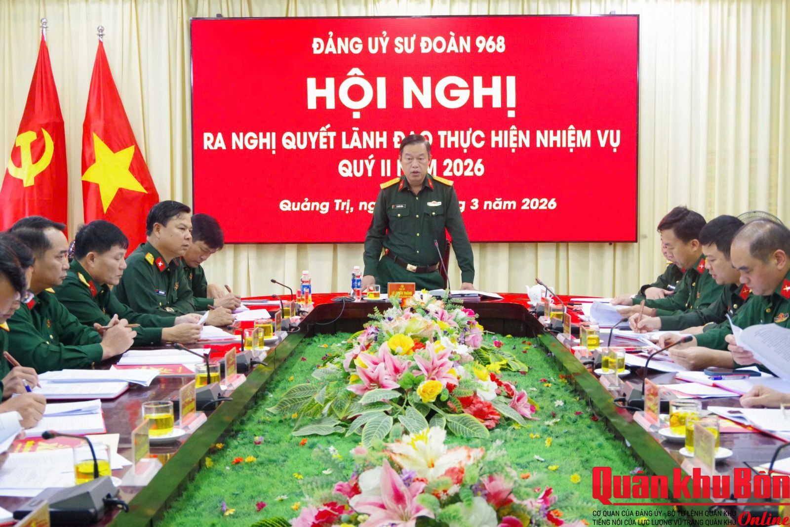 Ngày 25/3/2026, Đảng ủy Sư đoàn 968 tổ chức hội nghị ra Nghị quyết lãnh đạo thực hiện nhiệm vụ quý II năm 2026. Đại tá Lê Chiến Thắng, Phó Bí thư Đảng ủy, Sư đoàn trưởng Sư đoàn 968 chủ trì hội nghị.