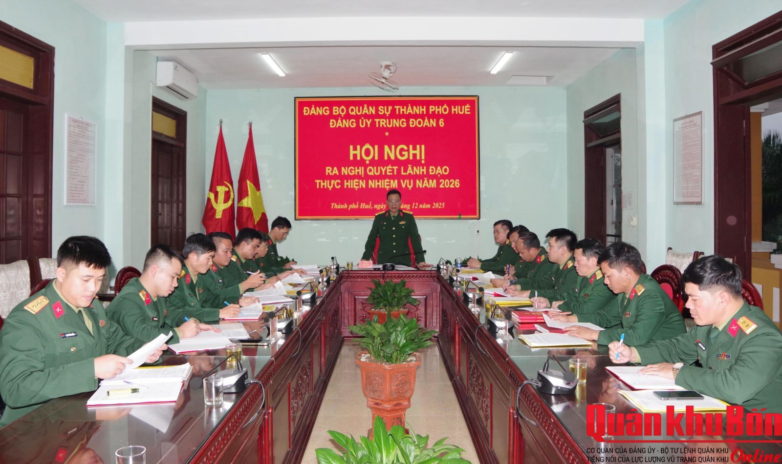 Ngày 03/12/2025, Đảng ủy Trung đoàn 6 đã tổ chức Hội nghị ra nghị quyết lãnh đạo thực hiện nhiệm vụ năm 2026. Đại tá Lê Huy Nghĩa, Phó chỉ huy trưởng, Tham mưu trưởng Bộ Chỉ huy Quân sự (CHQS) thành phố Huế dự, chỉ đạo hội nghị.
