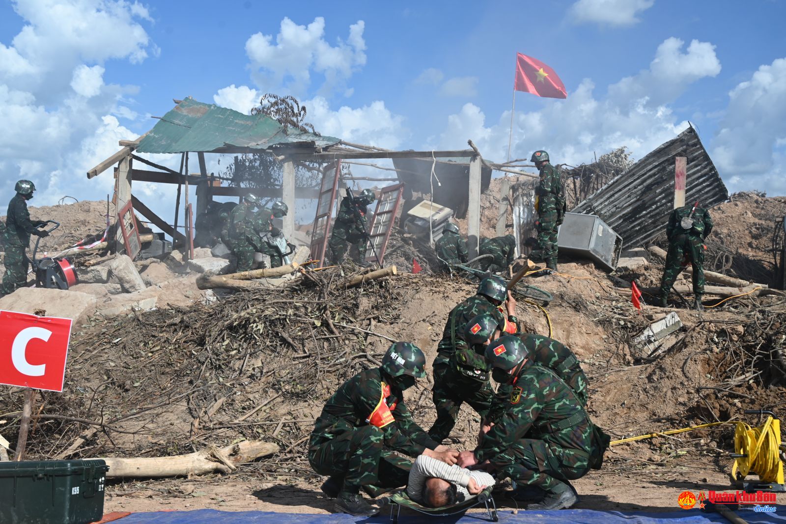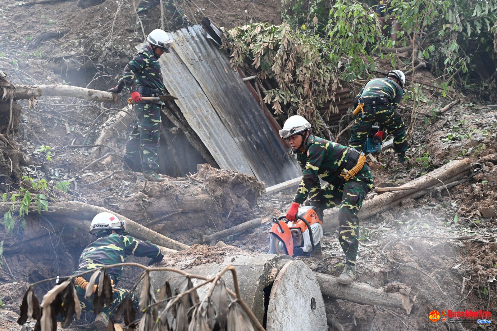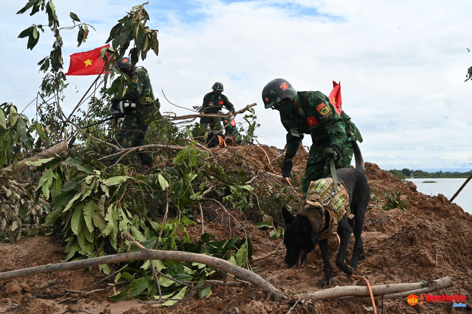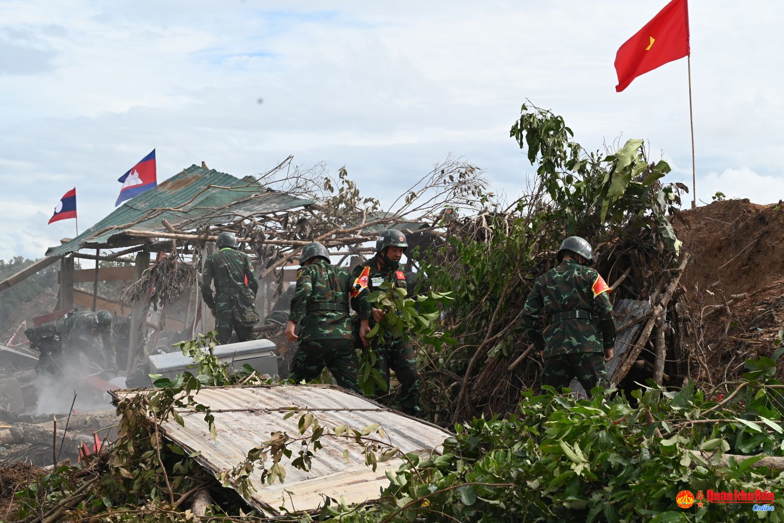 Xử lý tình huống sạt lở đất, nhà bị sập, bộ đội Công binh, Quân y ba nước đã triển khai các thiết bị chuyên dùng để khoan cắt bê tông, tìm kiếm người sống sót bằng thiết bị hồng ngoại để xác định vị trí của những người bị mất tích. Cùng hỗ trợ cho công tác giải cứu các nạn nhân, Bộ đội Biên phòng Việt Nam đã sử dụng Chó nghiệp vụ tiếp cận hiện trường, đánh hơi, xác định vị trí các nạn nhân bị mắc kẹt nhanh chóng, chuẩn xác hơn, nhờ vậy, tất cả các nạn nhân đã được tìm thấy và bàn giao cho lực lượng Quân y cấp cứu kịp thời.