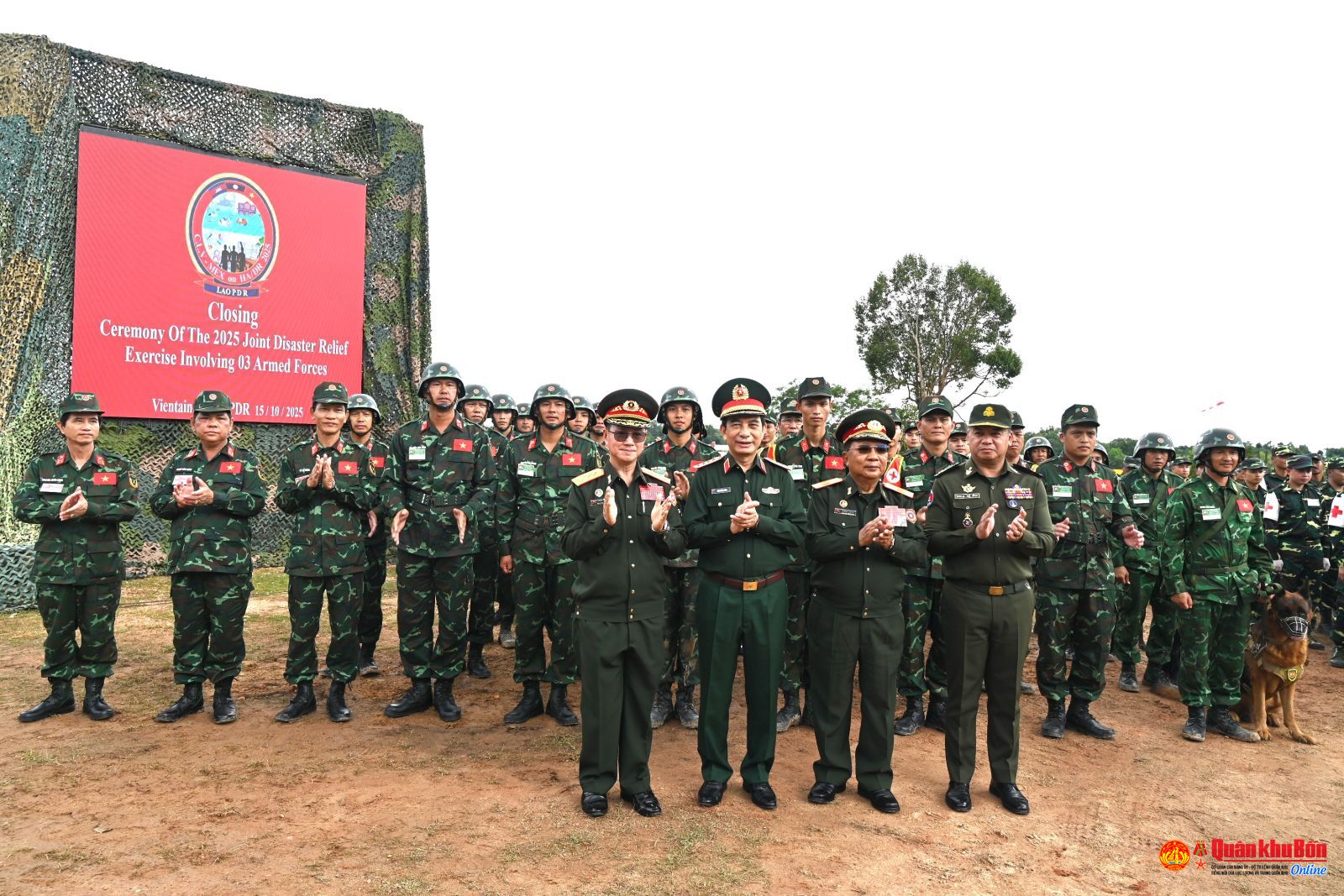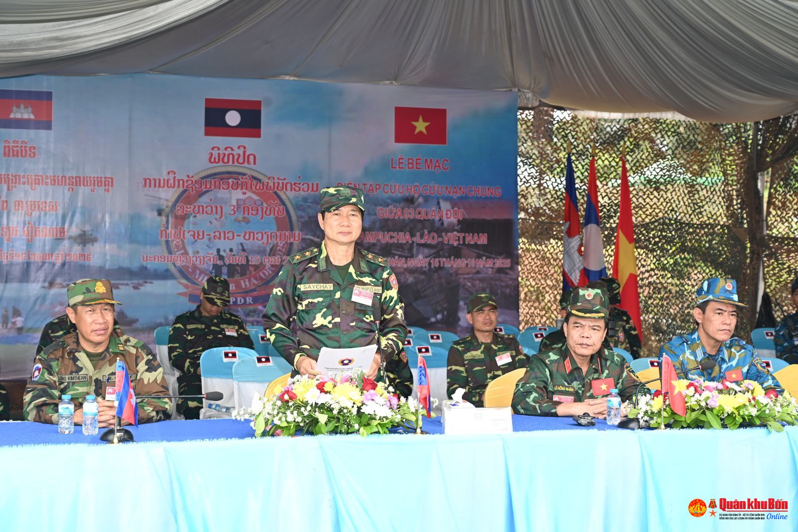 Sáng ngày 15/10/2025, tại quận Naxaiphong, thủ đô Viêng Chăn, Nước Cộng hòa dân chủ nhân dân (DCND) Lào, Bộ Quốc phòng Lào chủ trì, phối hợp tổ chức thành công cuộc diễn tập cứu hộ, cứu nạn chung giữa Quân đội ba nước Lào – Việt Nam – Campuchia. Đây là hoạt động nằm trong chương trình Cuộc gặp thường niên giữa ba Bộ trưởng Bộ Quốc phòng Lào, Việt Nam và Campuchia tại Thủ đô Viêng Chăn, Lào năm 2025. Dự, chủ trì khai mạc diễn tập, có Đại tướng Chansamone Chanyalath, Ủy viên Bộ Chính trị Đảng Nhân dân Cách mạng Lào, Phó Thủ tướng Chính phủ Nước Cộng hòa DCND Lào; Đại tướng Phan Văn Giang, Ủy viên Bộ Chính trị, Phó Bí thư Quân ủy Trung ương, Bộ trưởng Bộ Quốc phòng Việt Nam; Đại tướng Tea Seiha, Phó Thủ tướng Chính phủ, Bộ trưởng Bộ Quốc phòng Campuchia; Thượng tướng Khamliang Outhakaysone, Ủy viên Trung ương Đảng Nhân dân cách mạng Lào, Bộ trưởng Bộ Quốc phòng Lào.
