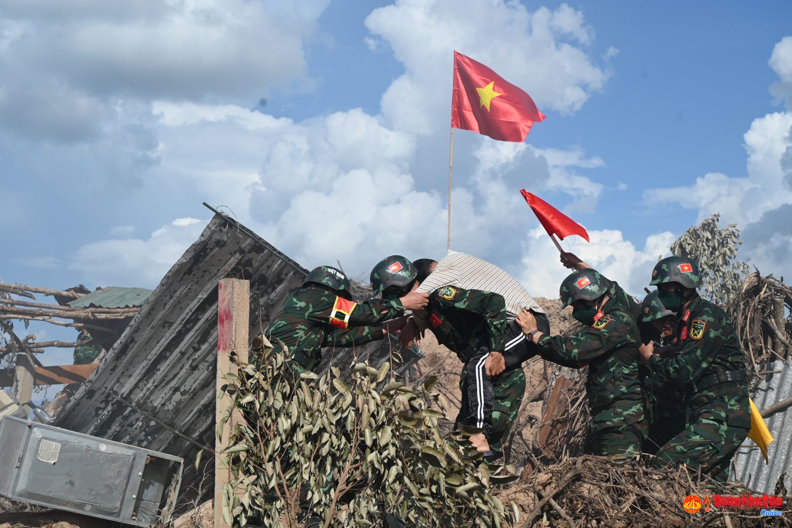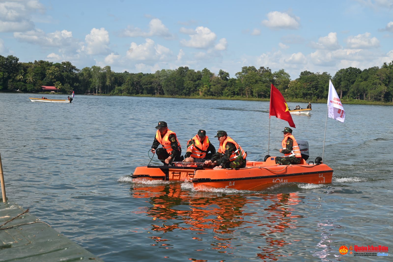 Tại khu vực các nạn nhân bị nước lũ cô lập, các lực lượng của Quân đội ba nước đã triển khai xuồng cao tốc và thiết bị không người lái tiếp cận hiện trường. Đồng thời khẩn trương triển khai các phương tiện vượt sông cùng lực lượng Công binh, Quân y tổ chức tìm kiếm, cứu nạn, tiếp cận các hộ dân bị cô lập, ngập lụt và di dời tài sản của nhân dân vào bờ an toàn. Các nạn nhân bị thương nhẹ được vận chuyển bàn giao cho Quân y ba nước tiếp nhận, sơ cứu và chuyển về khu vực an toàn; đối với các bệnh nhân nặng được các Tổ quân y phân loại và chuyển lên tuyến trên xử lý kịp thời. Đại úy Võ Thành Công, Đại đội trưởng Đại đội 12, Tiểu đoàn 4, Lữ đoàn Công binh 414, Quân khu 4 nói: Trong diễn tập cứu hộ, cứu nạn ở dưới nước, Quân đội của ba nước đã có sự phối hợp nhịp nhàng, chặt chẽ, hiệp đồng tốt với nhau, cùng nhau hoàn thành tốt nhiệm vụ. Thứ nhất là đội hình diễn tập đảm bảo trật tự, đẹp mắt, thứ hai là tìm kiếm không để sót nạn nhân, cũng như giải cứu toàn bộ nạn nhân an toàn. Trong tìm kiếm, cứu nạn lần này chúng tôi đã phát hiện 09 nạn nhân đưa vào bờ an toàn”.