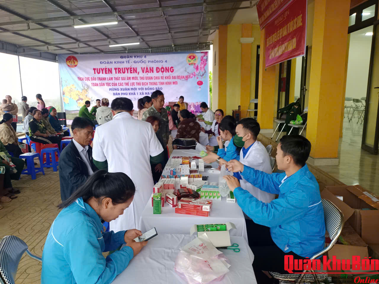 Tại xã Na Ngoi, tỉnh Nghệ An, Đoàn Kinh tế - Quốc phòng (KT-QP) 4 vừa phối hợp với cấp ủy, chính quyền địa phương tổ chức chương trình khám bệnh, cấp thuốc miễn phí và tuyên truyền pháp luật cho đồng bào dân tộc bản Phù Khả 1.