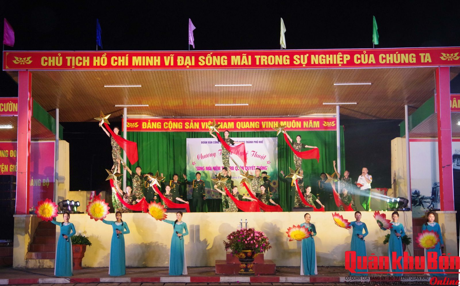 Nhằm mang đến đời sống văn hóa tinh thần cho cán bộ, chiến sĩ trong Lực lượng vũ trang thành phố, đặc biệt là kịp thời động viên, khích lệ các chiến sĩ mới nhập ngũ năm 2026. Tối ngày 17/3, Đoàn Văn công Quân khu 4 đã có buổi biểu diễn chương trình nghệ thuật phục vụ cán bộ, chiến sĩ Bộ Chỉ huy Quân sự (CHQS) thành phố Huế, Ban Chỉ huy Bộ đội Biên Phòng và Trung đoàn 176 (Sư đoàn 968).