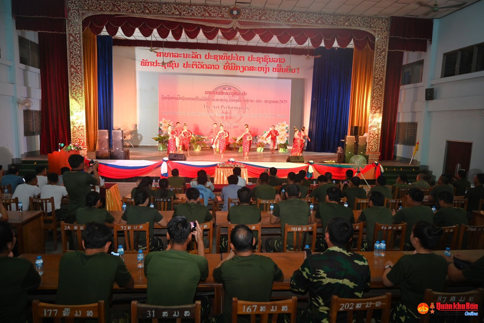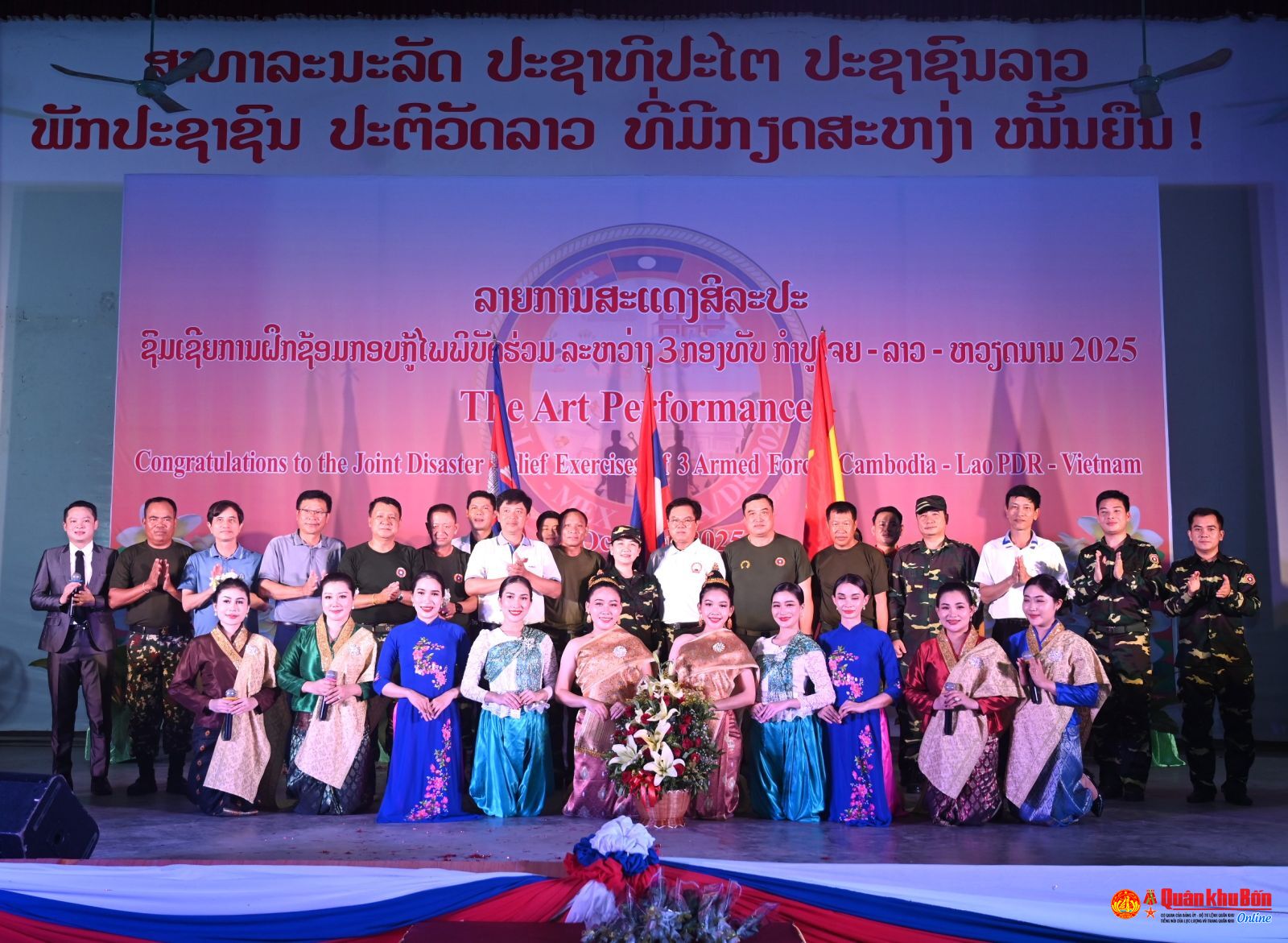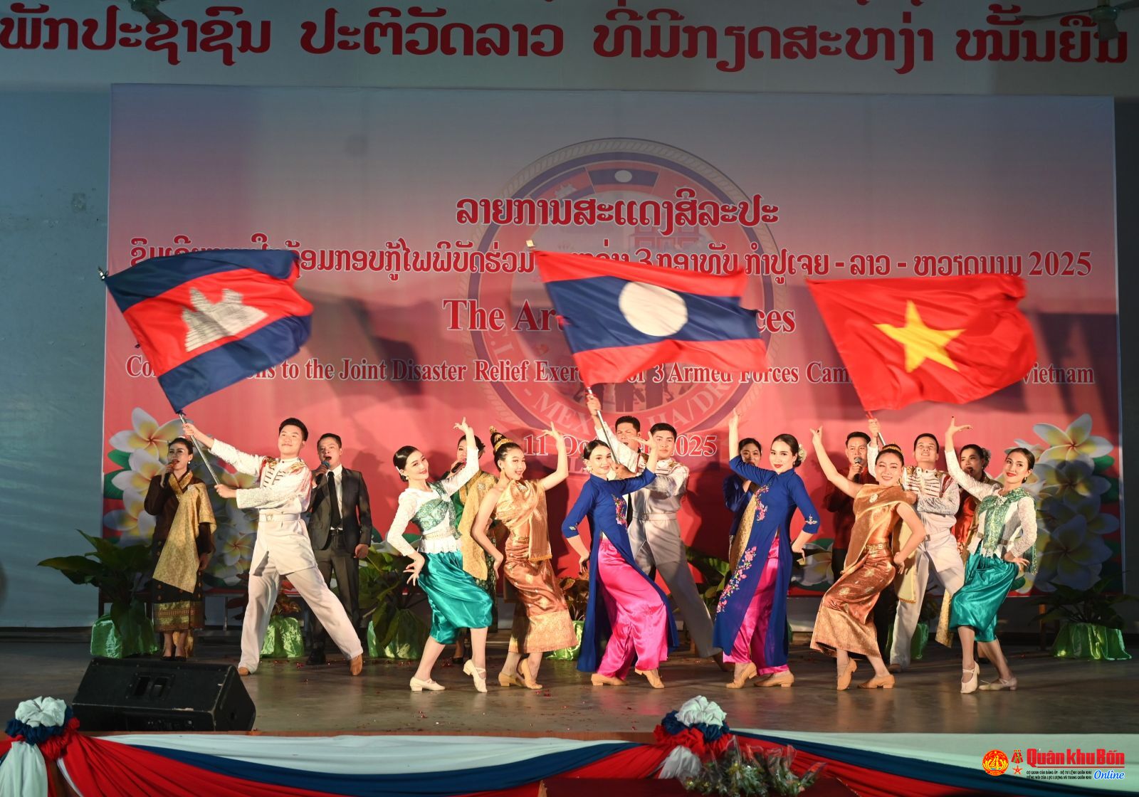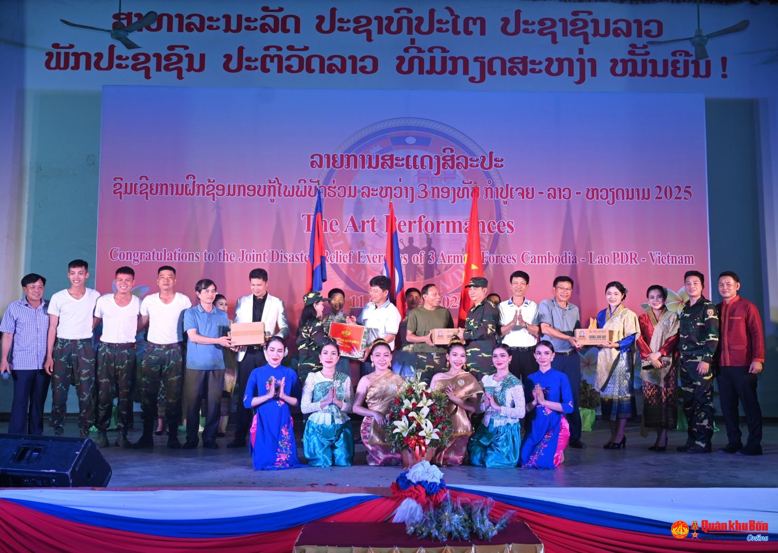 Cũng trong tối ngày 11/10, tại Học viện Hậu cần QĐND Lào, Đoàn Văn công Quân đội Lào đã tổ chức buổi biểu diễn chương trình nghệ thuật đặc sắc phục vụ cán bộ, chiến sỹ Quân đội ba nước Lào – Việt Nam – Campuchia tham gia diễn tập cứu hộ, cứu nạn năm 2024 tại Lào.