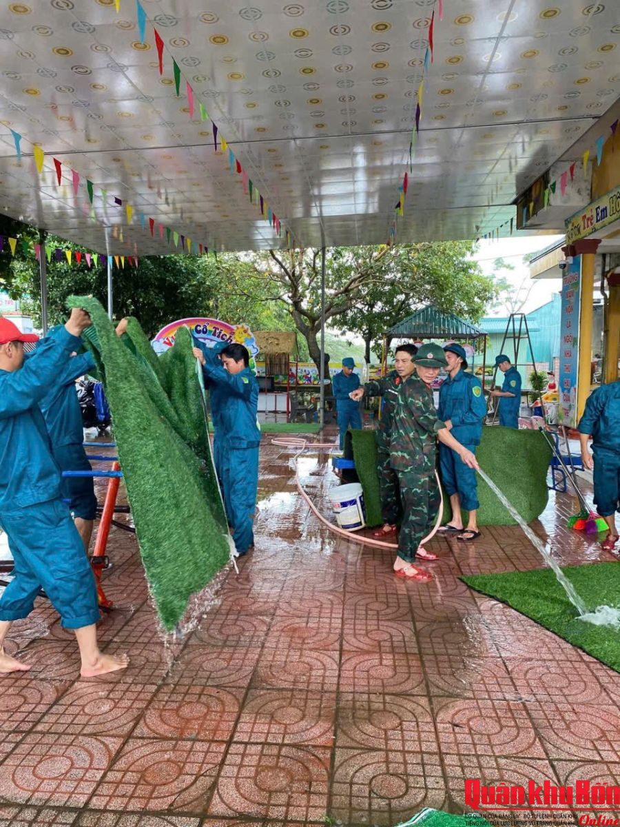 Từ sáng sớm, tại Trường mầm non Hải Thành, xã Diên Sanh, lực lượng Ban Chỉ huy phòng thủ khu vực 4 – Triệu Phong cùng dân quân tự vệ và giáo viên đã có mặt, bắt tay ngay vào công tác dọn dẹp vệ sinh. Áp dụng phương châm “4 tại chỗ”, công tác khắc phục hậu quả được triển khai khẩn trương, đồng bộ. Những phòng và thiết bị dạy học được cọ rửa sạch sẽ; hệ thống điện, nước được kiểm tra kỹ lưỡng để đảm bảo an toàn trước khi đón trẻ trở lại trường.