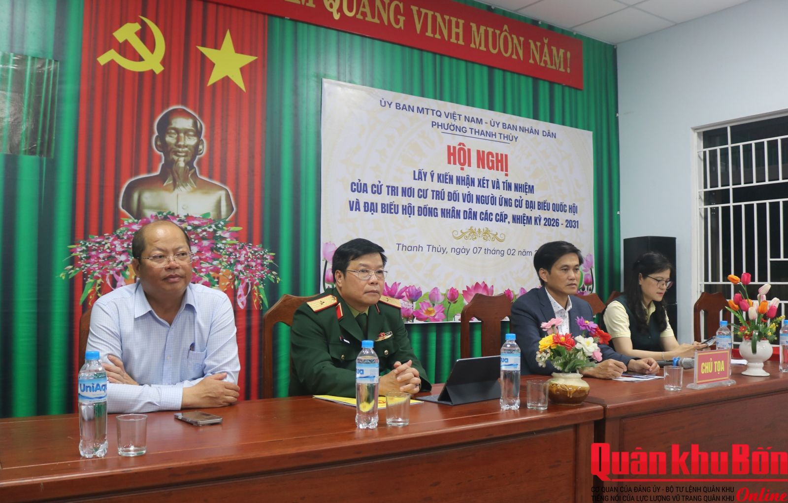 Tại hội nghị, đại diện Ban Thường trực Ủy ban MTTQ Việt Nam phường Thanh Thủy đã quán triệt mục đích, yêu cầu của hội nghị và các tiêu chuẩn đối với đại biểu Quốc hội theo quy định của Luật Bầu cử. Tiếp đó, hội nghị đã nghe tóm tắt tiểu sử, quá trình công tác của Thiếu tướng Ngô Nam Cường, đồng chí Phó Tư lệnh Quân khu được Ban Thường vụ Quân ủy Trung ương, Bộ Quốc phòng và Đảng ủy, Bộ Tư lệnh Quân khu 4 giới thiệu ứng cử ĐBQH khóa XVI.