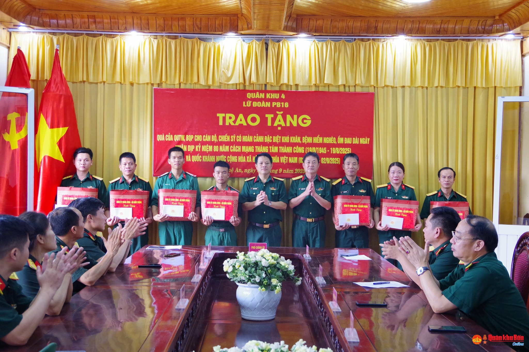 Nhân dịp kỷ niệm 80 năm Quốc khánh nước Cộng hòa xã hội chủ nghĩa Việt Nam (2/9/1945 - 2/9/2025), sáng ngày 01/9/2025, Lữ đoàn Pháo binh 16 tổ chức trao quà của Quân ủy Trung ương, Bộ Quốc phòng tặng quân nhân có hoàn cảnh đặc biệt khó khăn, bệnh hiểm nghèo, ốm đau dài ngày. Đồng chí Đại tá Nguyễn Bá Thủy, Lữ đoàn trưởng và đồng chí Thượng tá Đặng Thanh Hồng, Phó Chính ủy Lữ đoàn trao quà tặng các quân nhân.