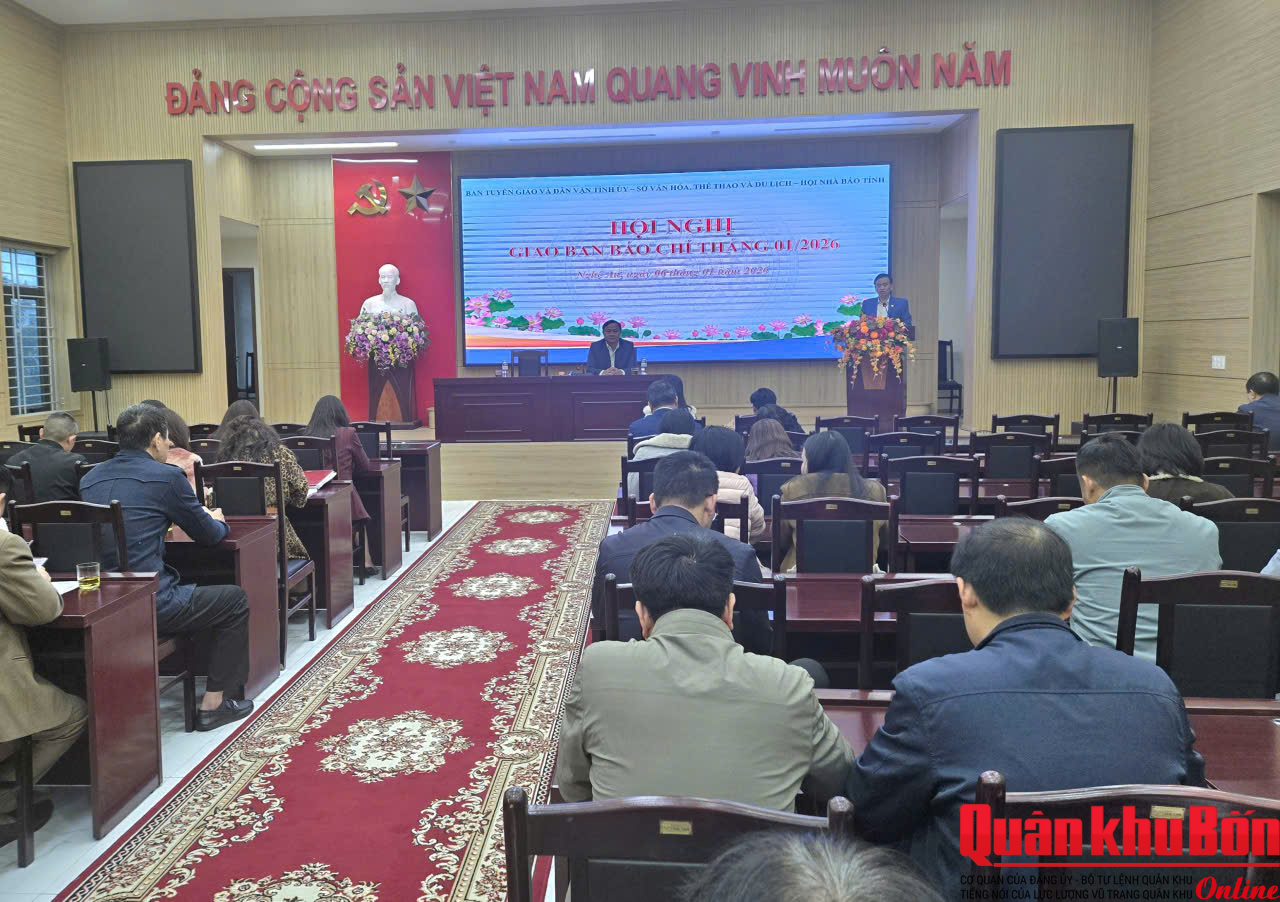 Ngày 6/1/2026, Ban Tuyên giáo và Dân vận Tỉnh ủy, Sở Văn hóa - Thể thao và Du lịch và Hội Nhà báo tỉnh Nghệ An tổ chức Hội nghị Giao ban báo chí tháng 1 năm 2026. Đồng chí Phạm Ngọc Cảnh, Phó Trưởng ban Tuyên giáo và Dân vận Tỉnh ủy; đồng chí Nguyễn Bá Hảo, Phó Giám đốc Sở Văn hóa - Thể thao và Du lịch tỉnh Nghệ An đồng chủ trì Hội nghị. Tham dự Hội nghị có đại diện các cơ quan thông tấn báo chí Trung ương, địa phương trên địa bàn tỉnh Nghệ An.