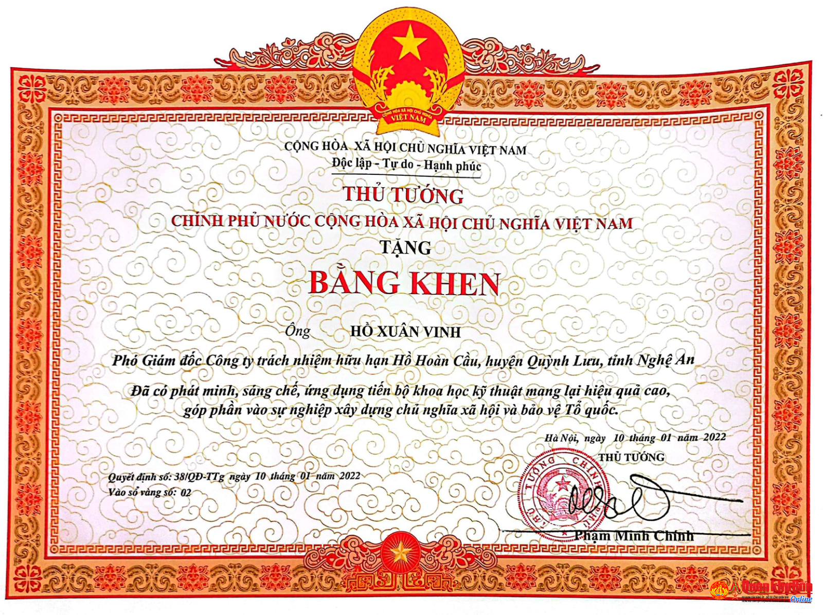 Trình bày xong ý tưởng, Chi bộ vỗ tay ủng hộ sáng kiến của anh. Nói là làm, năm 2017, sau một thời gian mày mò nghiên cứu, sáng tạo, cuối cùng Hồ Xuân Vinh đã chế tạo thành công máy ép gạch không nung, tận thu các phế phẩm từ bột đá ở các mỏ đá trên địa bàn để sản xuất gạch bê tông. Sáng kiến đạt giải Nhất cuộc thi Sáng tạo Khoa học Công nghệ tỉnh Nghệ An năm 2017. Người dân từ thấy xây bằng gạch bê tông hiệu quả, chi phí hợp lý, thì dần dần chuyển sang mua máy làm gạch bán, nhờ đó, máy ép gạch được sản xuất số lượng lớn, bán rộng rãi trên 34 tỉnh, thành cả nước và xuất khẩu ra nước ngoài.
