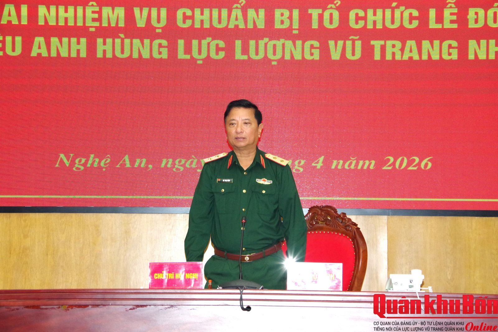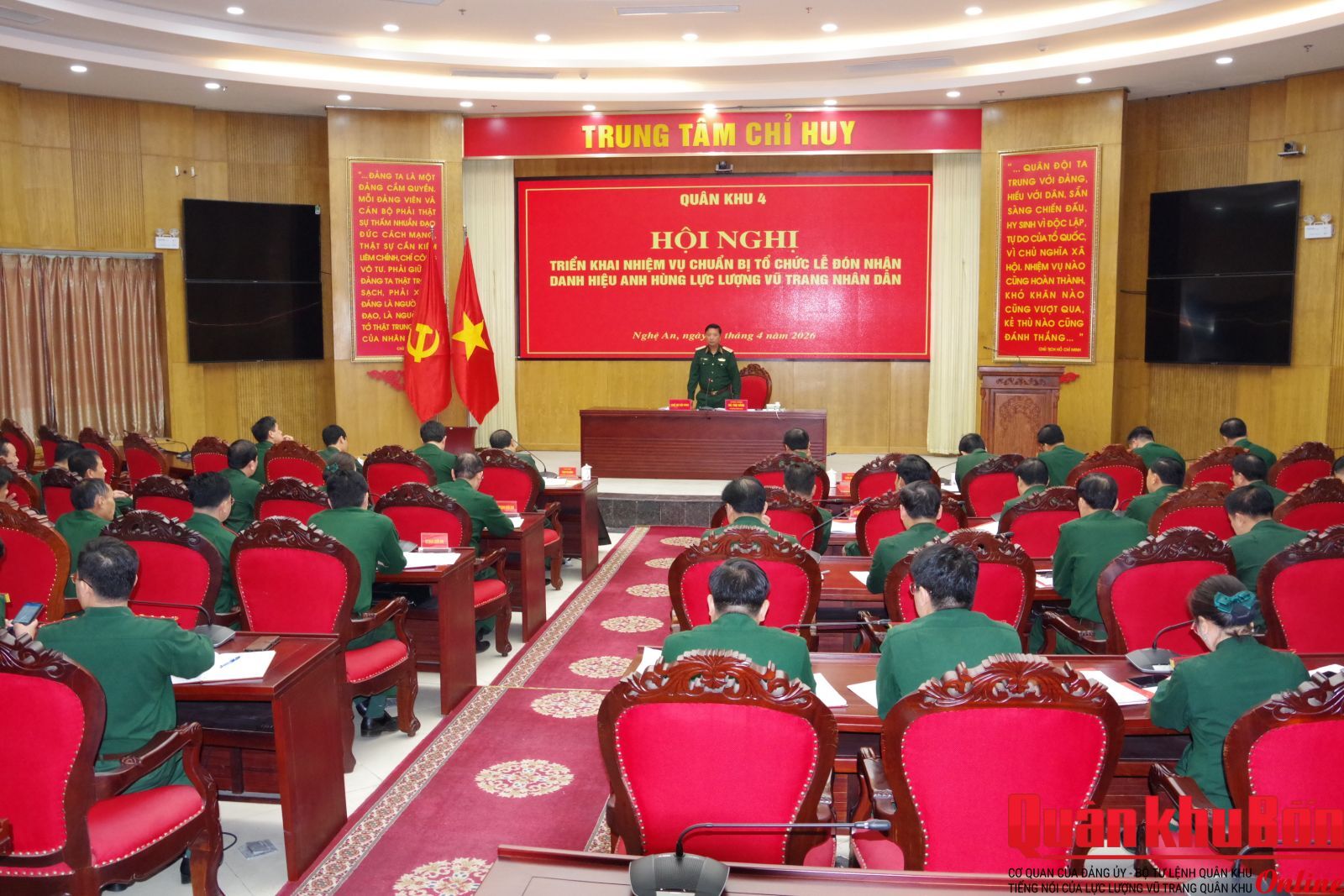 Sáng 6/4/2026, Quân khu 4 tổ chức Hội nghị triển khai nhiệm vụ chuẩn bị Lễ đón nhận Danh hiệu Anh hùng Lực lượng vũ trang (LLVT) nhân dân. Trung tướng Hà Thọ Bình, Tư lệnh Quân khu chủ trì hội nghị. Tham dự hội nghị có Thiếu tướng Lê Hồng Nhân, Phó Tư lệnh, Tham mưu trưởng Quân khu; Thiếu tướng Phạm Văn Đông, Chủ nhiệm Chính trị Quân khu; thủ trưởng các cơ quan Quân khu.