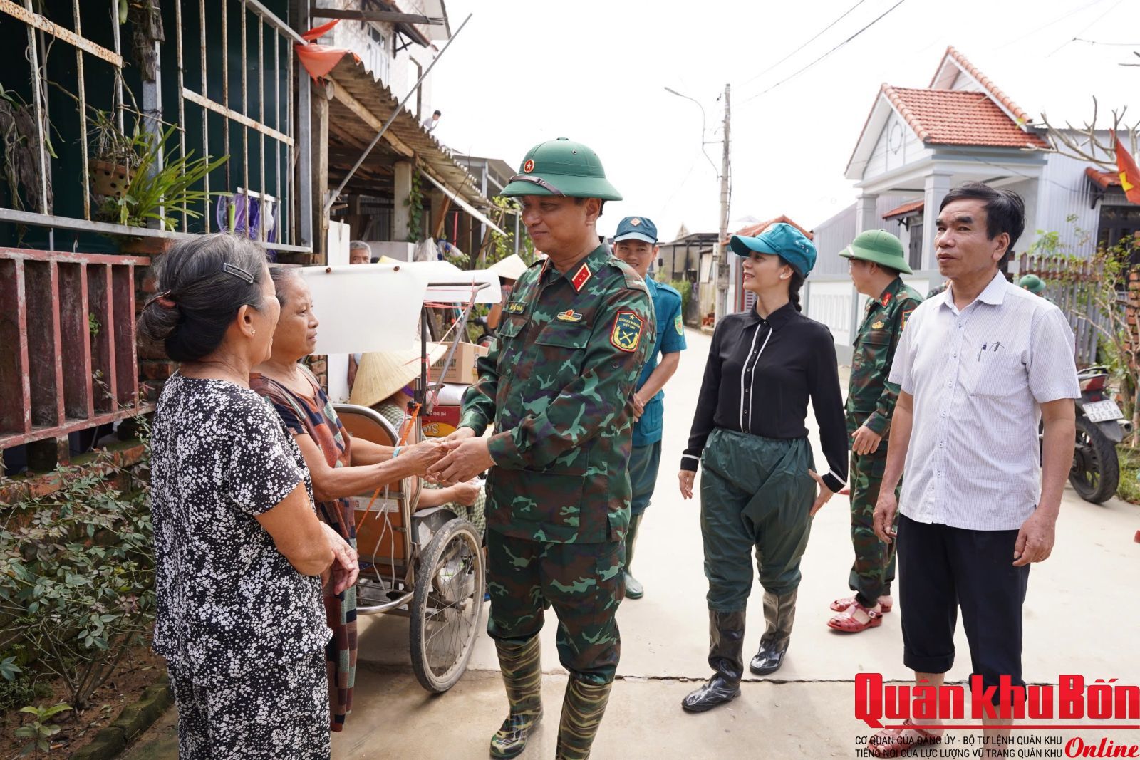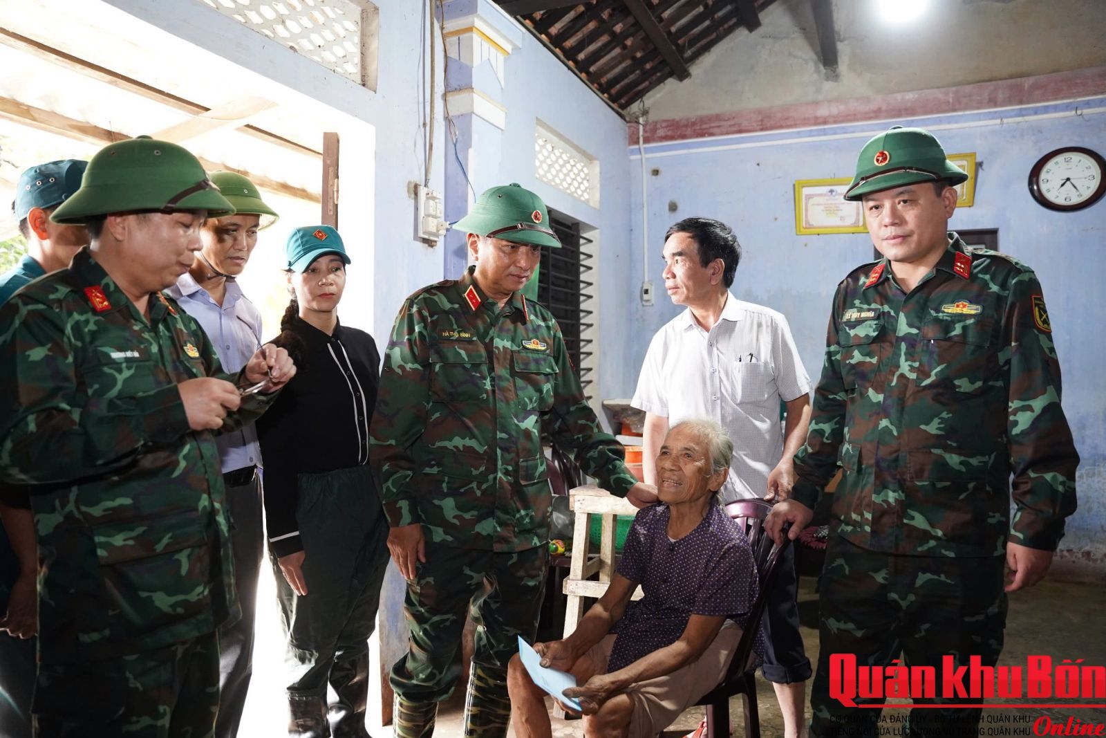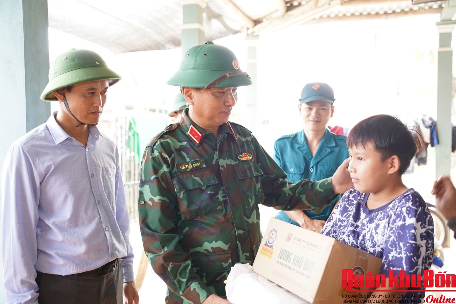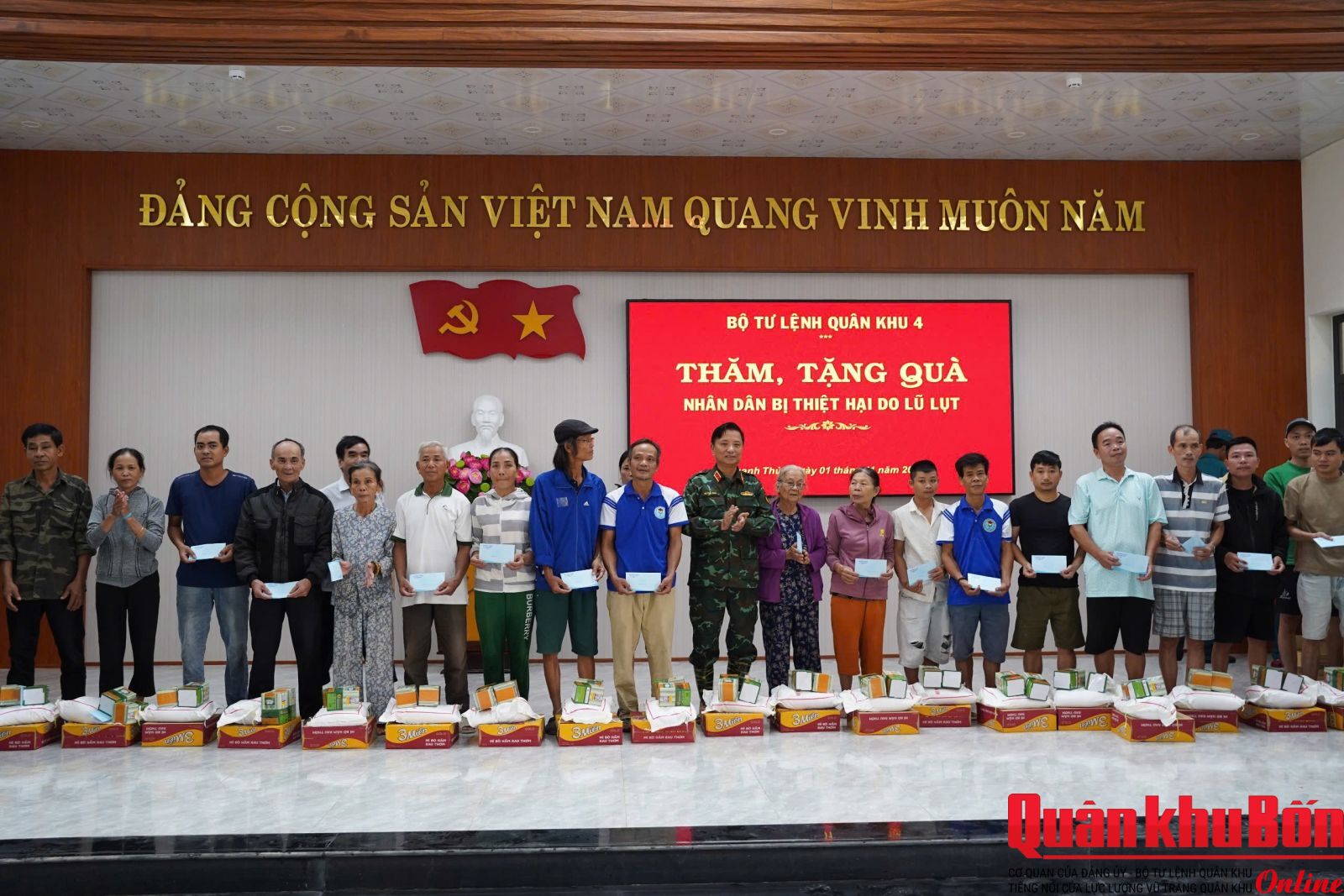Chia sẻ với khó khăn của nhân dân địa phương, Trung tướng Hà Thọ Bình, Tư lệnh Quân khu 4 đã trực tiếp đến thăm hỏi, động viên và trao quà hỗ trợ cho các hộ gia đình chính sách, hộ neo đơn, hộ có hoàn cảnh đặc biệt khó khăn. Đoàn công tác Quân khu 4 đã trao tặng 2,5 tấn gạo, 5 tạ lương khô, 250 thùng mì tôm cùng nhiều nhu yếu phẩm thiết yếu và tiền mặt giúp bà con sớm ổn định cuộc sống, khắc phục hậu quả sau mưa lũ.
