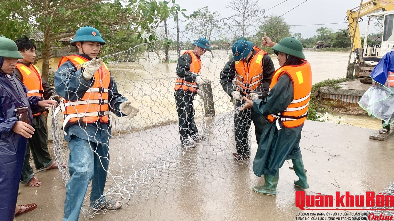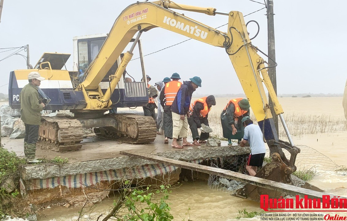 Trong ngày, tại các điểm bị sạt lở, Bộ CHQS thành phố Huế cũng đã chỉ đạo các Ban Chỉ huy phòng thủ khu vực huy động lực lượng để khắc phục. Tại đoạn đê nối từ thôn Niêm Phò, xã Quảng Điền đến thôn Nho Lâm, xã Đan Điền vừa bị sạt trôi một đoạn dài, hở hàm ếch rộng phía dưới chân, gây chia cắt giao thông hoàn toàn. Ban Chỉ huy phòng thủ khu vực 1 - Hương Trà, Ban CHQS xã Quảng Điền nhanh chóng huy động lực lượng tham gia khắc phục sự cố, tổ chức rào chắn cảnh báo; các lực lượng đã dùng đá hộc to, các loại rọ đá để vá đê, ngăn chặn không để đê sạt trôi và mở hàm ếch rộng thêm.