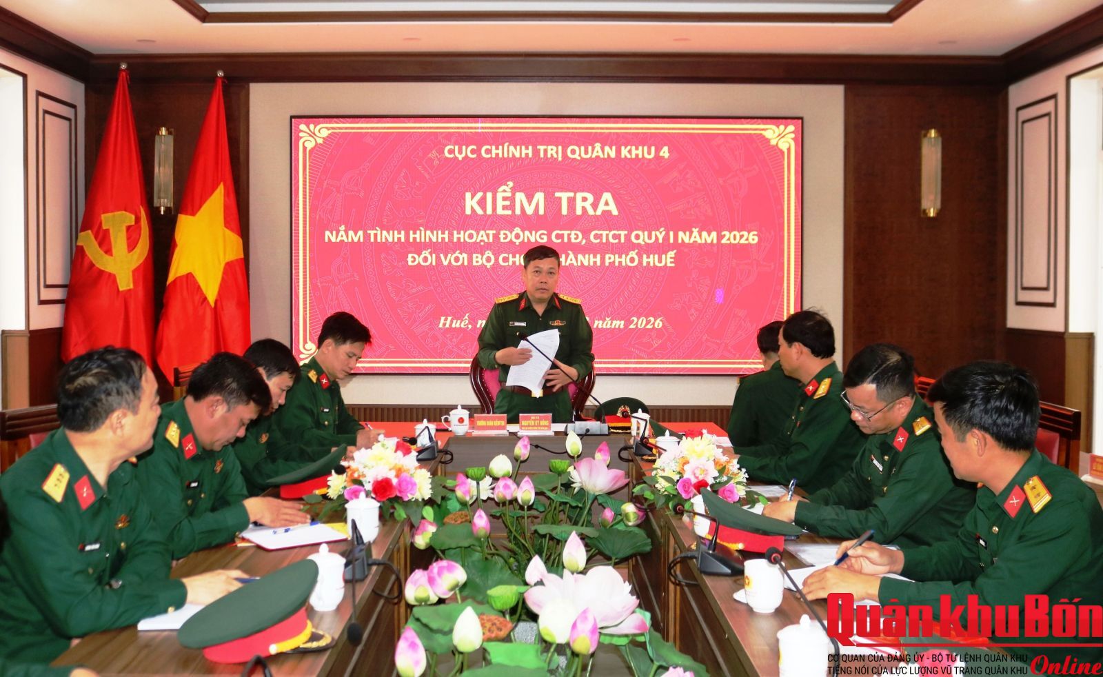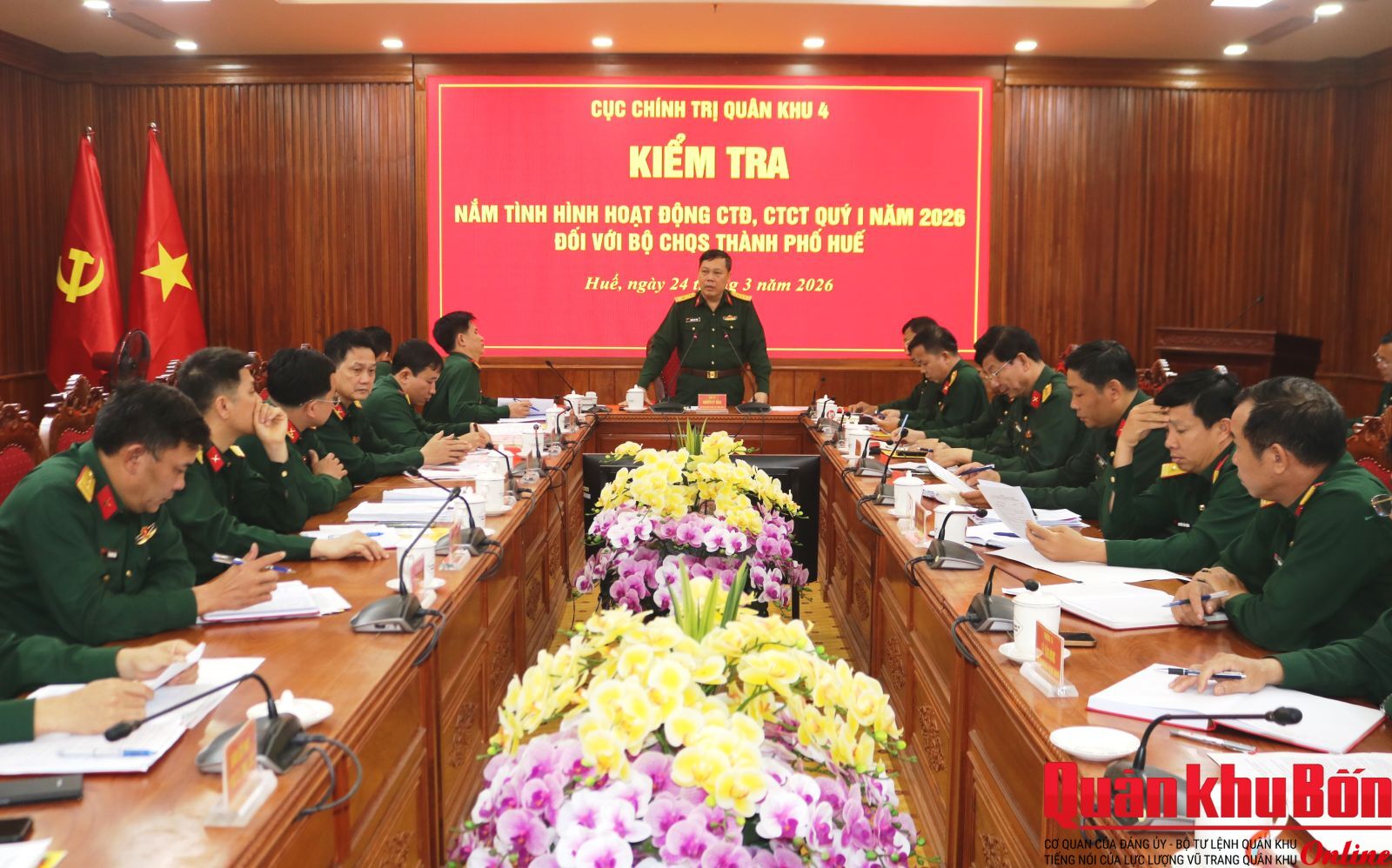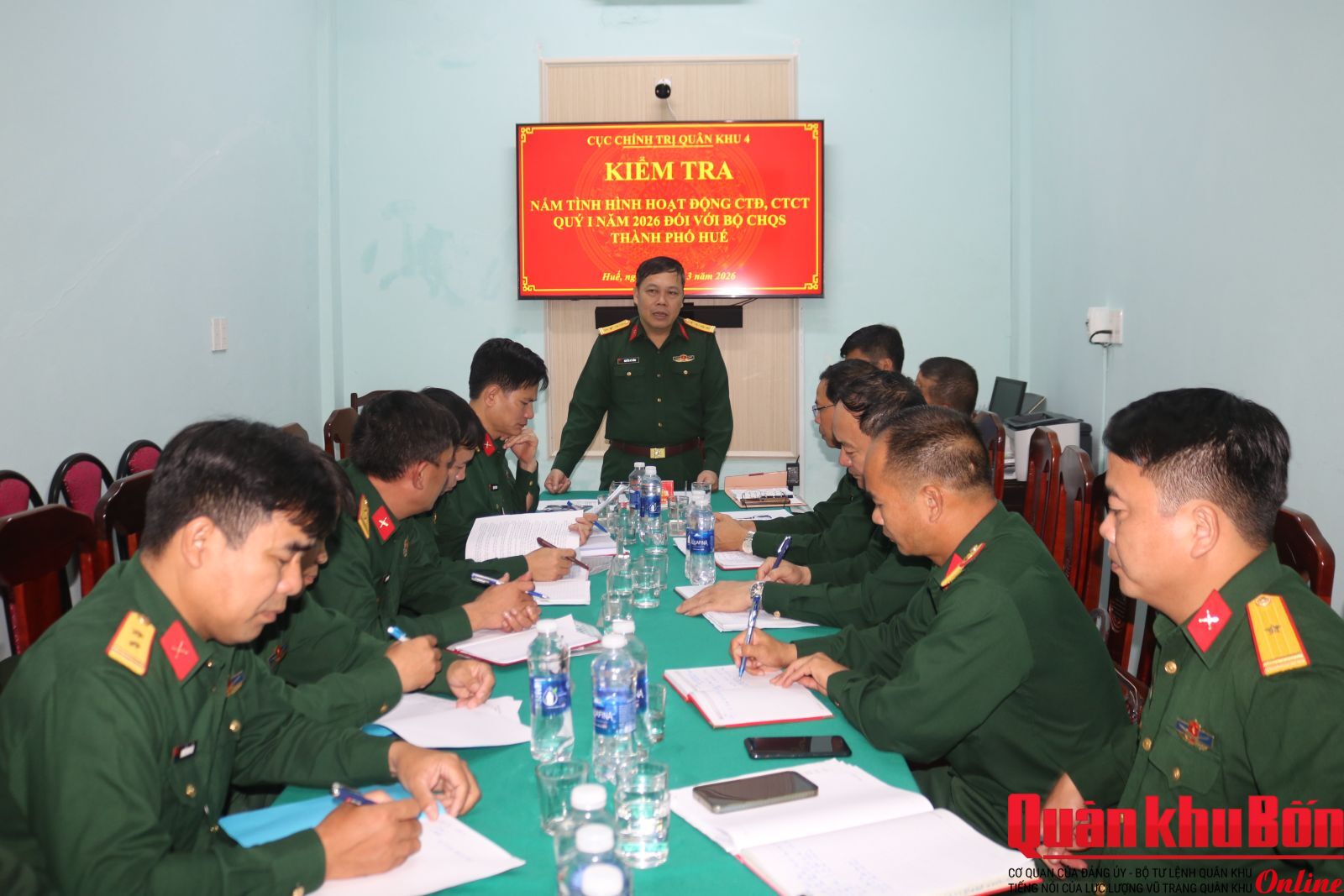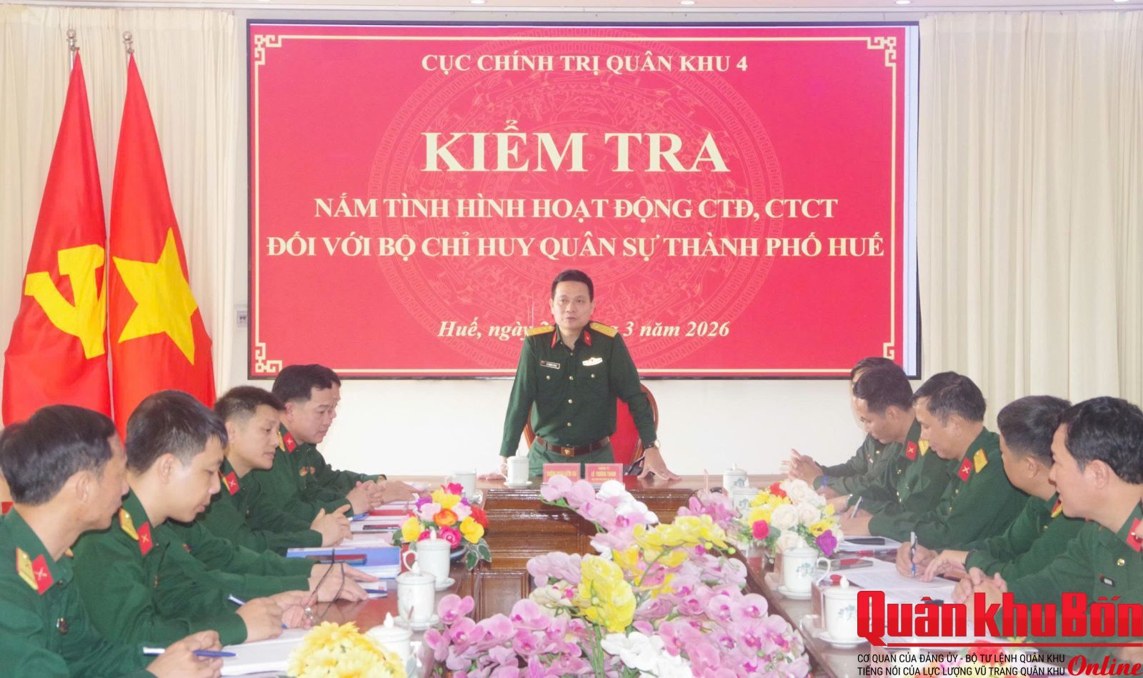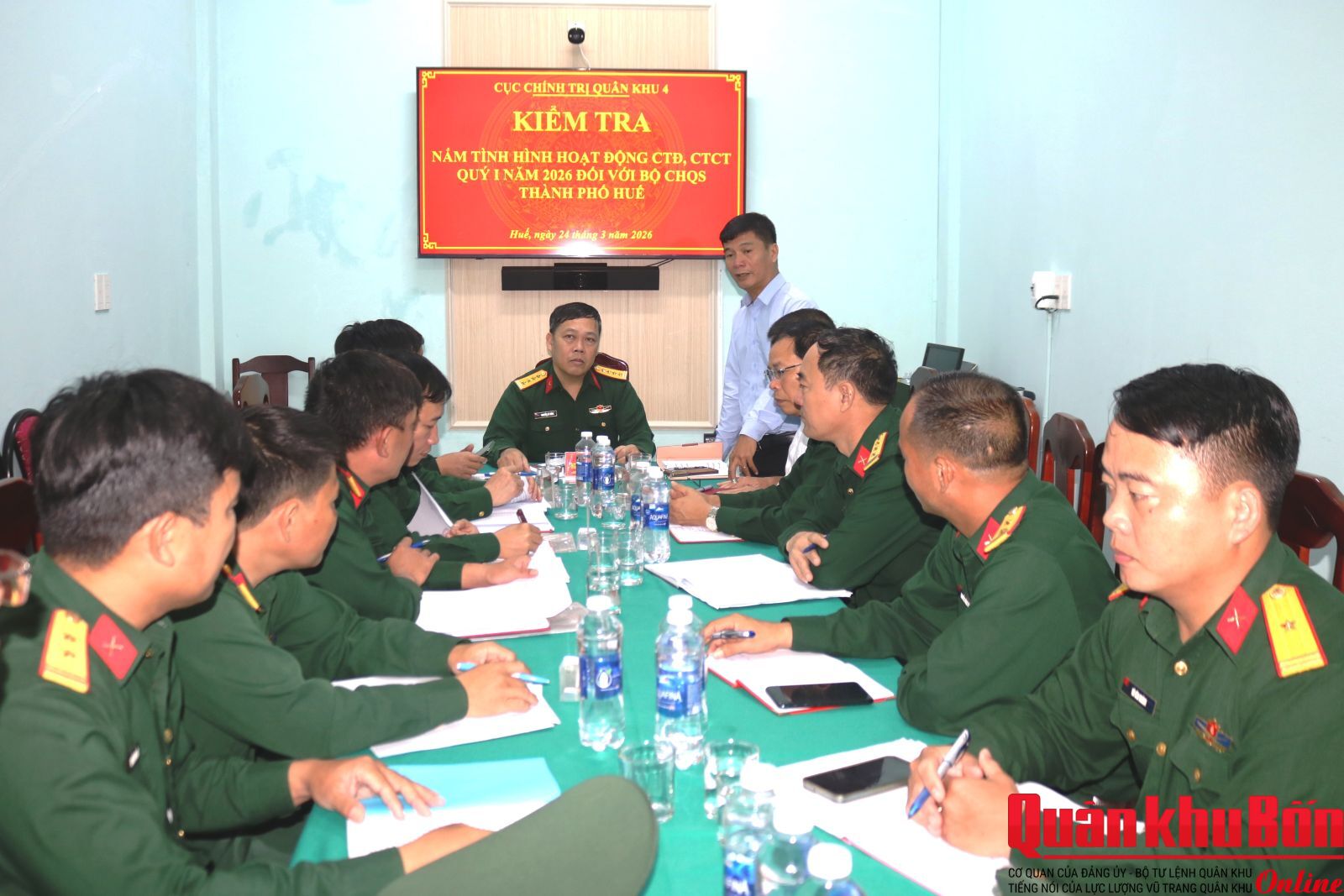 Ngày 24/3/2026, đồng chí Đại tá Nguyễn Kỳ Hồng, Phó Chủ nhiệm Chính trị Quân khu, dẫn đầu đoàn công tác Quân khu 4 đã tiến hành kiểm tra, nắm tình hình hoạt động công tác Đảng, công tác chính trị (CTĐ, CTCT) quý 1 năm 2026 tại Bộ Chỉ huy Quân sự (CHQS) thành phố Huế. Chủ trì làm việc với đoàn công tác Quân khu có Đại tá Phan Thắng, Chỉ huy trưởng; Đại tá Trương Viết Hải, Chỉnh ủy Bộ CHQS thành phố Huế.