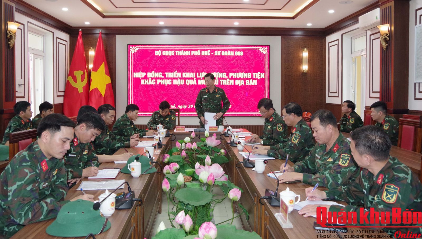 Thực hiện chỉ đạo Bộ Tư lệnh Quân khu 4 để kịp thời giúp nhân dân Thành phố Huế khắc phục hậu quả mưa lũ, Quân khu sẽ điều động hơn 500 cán bộ, chiến sĩ của Sự đoàn 968 cùng phương tiện để tham gia khắc phục hậu quả mưa lũ. Tại buổi hiệp đồng Bộ CHQS thành phố và Sư đoàn 968 đã cùng hiệp đồng và thống nhất việc triển khai lực lượng để giúp nhân dân, theo đó trước mắt sẽ tập trung khắc phục những khu vực nước đã rút và nơi có lượng rác thải, bùn đất lớn như Phường Phong Phú, Phong Dinh, Phong Điền và một số khu vực tại Trung tâm Thành phố Huế …