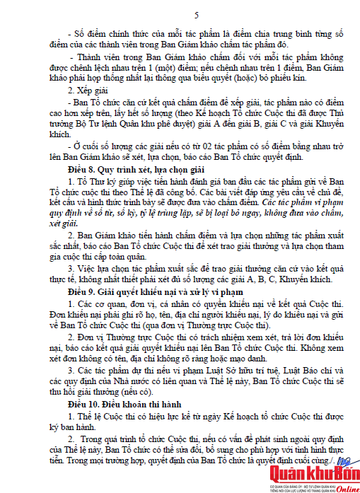 Cơ quan Thường trực Ban Tổ chức Cuộc thi cấp Quân khu tiếp nhận tác phẩm dự thi, tổ chức chấm, hoàn thành trước ngày 15/5/2026; lựa chọn các tác phẩm xuất sắc báo cáo Ban Tổ chức xét giải thưởng và lựa chọn tham gia cấp toàn quân theo quy định.