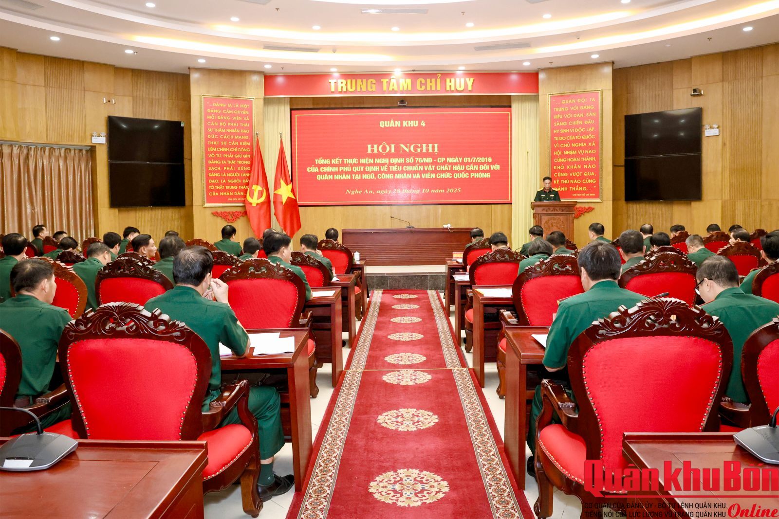 Chiều ngày 28/10/2025, Quân khu 4 tổ chức Hội nghị Tổng kết thực hiện Nghị định số 76/2016/NĐ-CP ngày 1/7/2016 của Chính phủ quy định về tiêu chuẩn vật chất hậu cần đối với quân nhân tại ngũ, công nhân và viên chức quốc phòng. Thiếu tướng Hà Như Lợi, Phó Chủ nhiệm Tổng cục Hậu cần - Kỹ thuật dự và phát biểu chỉ đạo. Đại tá Ngô Nam Cường, Phó Tư lệnh Quân khu chủ trì hội nghị. Tham dự hội nghị có đại biểu cơ quan chức năng Tổng cục Hậu cần - Kỹ thuật; Thủ trưởng các cơ quan khu; lãnh đạo, chỉ huy, cơ quan hậu cần các cơ quan, đơn vị trong toàn Quân khu.