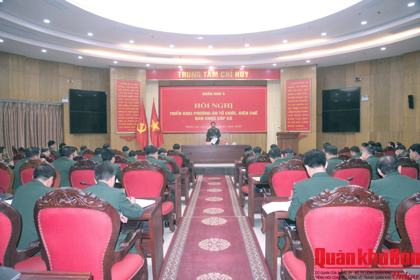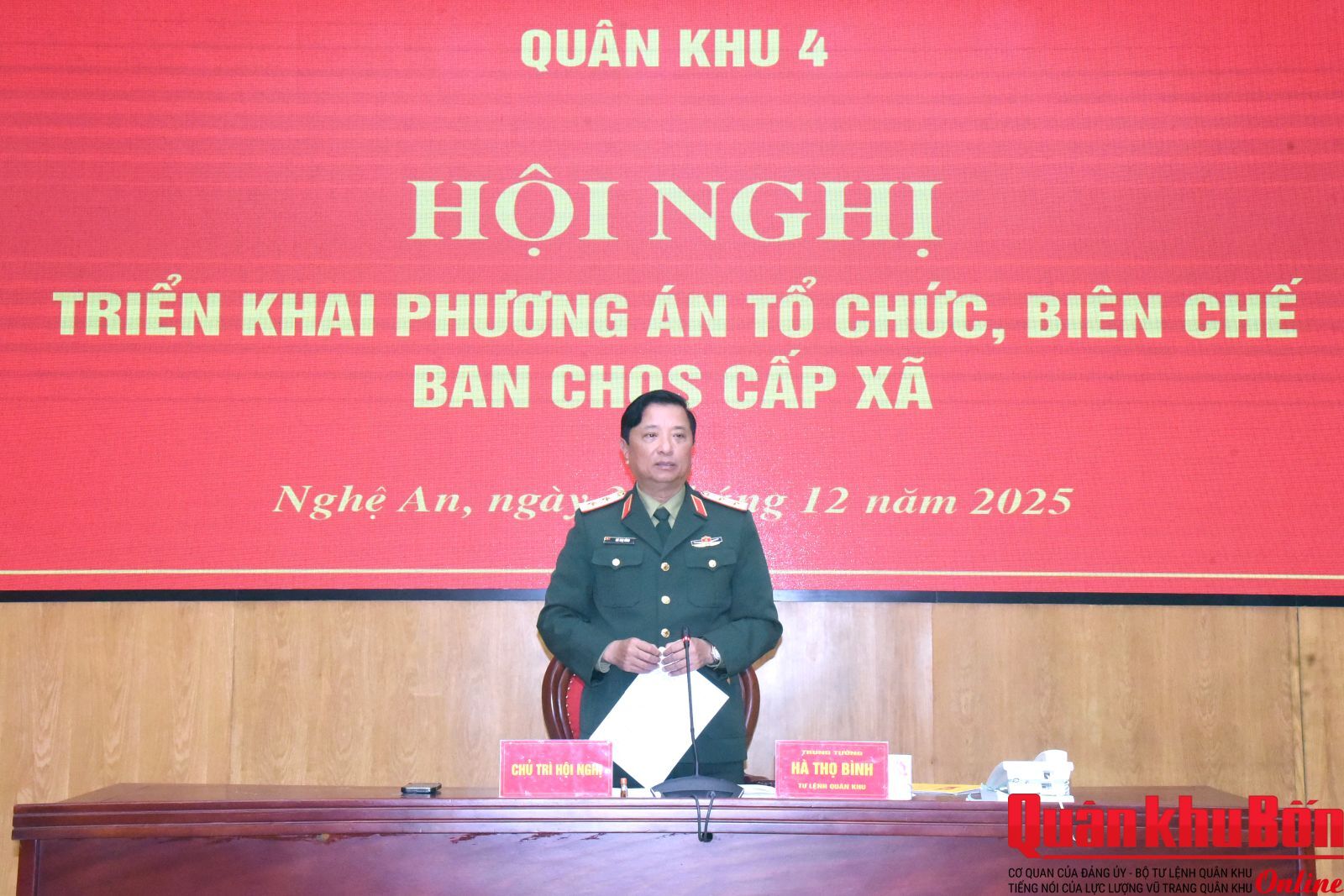 Sáng 31/12/2025, Quân khu 4 tổ chức Hội nghị triển khai phương án tổ chức, biên chế Ban Chỉ huy Quân sự (CHQS) cấp xã. Trung tướng Hà Thọ Bình, Tư lệnh Quân khu chủ trì hội nghị. Dự hội nghị có Thiếu tướng Đoàn Xuân Bường, Chính ủy Quân khu; các đồng chí trong Thường vụ Đảng ủy, Thủ trưởng Bộ Tư lệnh; thủ trưởng các cơ quan, đơn vị trong toàn Quân khu.