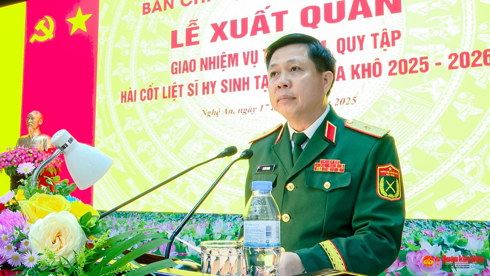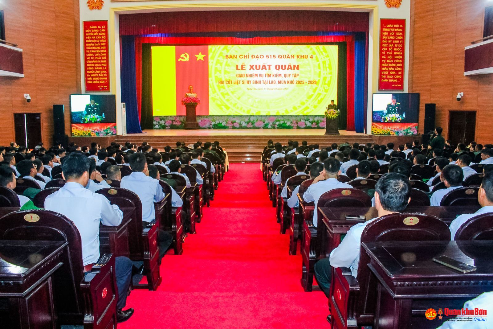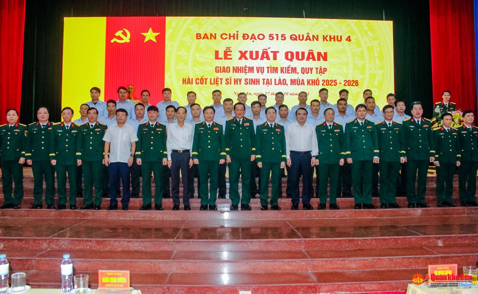 Sáng ngày 17/10/2025, Ban Chỉ đạo 515 Quân khu 4 tổ chức Lễ xuất quân giao nhiệm vụ tìm kiếm, quy tập hài cốt liệt sĩ hy sinh tại Lào, mùa khô 2025-2026. Thượng tướng Võ Minh Lương, Ủy viên Trung ương Đảng, Ủy viên Thường vụ Quân ủy Trung ương, Thứ trưởng Bộ Quốc phòng, Phó trưởng Ban Chỉ đạo quốc gia 515 dự, phát biểu giao nhiệm vụ.