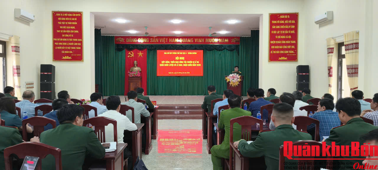 Chiều 24/2/2026, Ban Chỉ huy Phòng thủ khu vực (PTKV) 4 - Tương Dương (Bộ CHQS tỉnh Nghệ An) tổ chức Hội nghị hiệp đồng, triển khai nhiệm vụ giao, nhận quân và Lễ ra quân huấn luyện năm 2026. Thượng tá Lô Thanh Như, Ủy viên Ban Chấp hành Đảng ủy Quân sự tỉnh, Chỉ huy trưởng Ban Chỉ huy PTKV4 - Tương Dương chủ trì hội nghị.