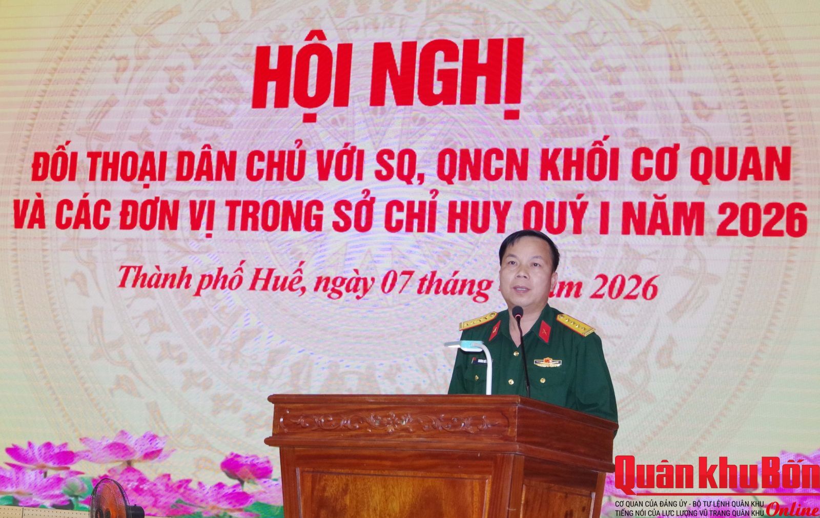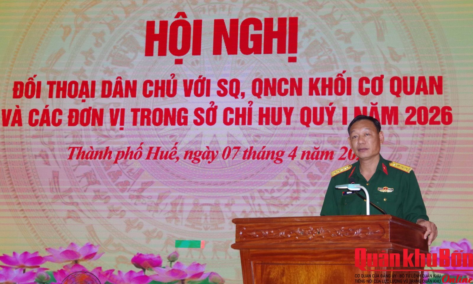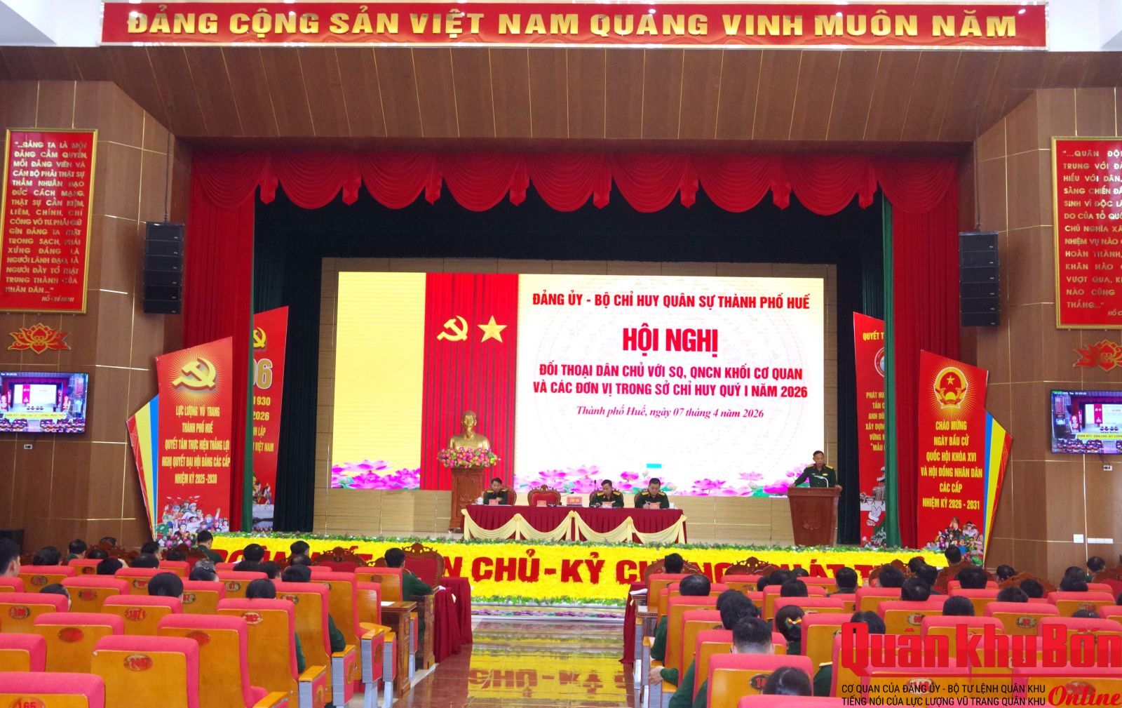 Chiều 7/4/2026, Đảng ủy, Bộ Chỉ huy Quân sự thành phố Huế tổ chức đối thoại dân chủ với sĩ quan, quân nhân chuyên nghiệp khối cơ quan và các đơn vị trực thuộc nhằm kịp thời nắm bắt tâm tư, nguyện vọng của cán bộ, nhân viên. Đại tá Phan Thắng, Ủy viên Ban Thường vụ Thành ủy, Chỉ huy trưởng và Đại tá Trương Viết Hải, Thành ủy viên, Chính ủy Bộ Chỉ huy Quân sự thành phố đồng chủ trì đối thoại.