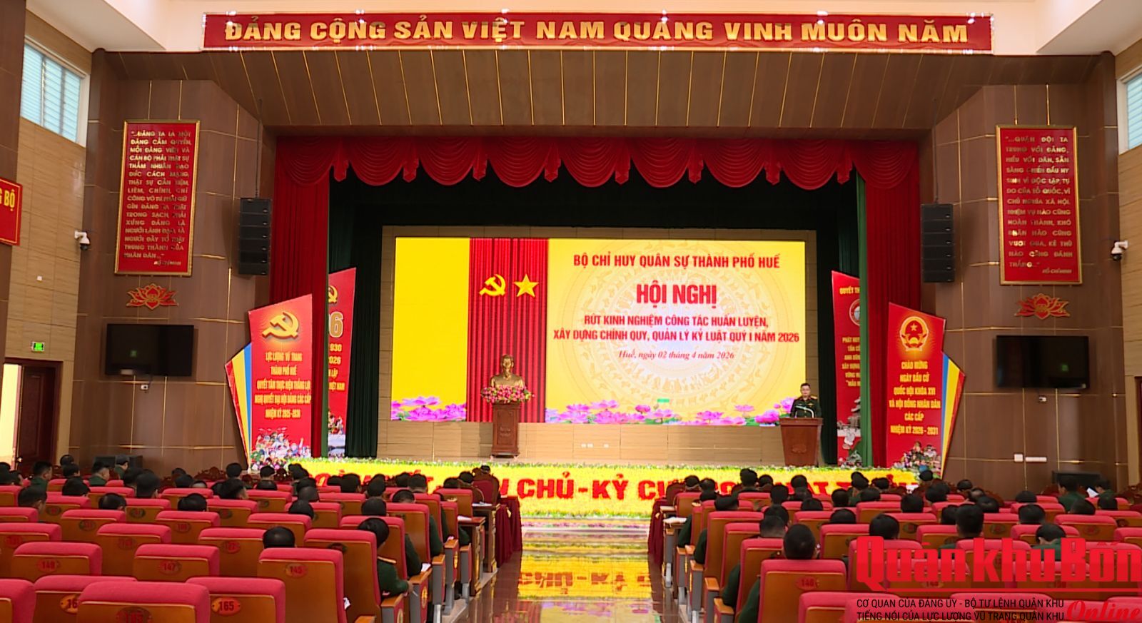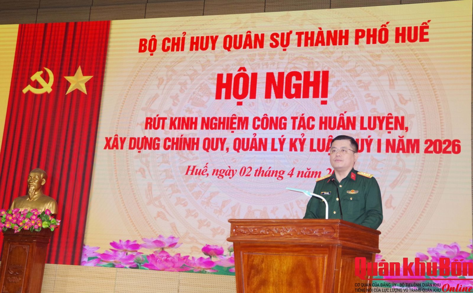 Sáng 02/4/2026, Bộ Chỉ huy Quân sự (CHQS) thành phố Huế tổ chức hội nghị rút kinh nghiệm công tác huấn luyện; xây dựng chính quy, quản lý kỷ luật quý I năm 2026. Đại tá Lê Huy Nghĩa, Phó Chỉ huy trưởng, Tham mưu trưởng Bộ CHQS thành phố chủ trì hội nghị.