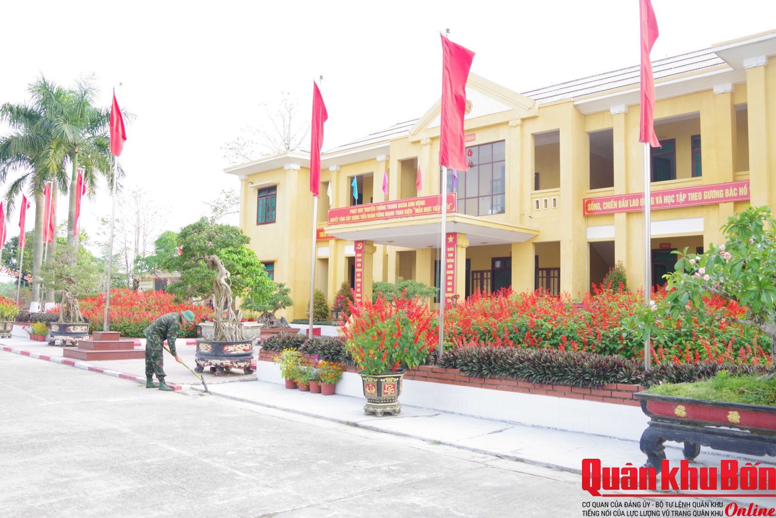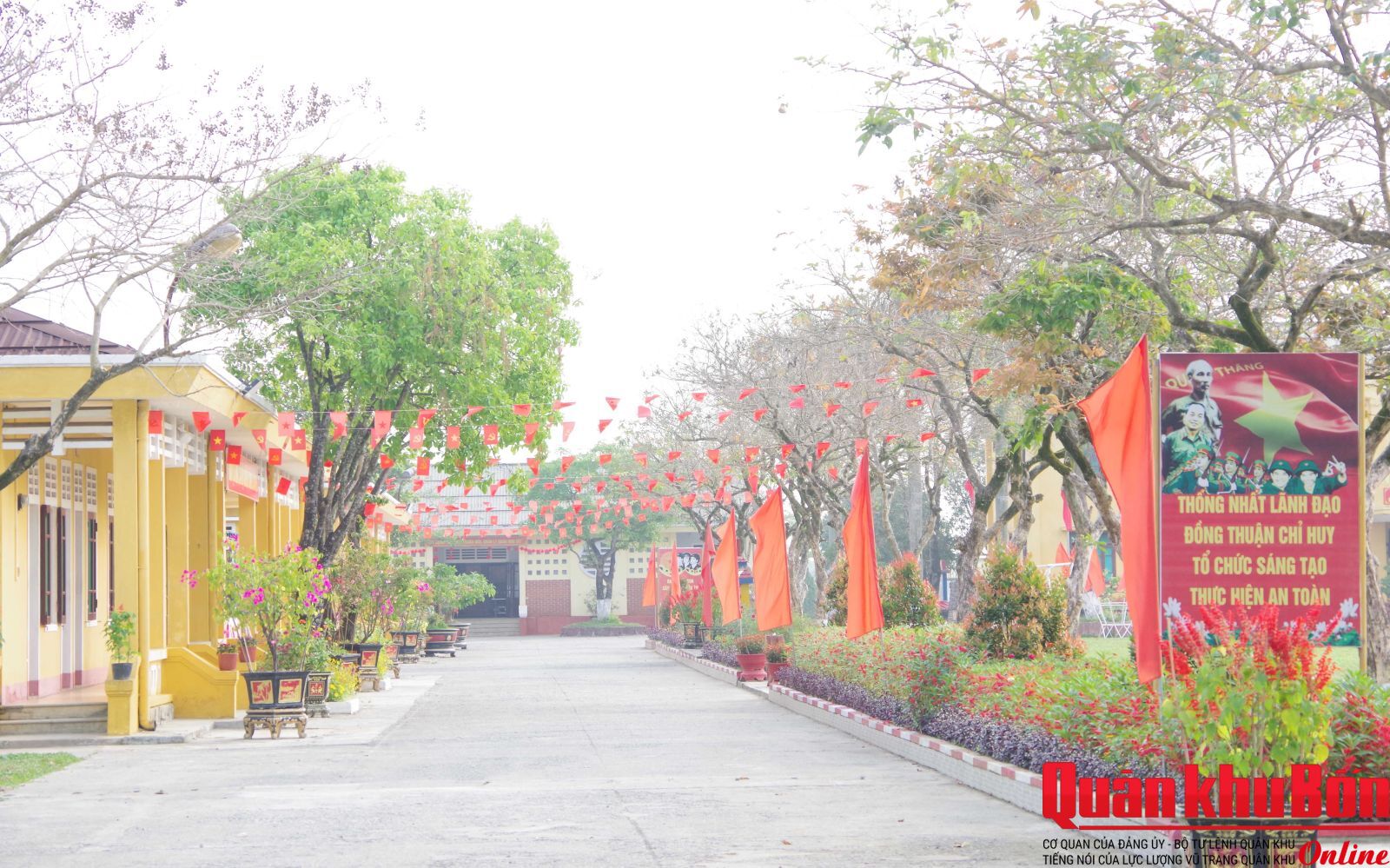 Hệ thống khẩu hiệu, cờ hoa, pa-nô, áp phích được bố trí trang trọng từ cổng chính đến khuôn viên các đại đội. Tranh thủ thời tiết thuận lợi, đơn vị tập trung chăm sóc, chỉnh trang cảnh quan, vườn hoa, cây xanh sau dịp nghỉ Tết. Các phòng ở, phòng sinh hoạt được vệ sinh sạch sẽ, sắp xếp gọn gàng; quân tư trang như cầu vai, quân hàm và các vật dụng sinh hoạt thiết yếu được chuẩn bị đầy đủ, bảo đảm sẵn sàng cấp phát cho chiến sĩ mới.