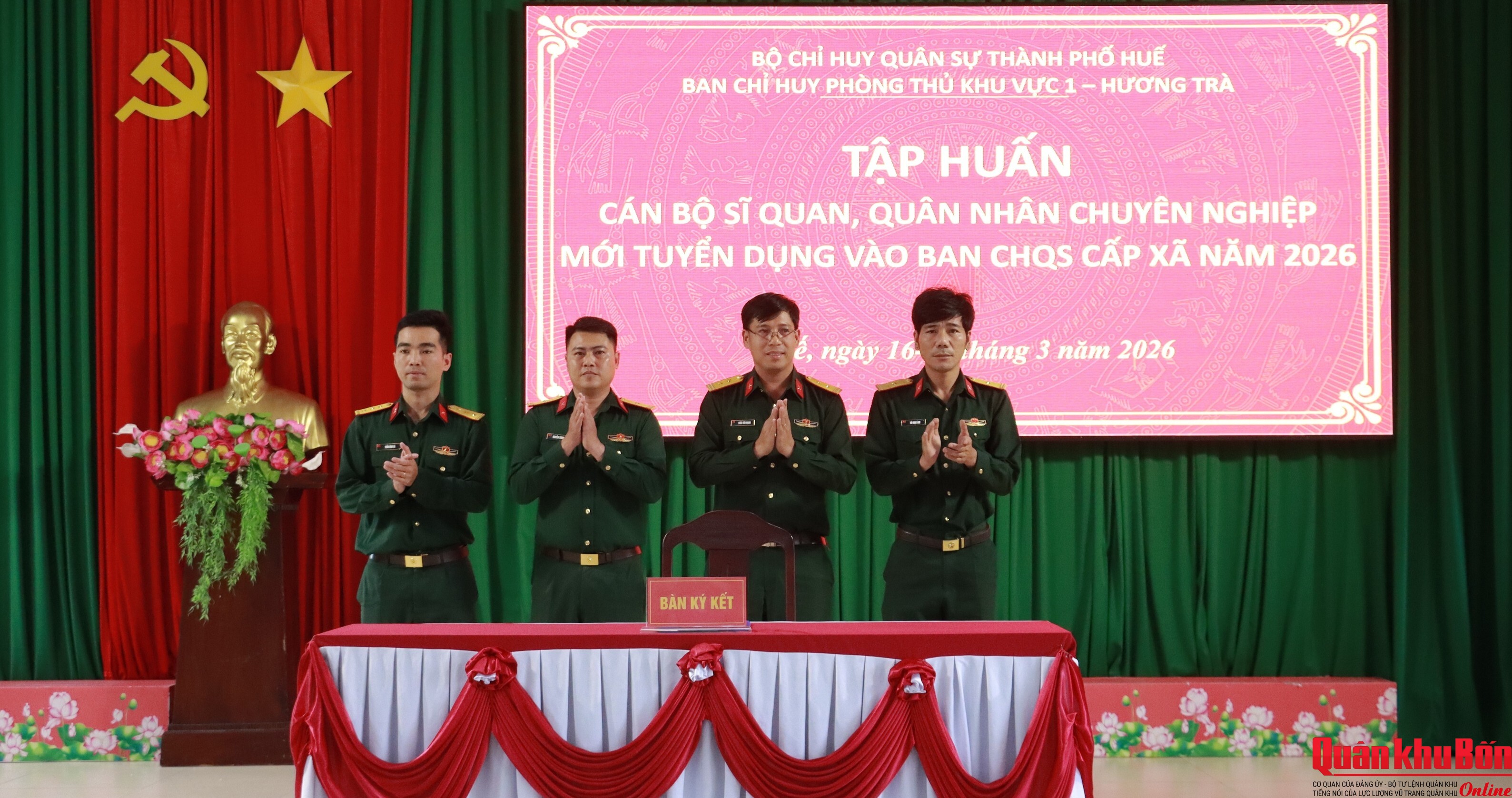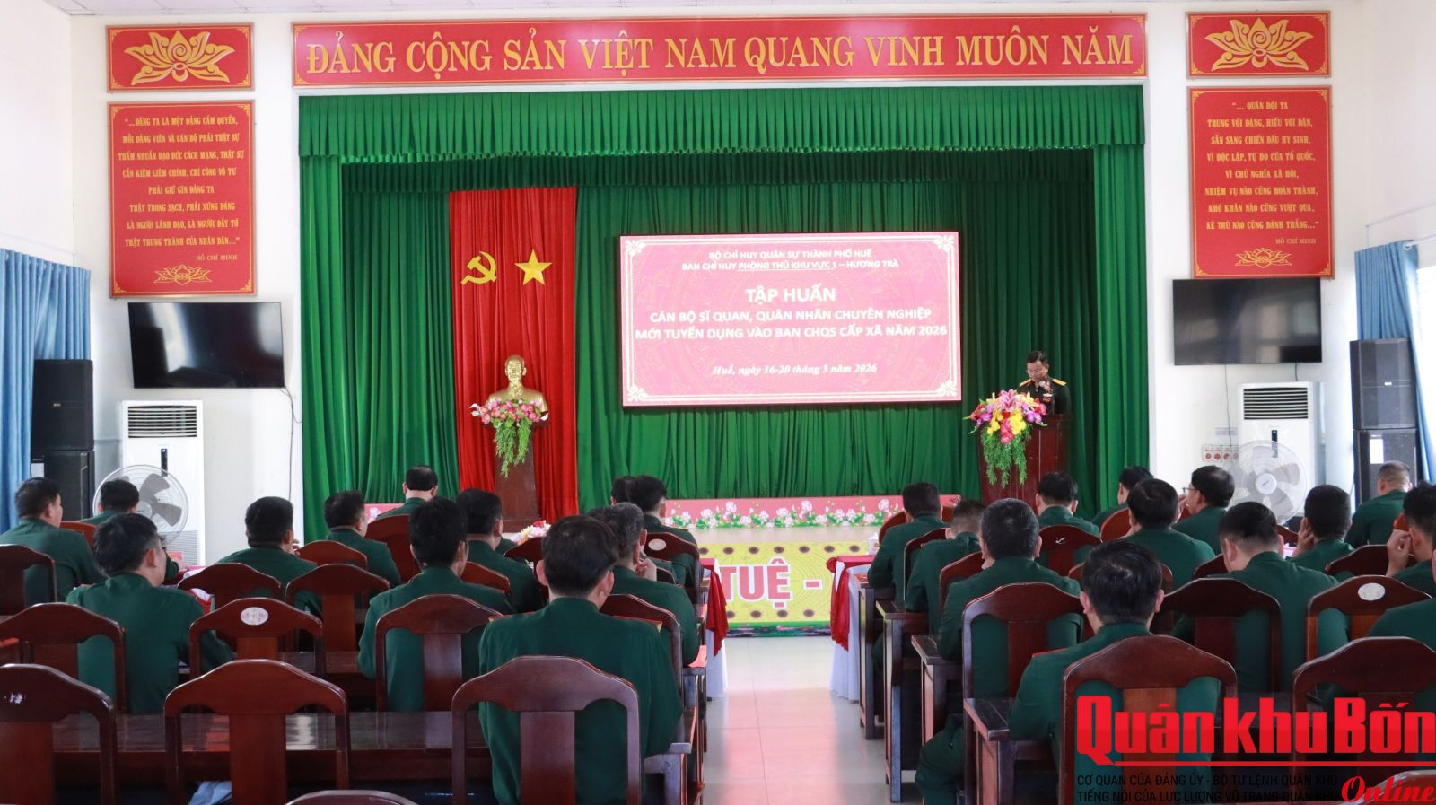 Bộ Chỉ huy Quân sự (CHQS) thành phố Huế chỉ đạo Ban Chỉ huy phòng thủ Khu vực 1 - Hương Trà tổ chức tập huấn cho đội ngũ cán bộ sĩ quan, quân nhân chuyên nghiệp (QNCN) mới được tuyển dụng vào Ban CHQS cấp xã năm 2026.