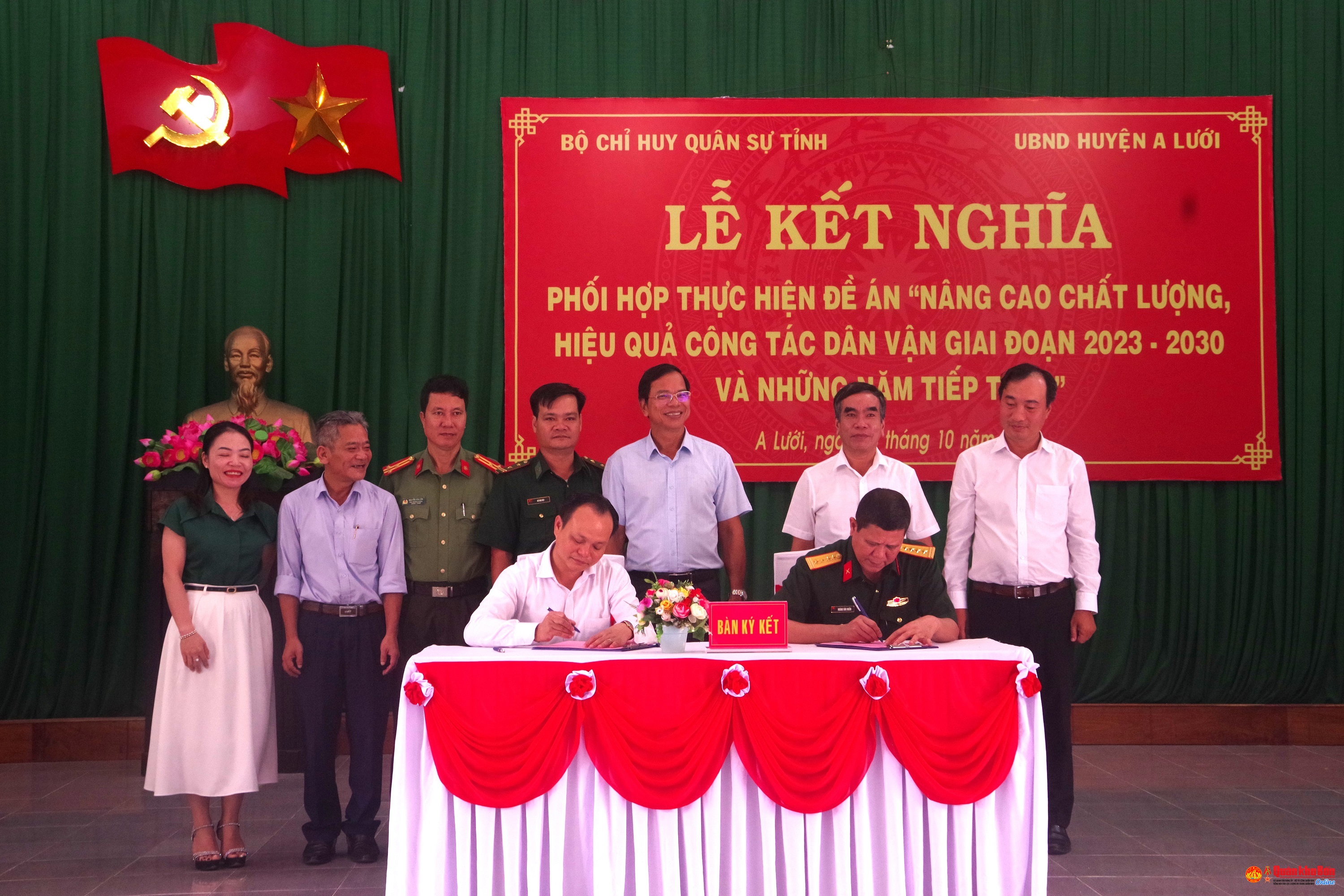 Ngày 05/10/2023, Bộ Chỉ huy Quân sự (CHQS) tỉnh Thừa Thiên Huế đã phối hợp với Ủy ban Nhân dân (UBND) huyện A Lưới tổ chức Lễ kết nghĩa, phối hợp thực hiện Đề án “Nâng cao chất lượng, hiệu quả công tác dân vận giai đoạn 2023 - 2030 và những năm tiếp theo”. Đại tá Hoàng Văn Nhân, Phó Bí thư Đảng ủy Quân sự, Chính ủy Bộ CHQS tỉnh và đồng chí Nguyễn Mạnh Hùng, Phó Bí thư Huyện ủy, Chủ tịch UBND huyện đồng chủ trì buổi Lễ.